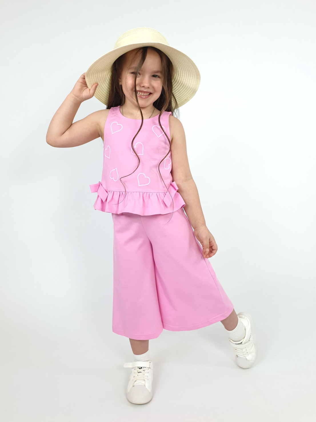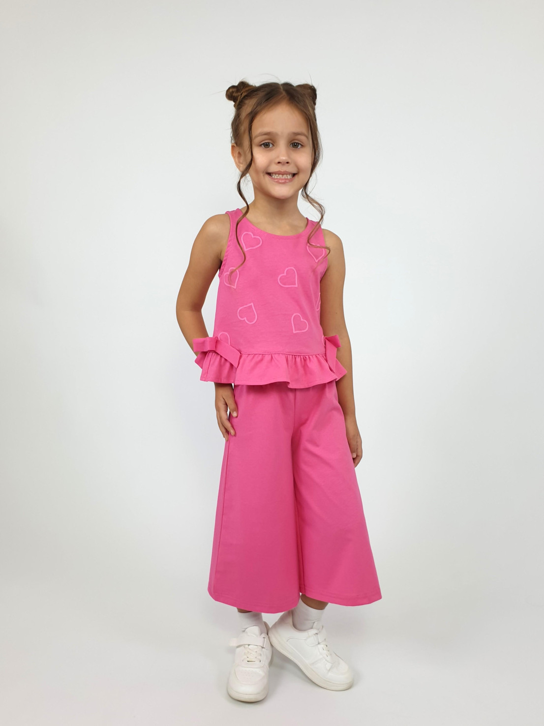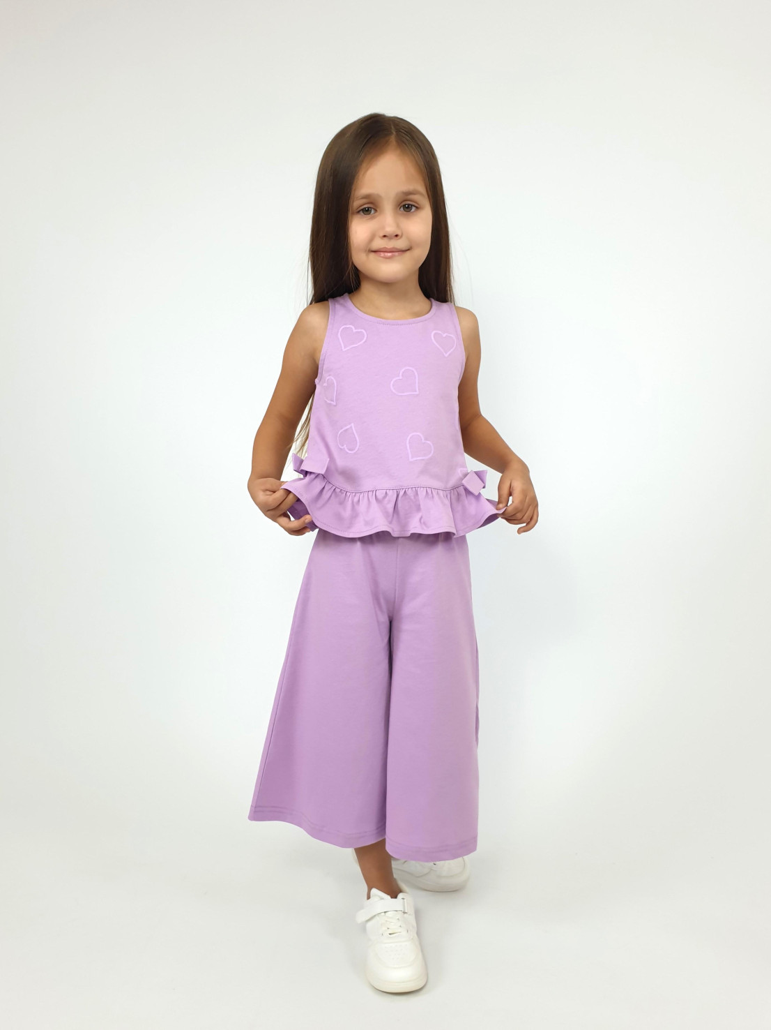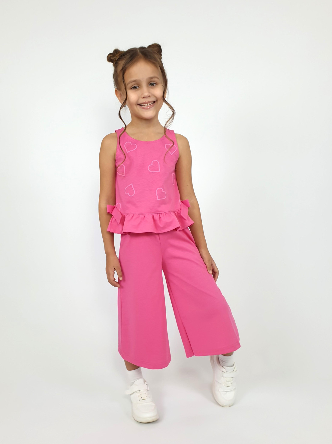 Кулирное полотно:100% х/б. Туника-силуэт трапеция,без рукава,с рюшей внизу.Горловина,пройма окантованы и подшиты.Застежка по спинке на пуговицу.Отделочные бантики внизу на боковом шве.Печать на переде. Брюки-укороченные,расширены к низу,пояс с резинкой.