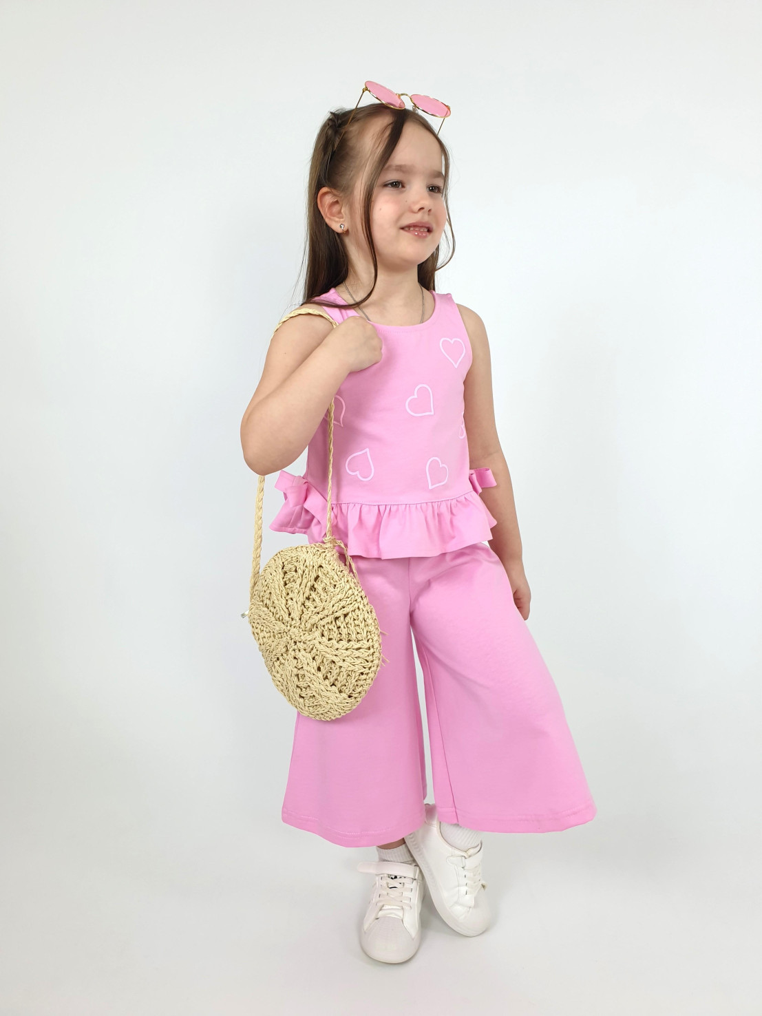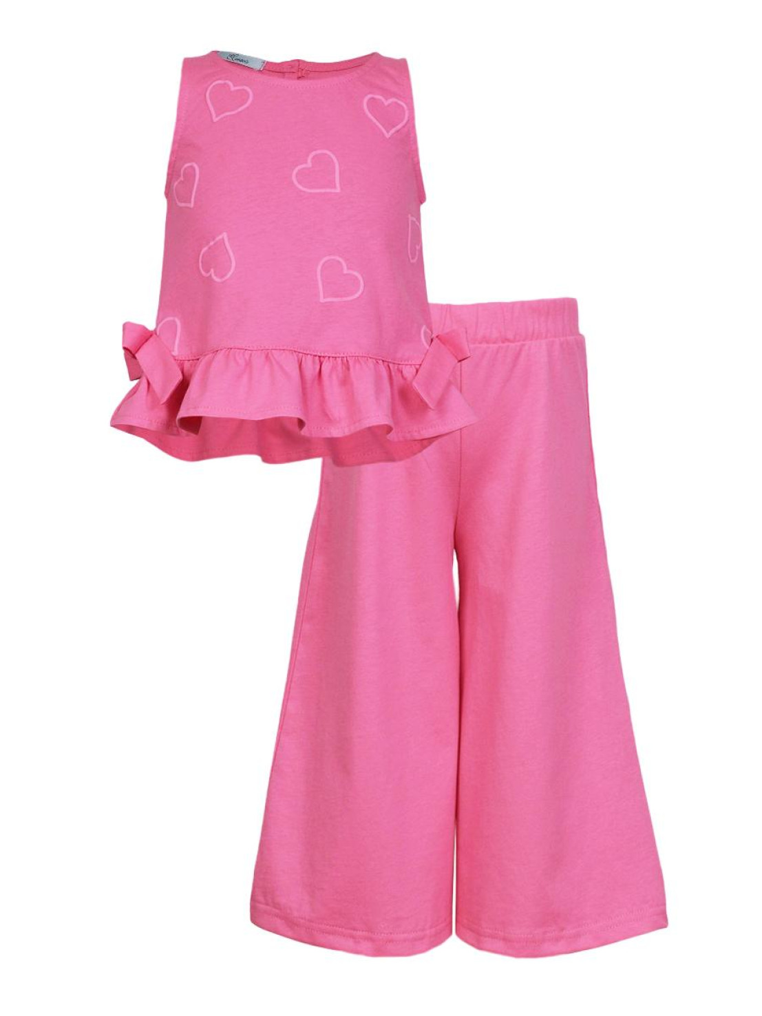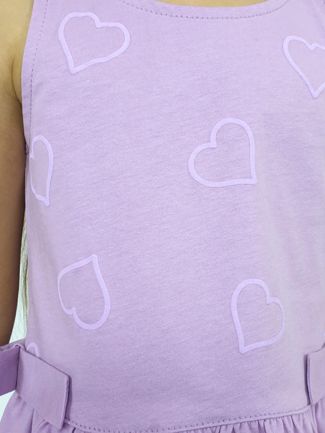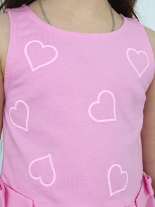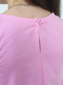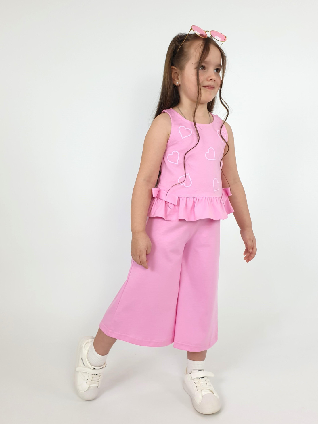 Кулирное полотно:100% х/б. Туника-силуэт трапеция,без рукава,с рюшей внизу.Горловина,пройма окантованы и подшиты.Застежка по спинке на пуговицу.Отделочные бантики внизу на боковом шве.Печать на переде. Брюки-укороченные,расширены к низу,пояс с резинкой.