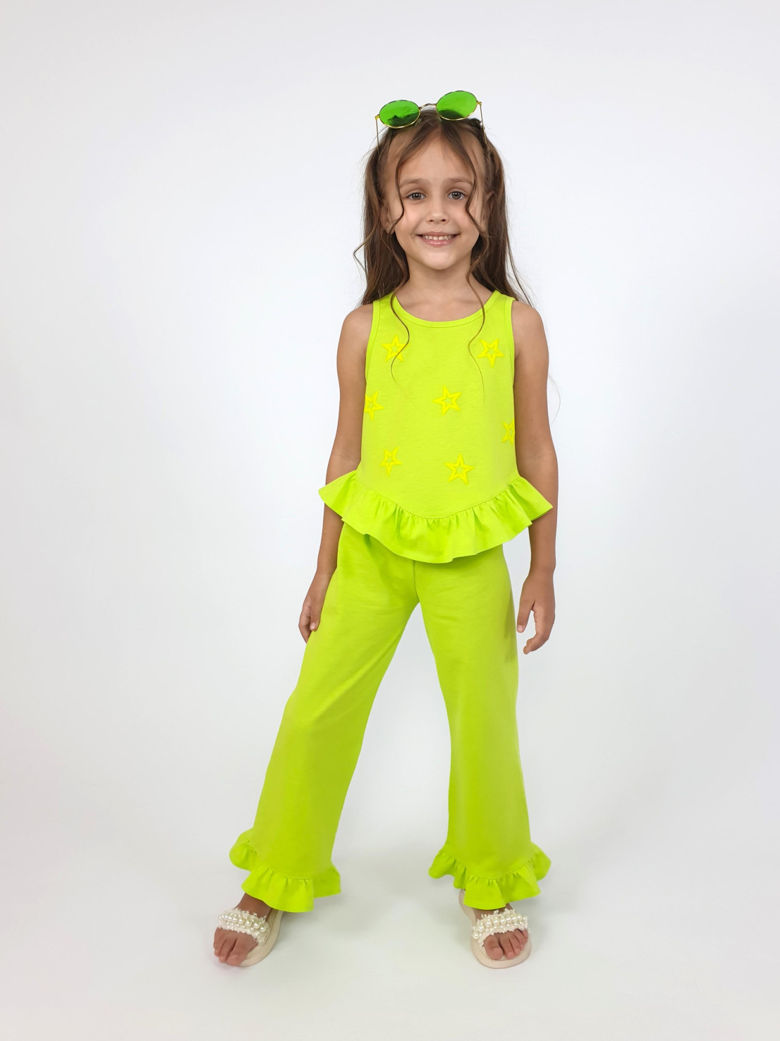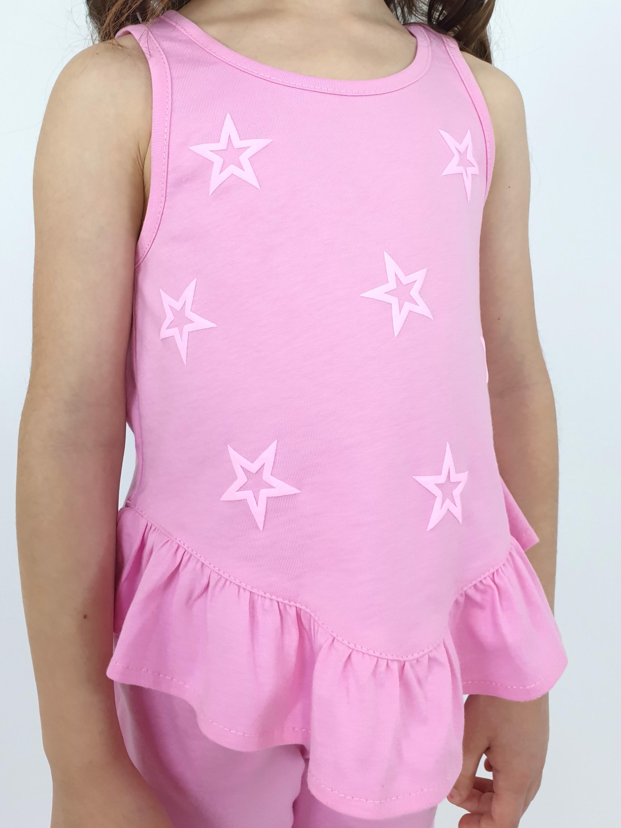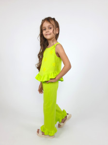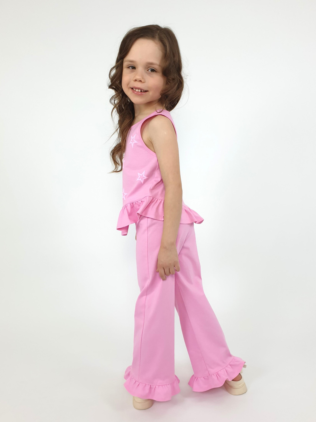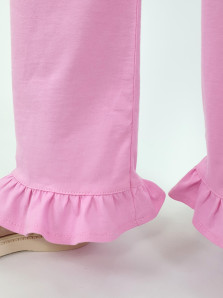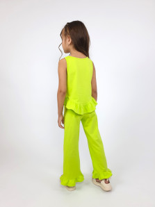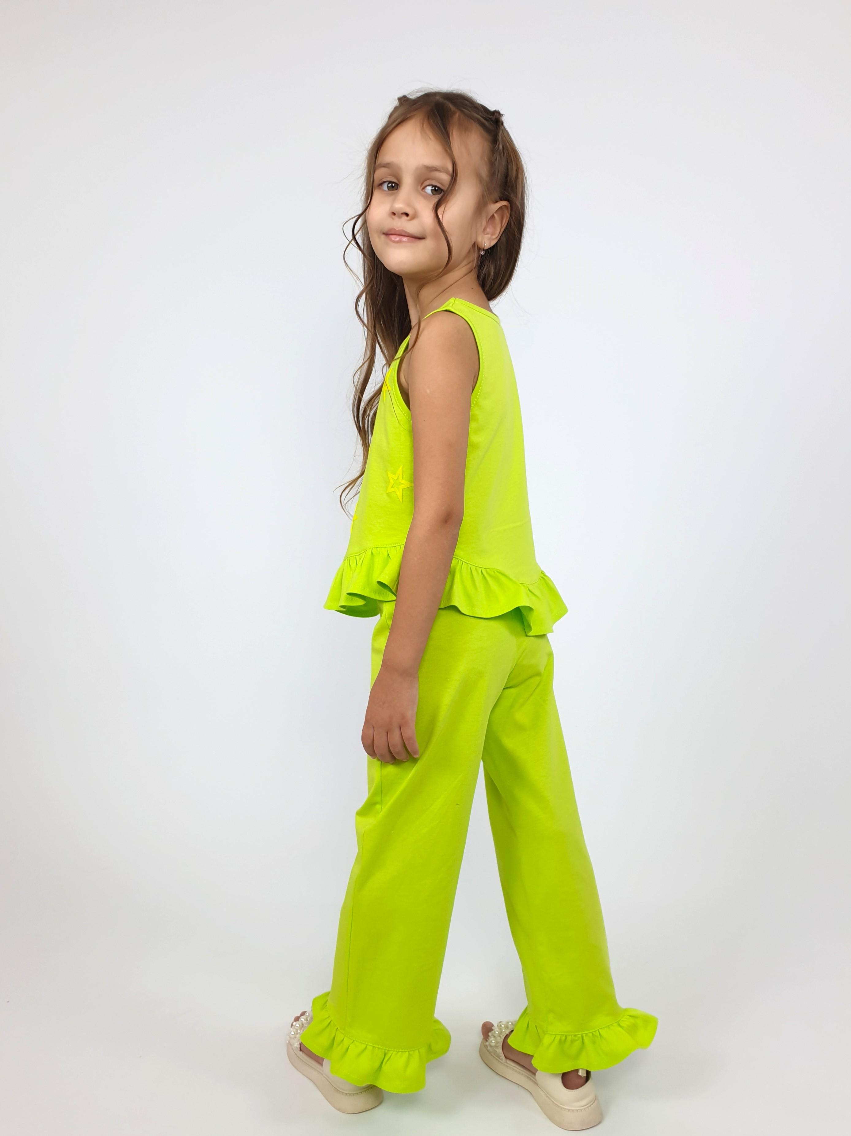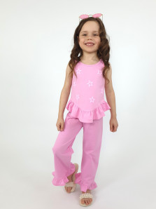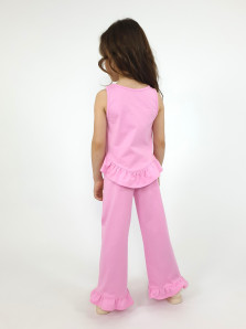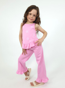 Кулирное полотно:100% х/б. Туника-силуэт трапеция,без рукава,с рюшей внизу.Горловина и пройма окантованы.Печать на переде. Брюки-расширены к низу с рюшей,верх подшит с резинкой.