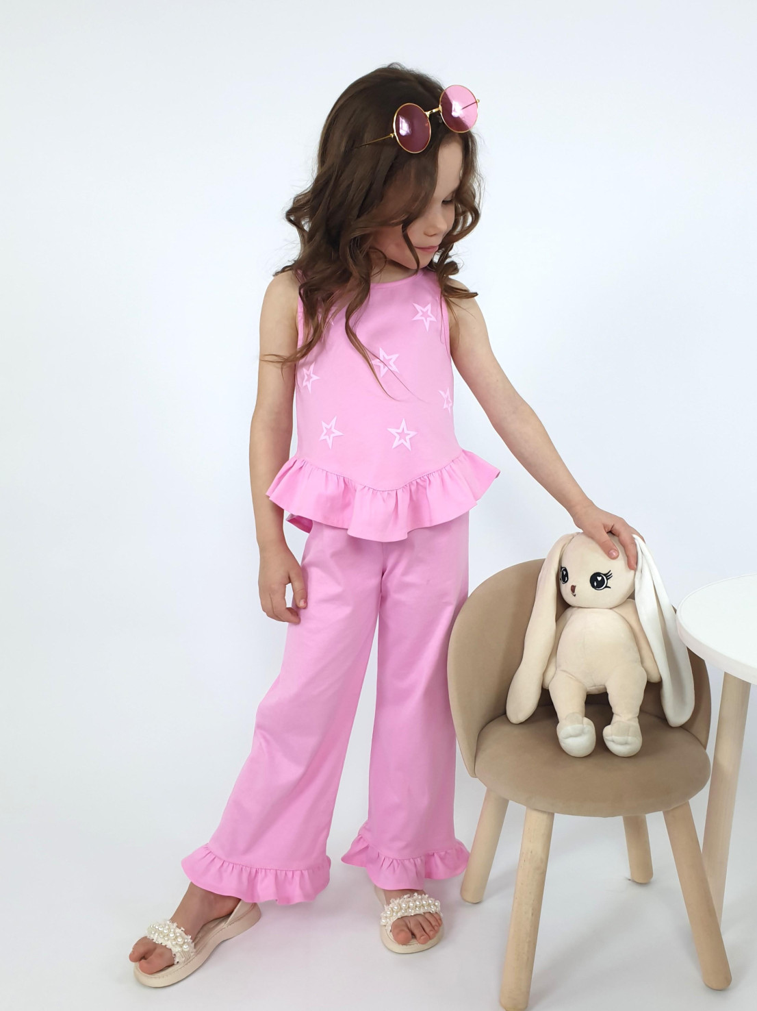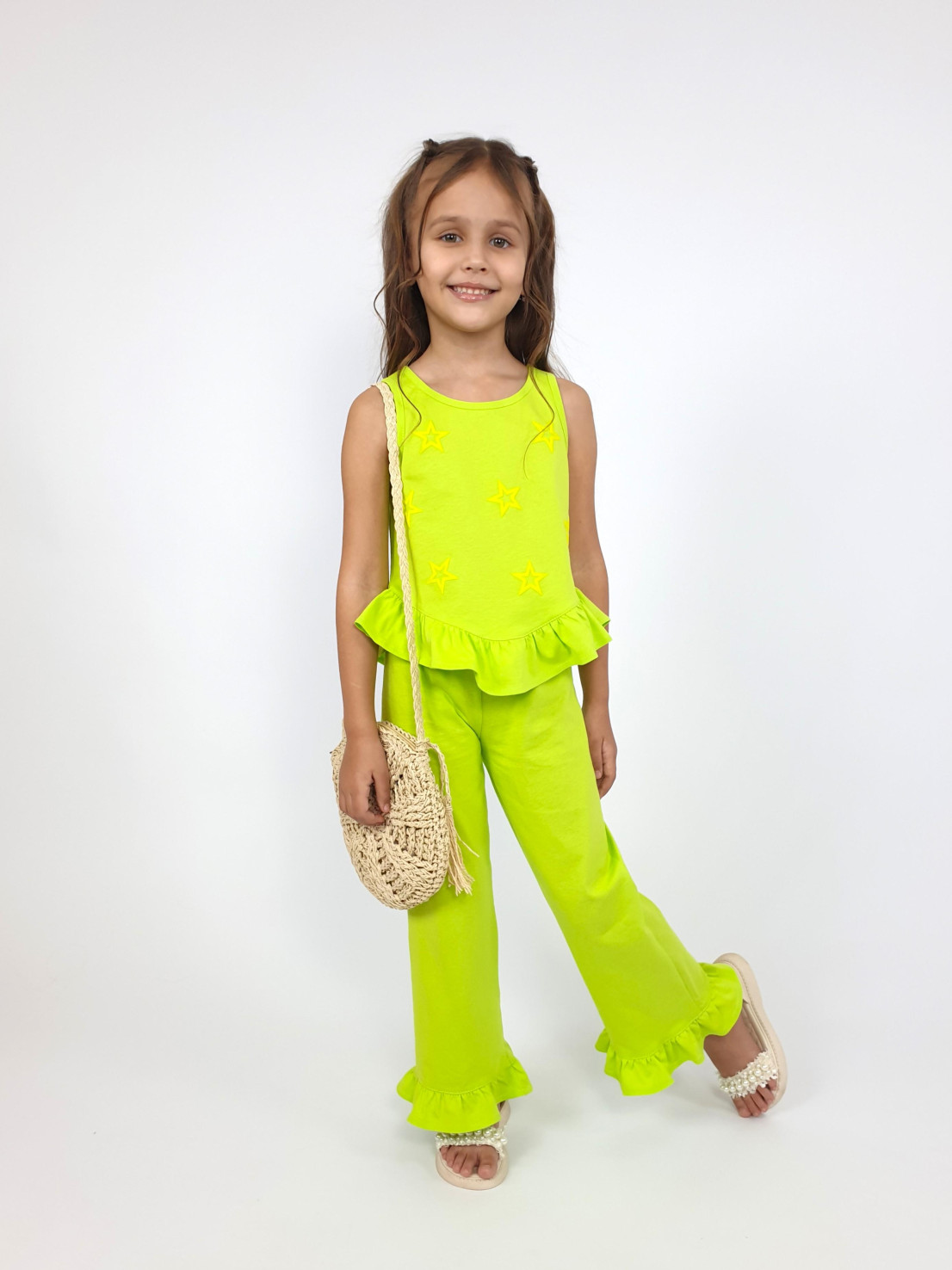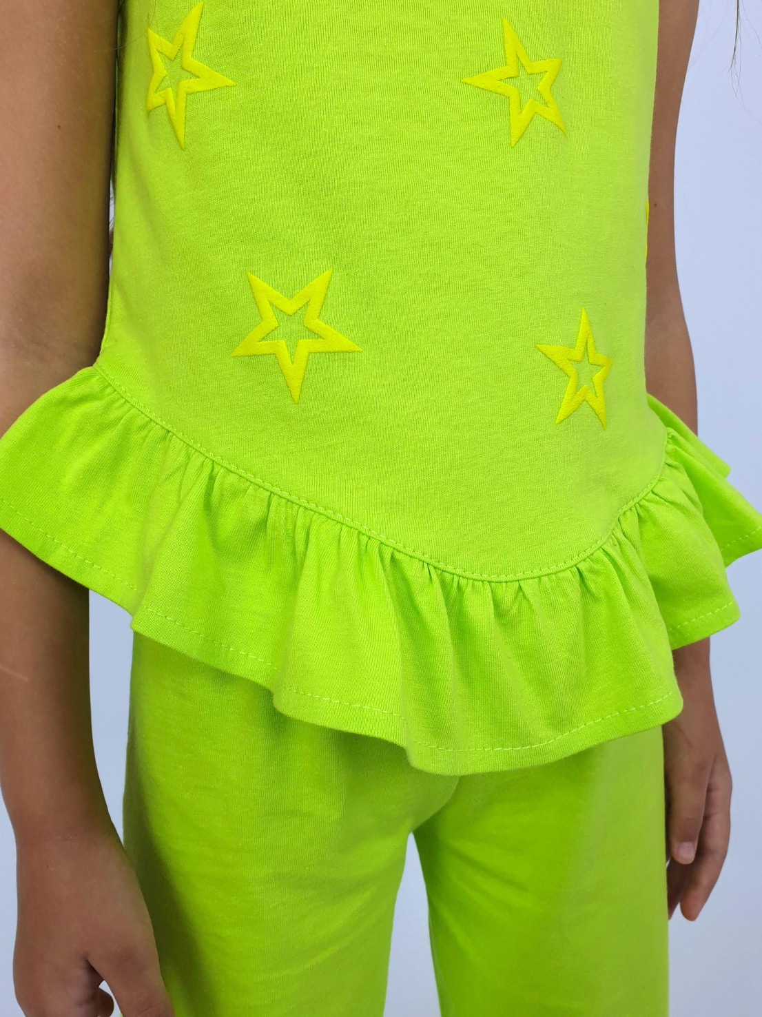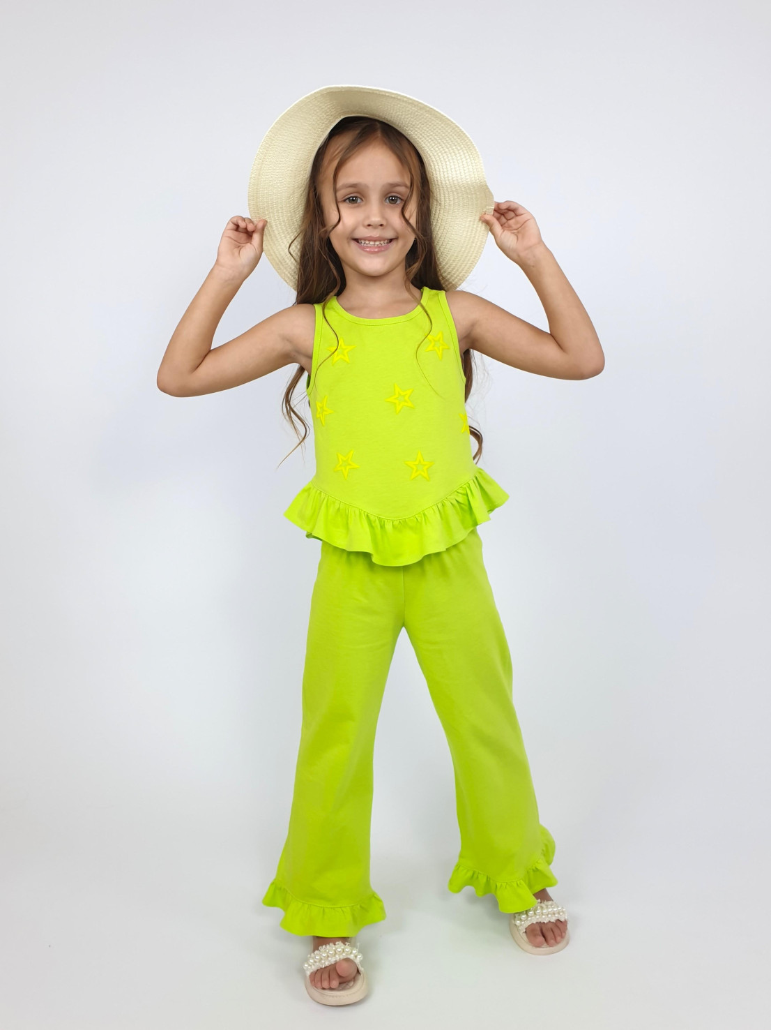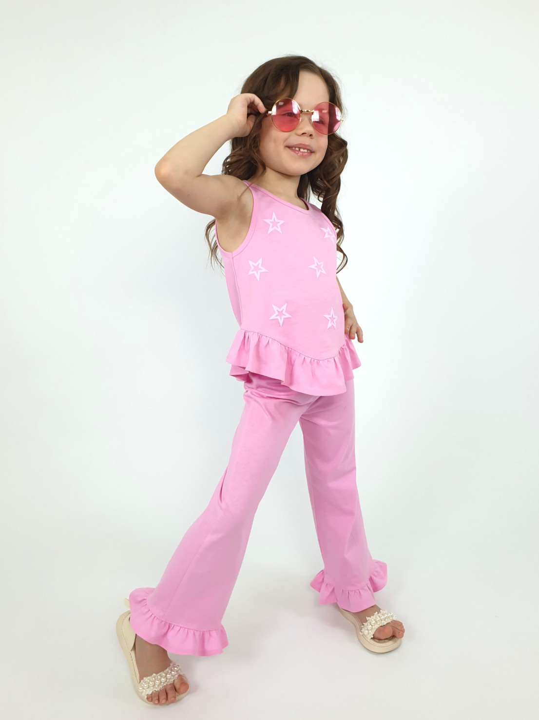 Кулирное полотно:100% х/б. Туника-силуэт трапеция,без рукава,с рюшей внизу.Горловина и пройма окантованы.Печать на переде. Брюки-расширены к низу с рюшей,верх подшит с резинкой.