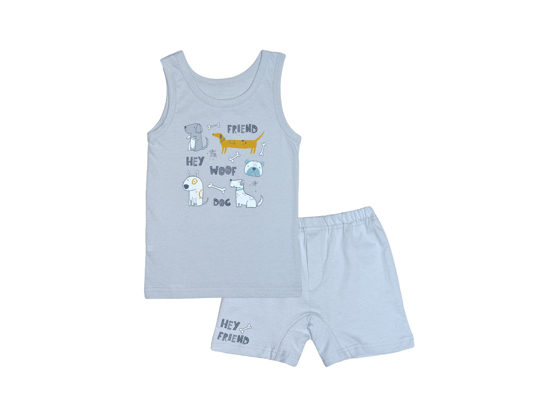 Кулирное полотно: 100% х/б. Майка-прямая,печать на переде,горловина и пройма окантованы. Трусы(боксеры)-на резинке,имитация гульфика,с ластовицей по шаговому шву.Печать на переде справа,внизу.