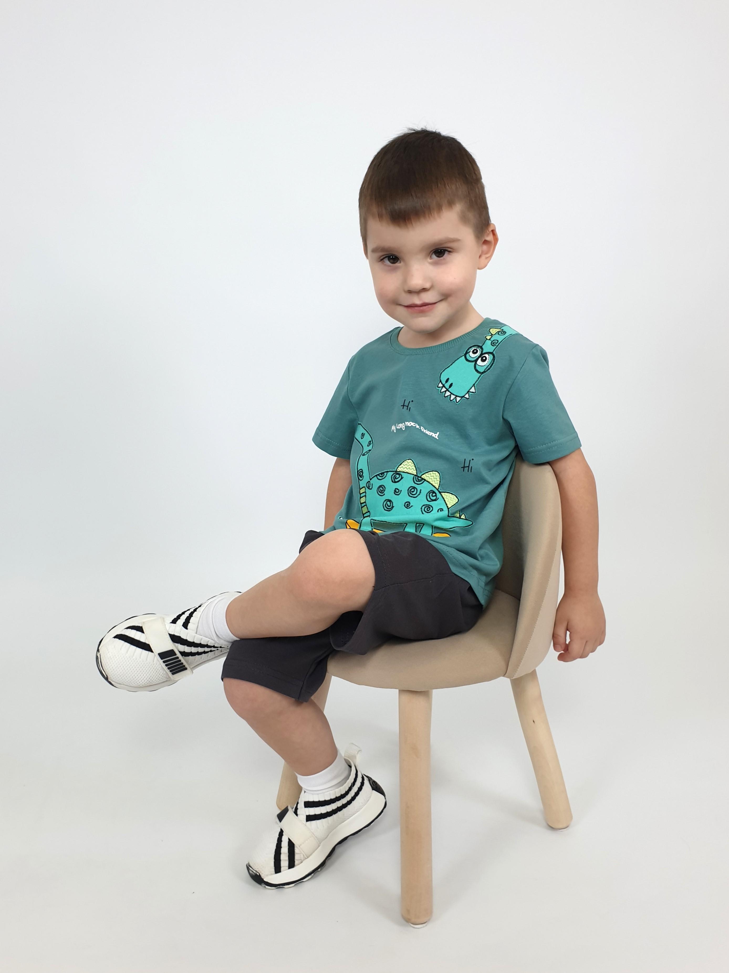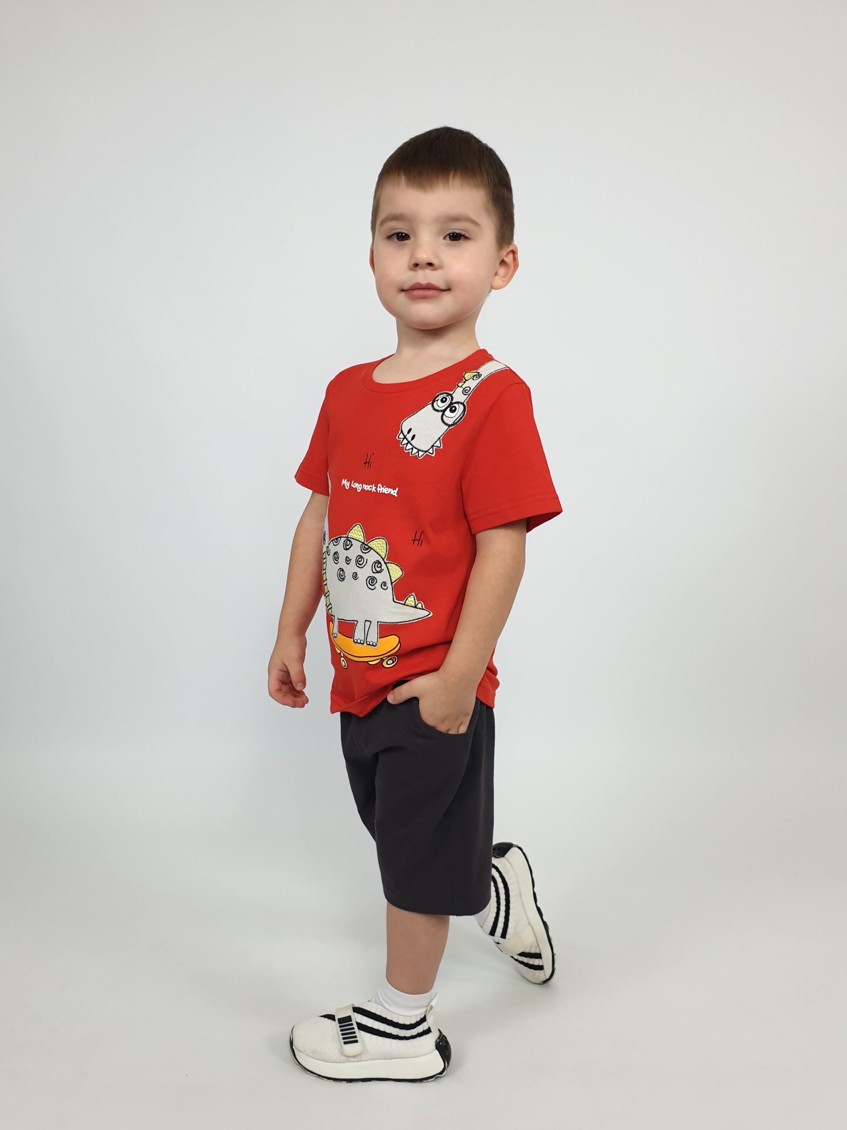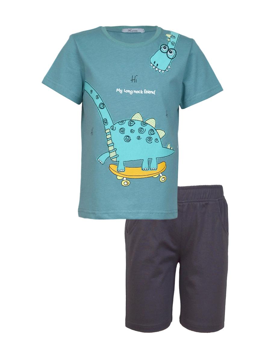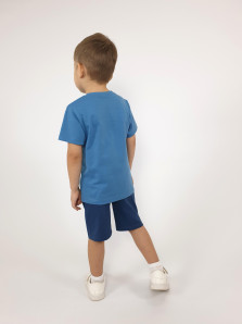 Кулирное полотно: 100% х/б. Фуфайка-прямая,перед с печатью и вышивкой.Рукав втачной,короткий.Горловина обработана ластиком. Шорты-укороченные с притачным поясом и резинкой.Два боковых кармана.