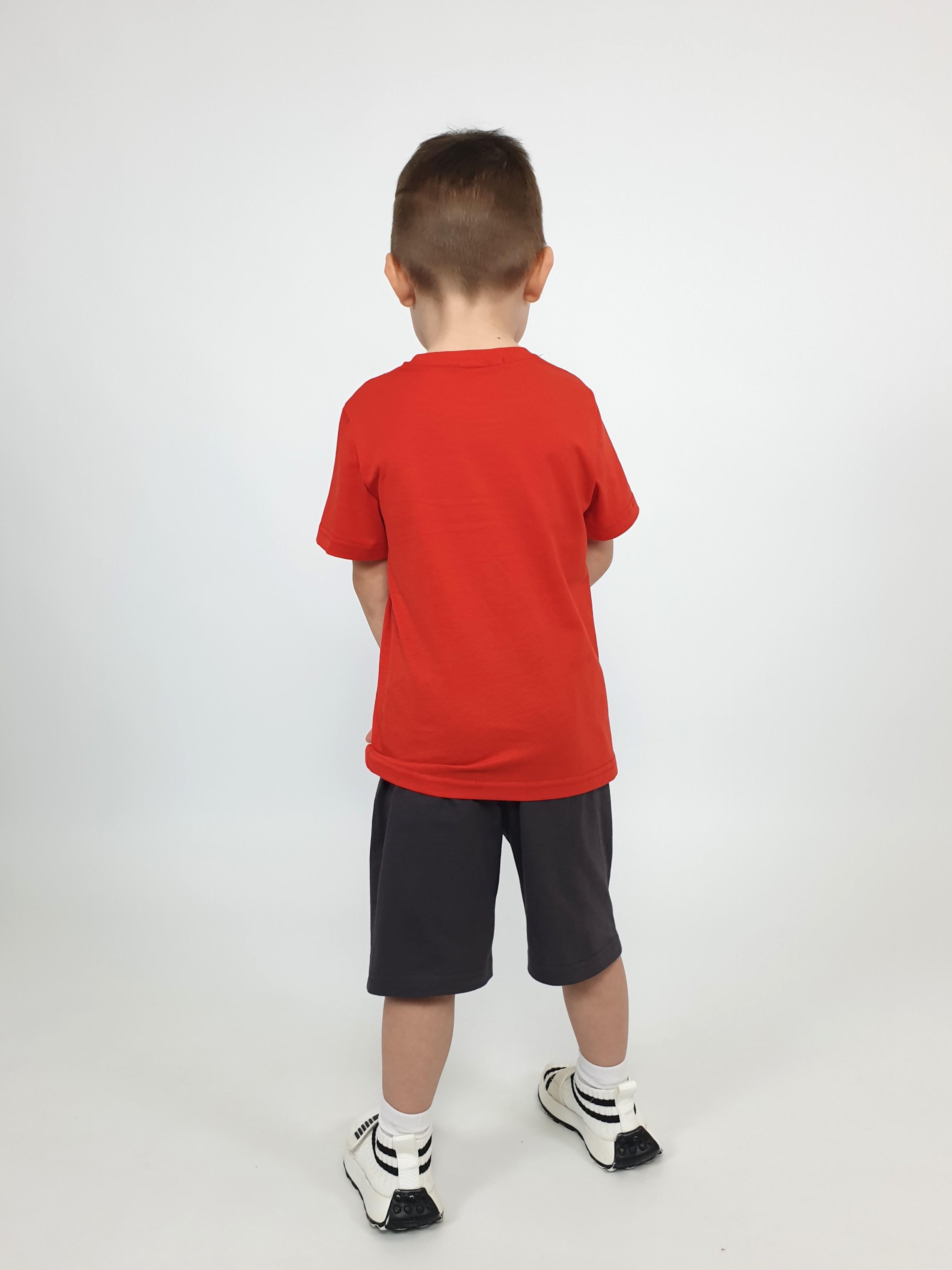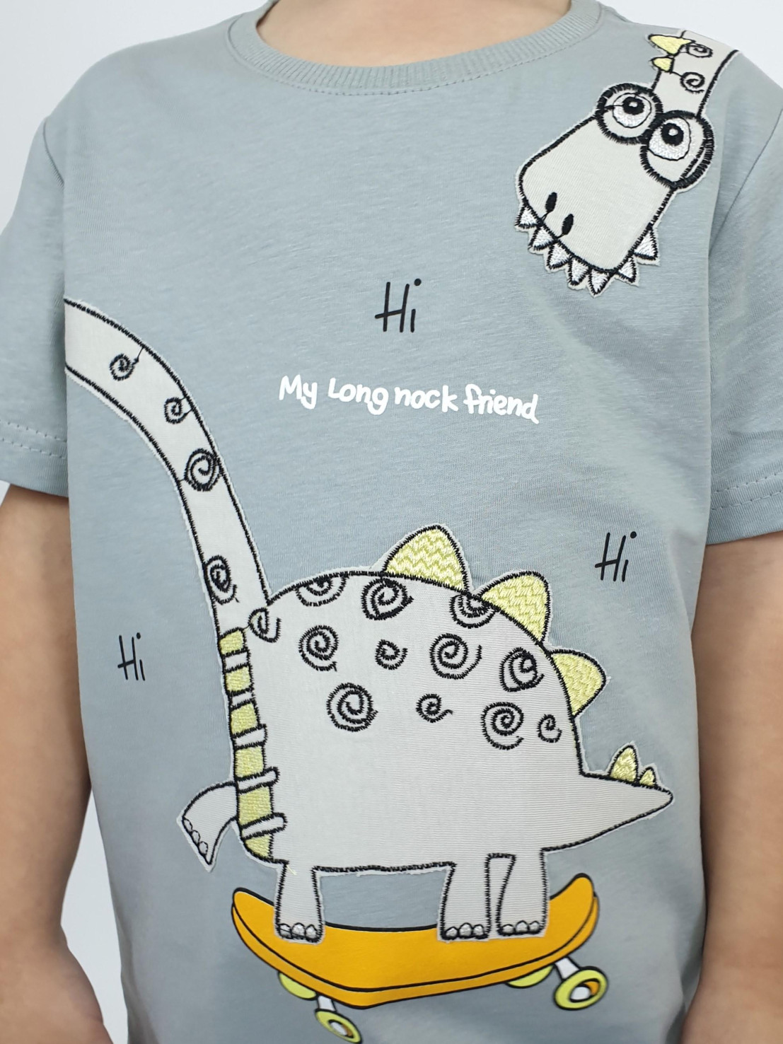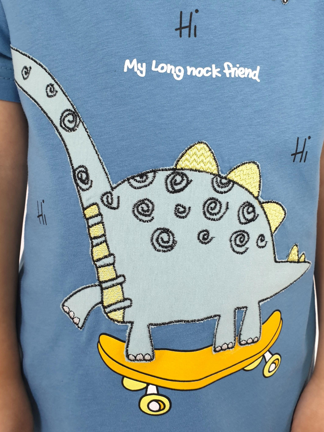 Кулирное полотно: 100% х/б. Фуфайка-прямая,перед с печатью и вышивкой.Рукав втачной,короткий.Горловина обработана ластиком. Шорты-укороченные с притачным поясом и резинкой.Два боковых кармана.