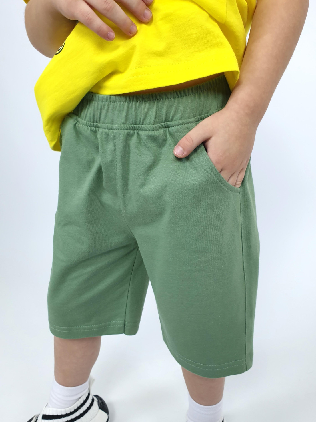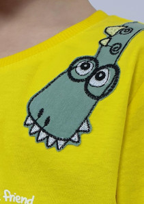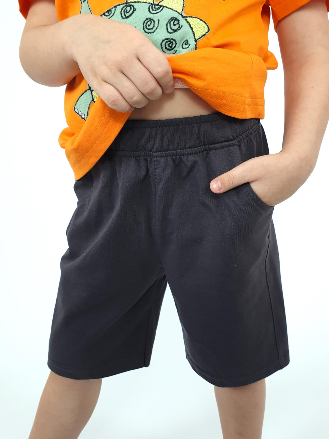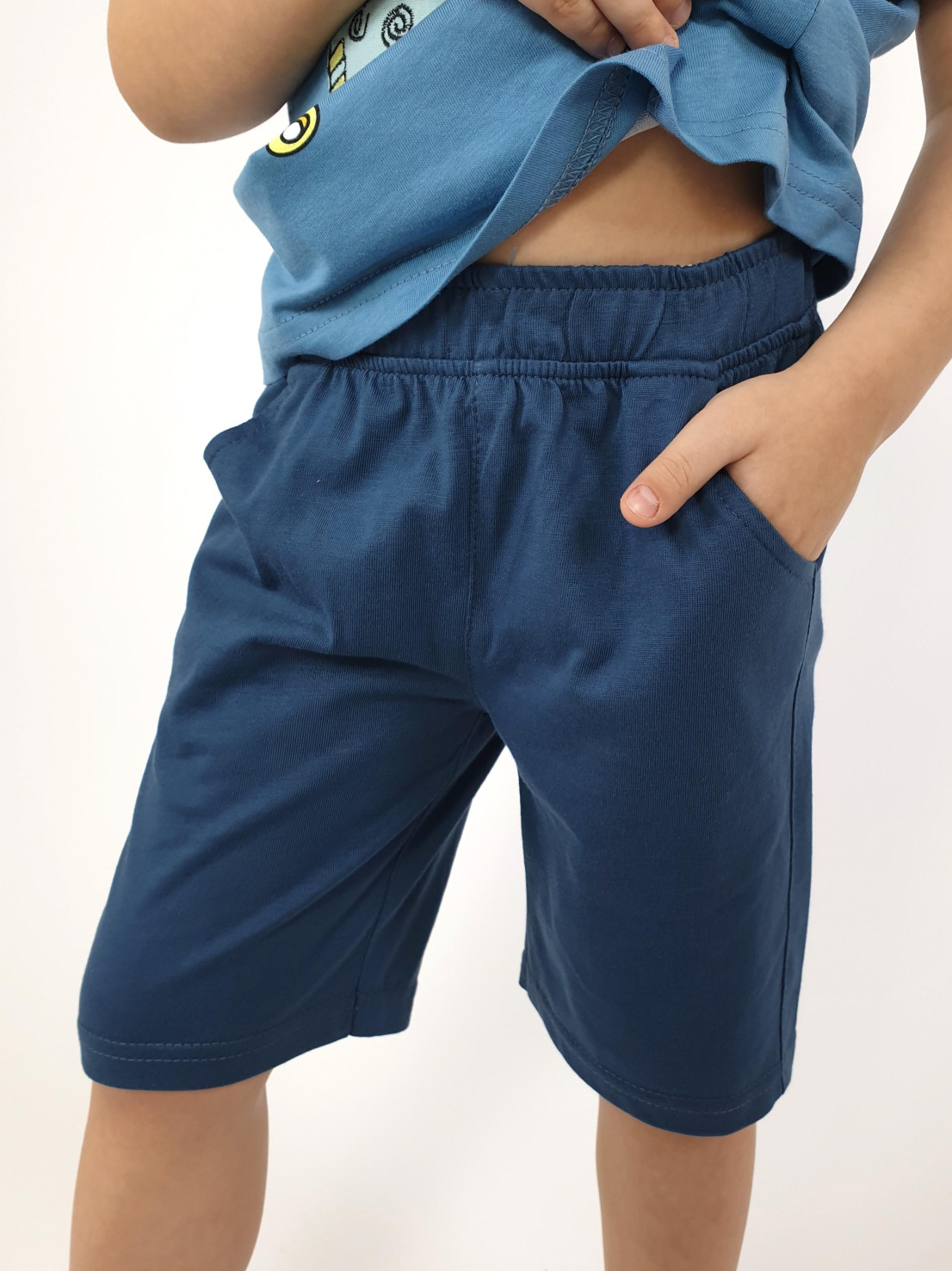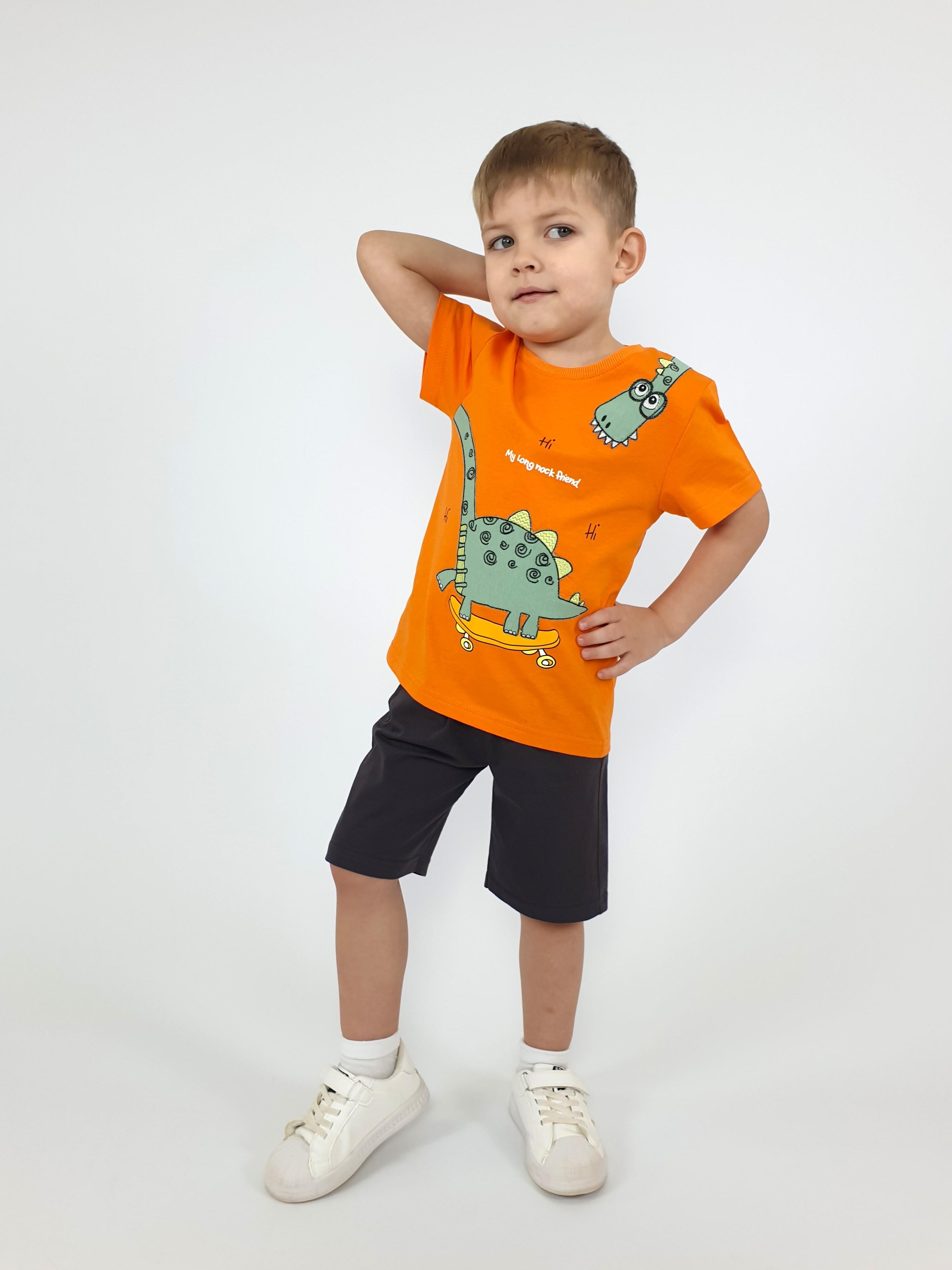 Кулирное полотно: 100% х/б. Фуфайка-прямая,перед с печатью и вышивкой.Рукав втачной,короткий.Горловина обработана ластиком. Шорты-укороченные с притачным поясом и резинкой.Два боковых кармана.