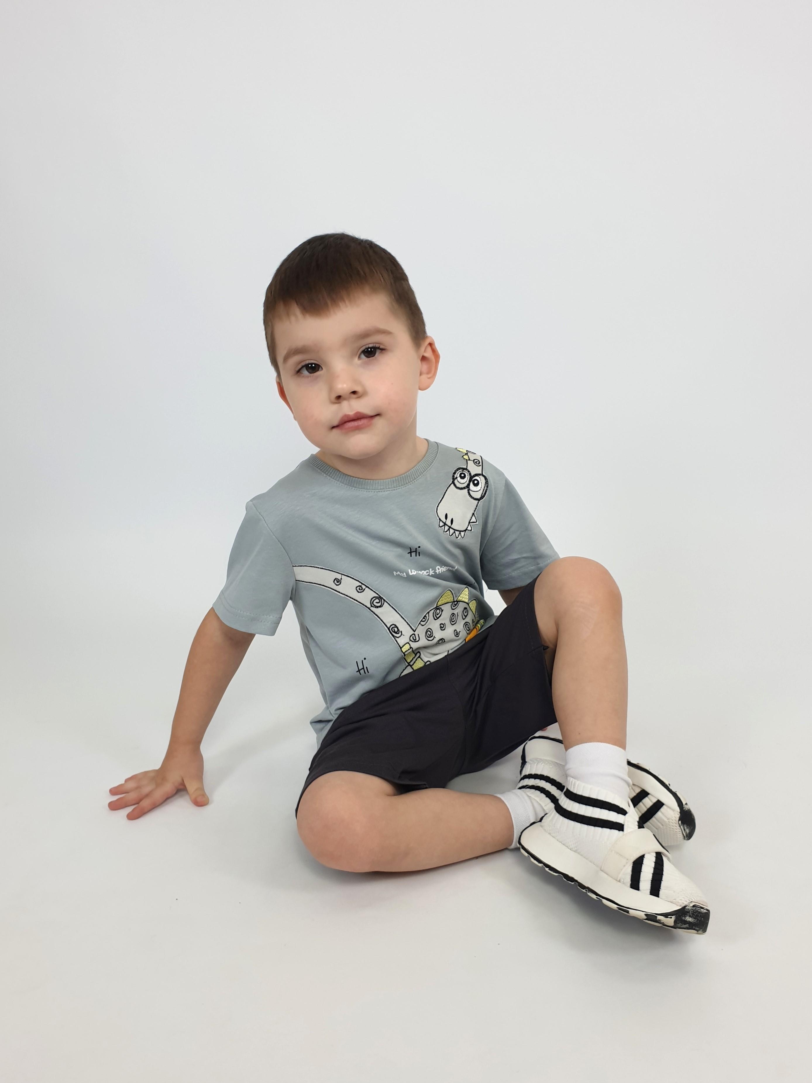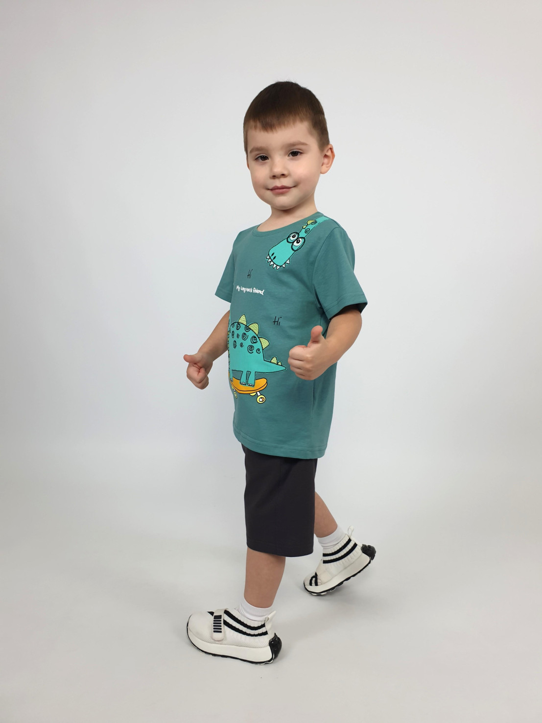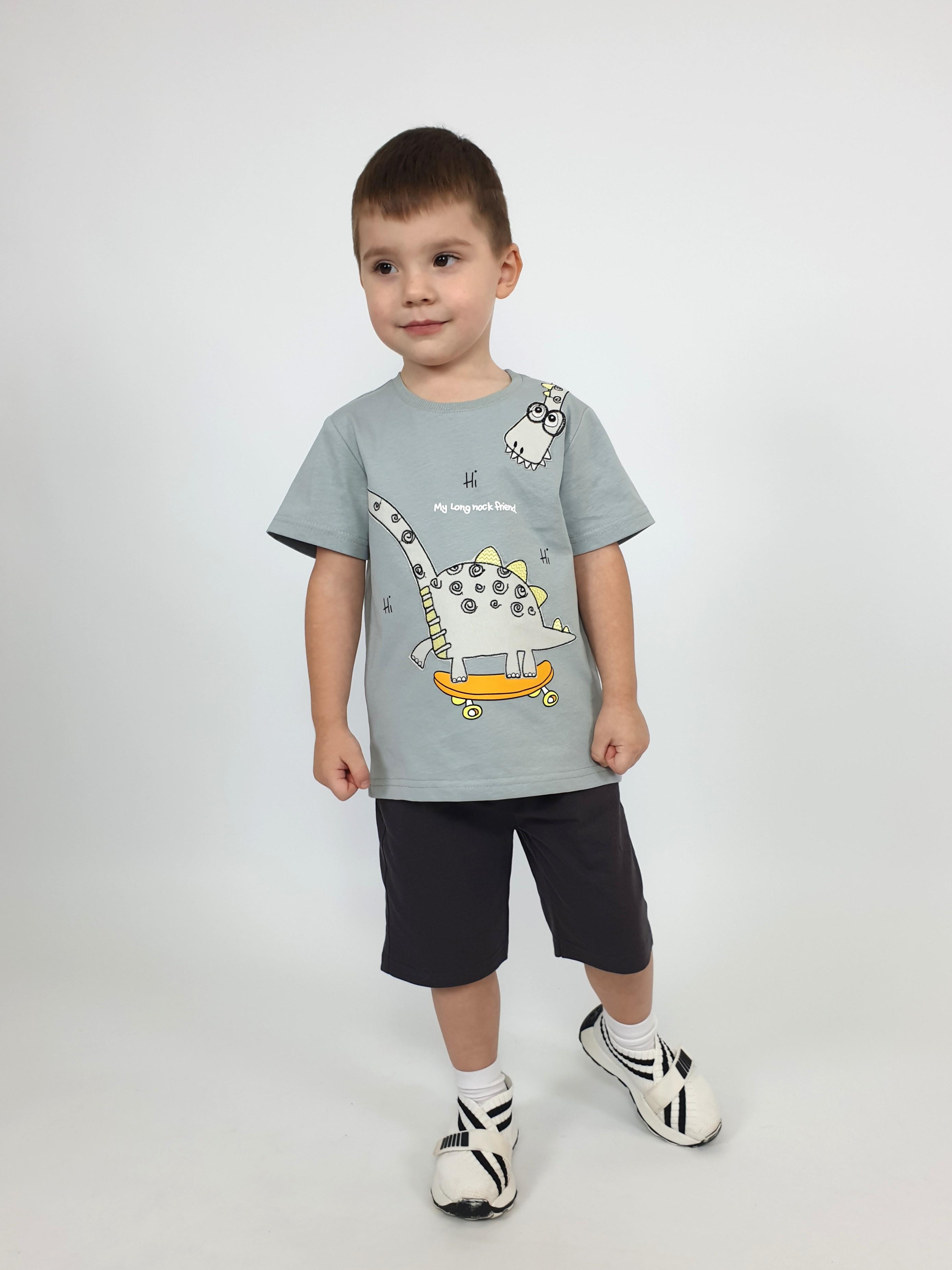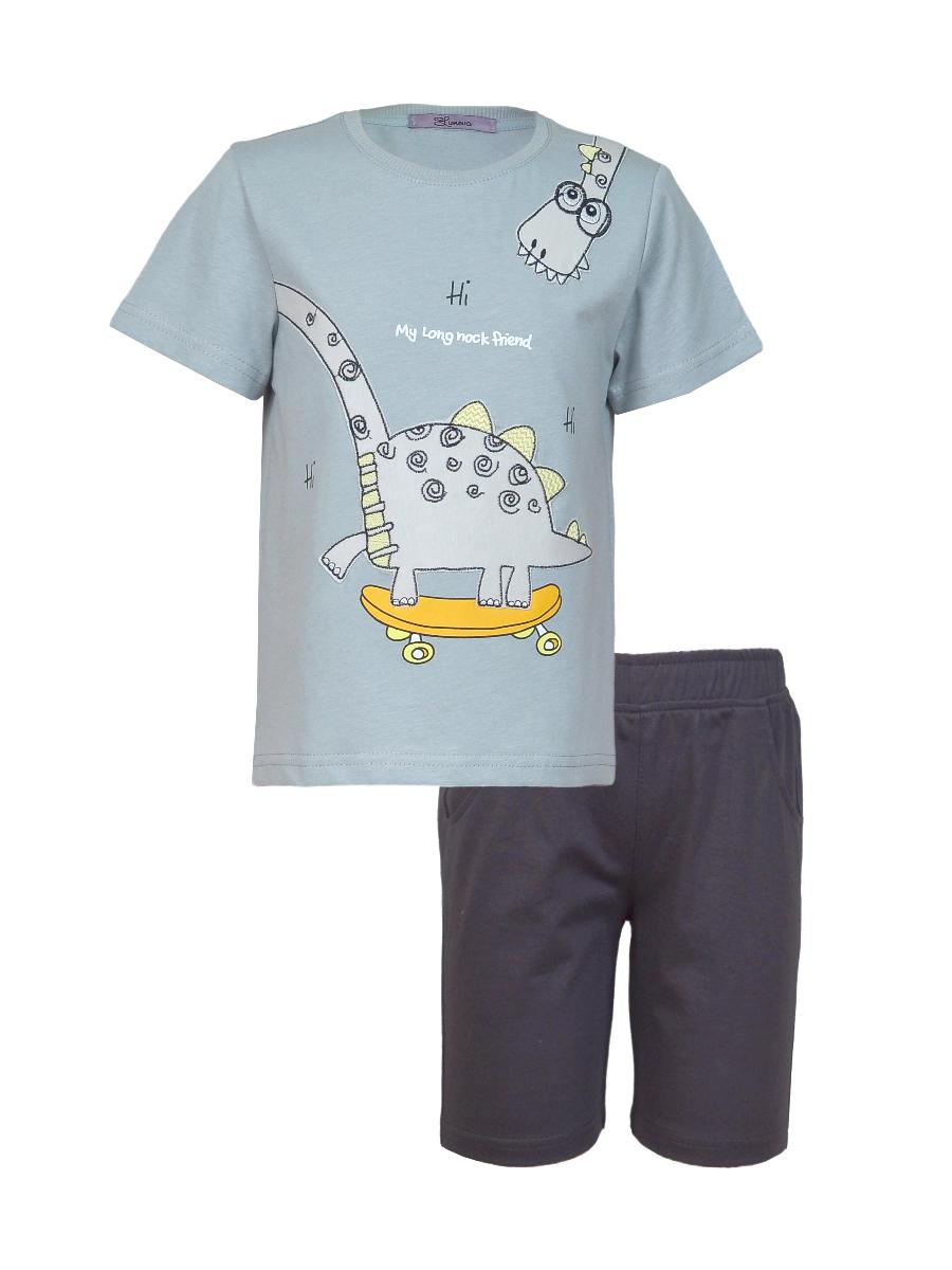 Кулирное полотно: 100% х/б. Фуфайка-прямая,перед с печатью и вышивкой.Рукав втачной,короткий.Горловина обработана ластиком. Шорты-укороченные с притачным поясом и резинкой.Два боковых кармана.