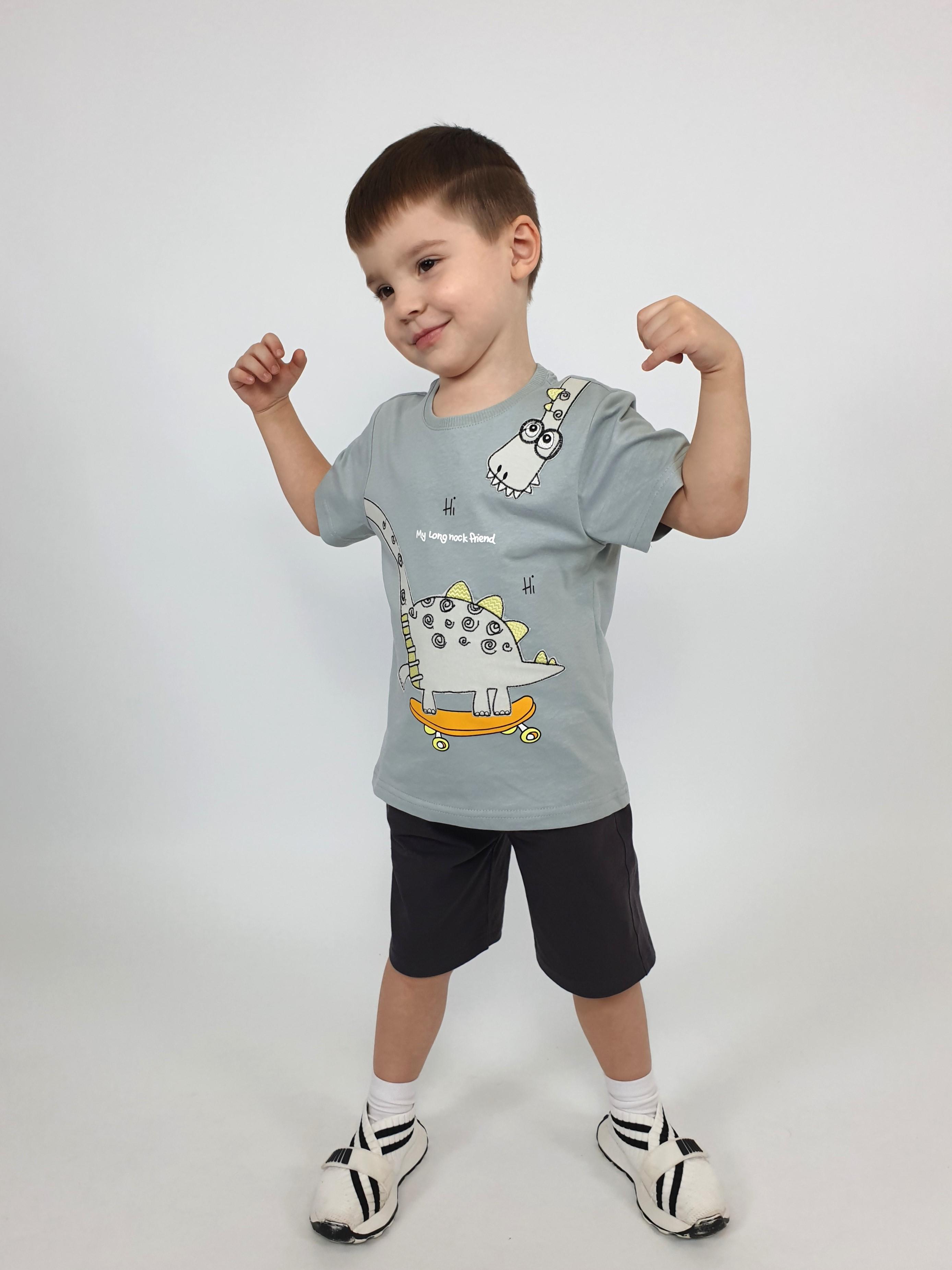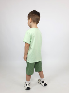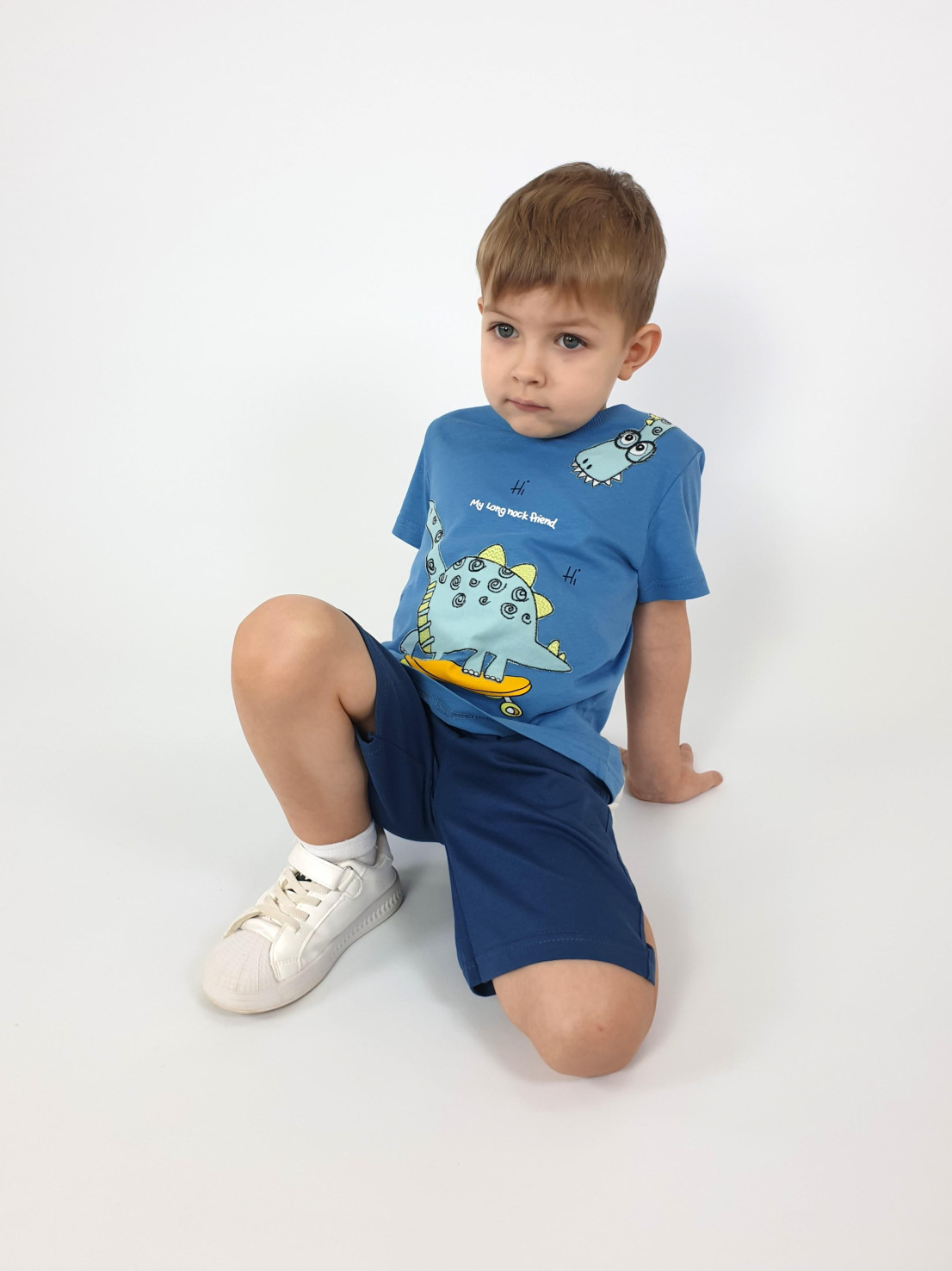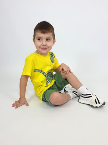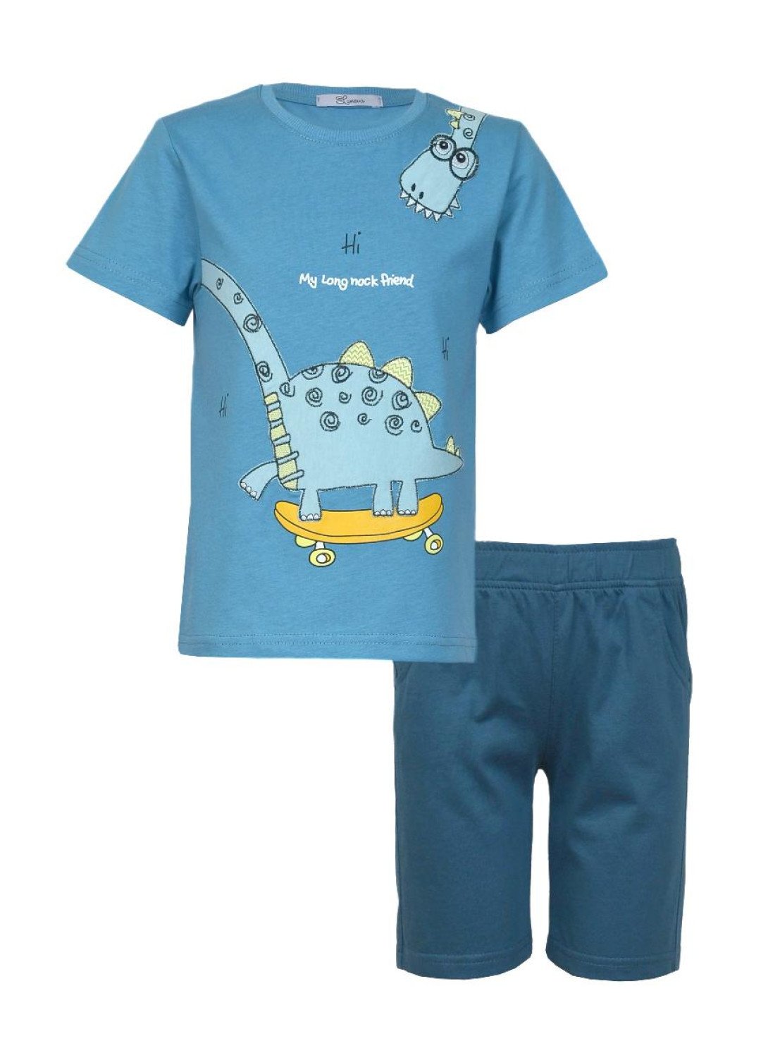 Кулирное полотно: 100% х/б. Фуфайка-прямая,перед с печатью и вышивкой.Рукав втачной,короткий.Горловина обработана ластиком. Шорты-укороченные с притачным поясом и резинкой.Два боковых кармана.