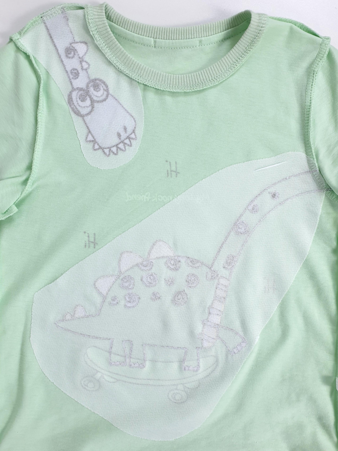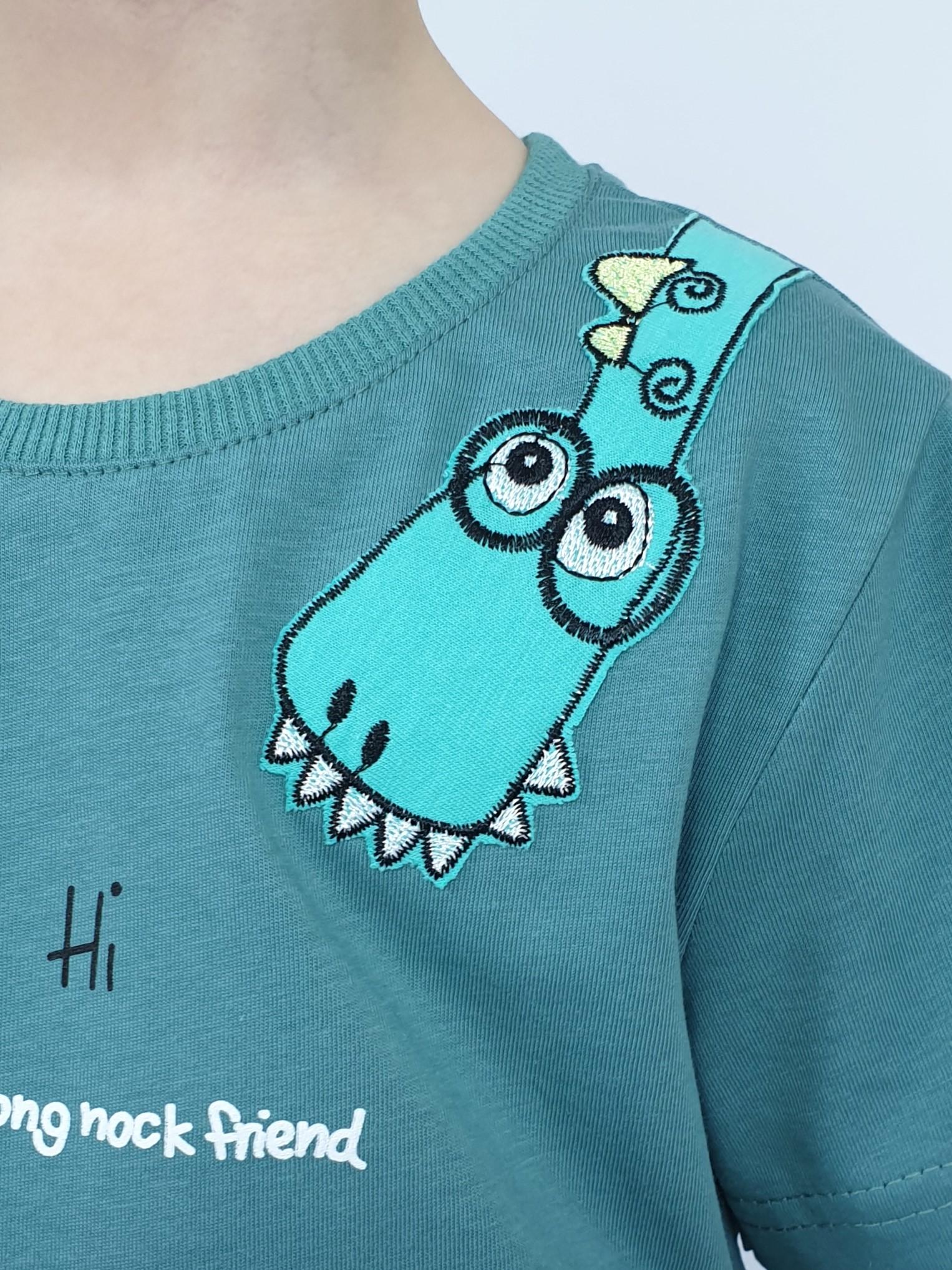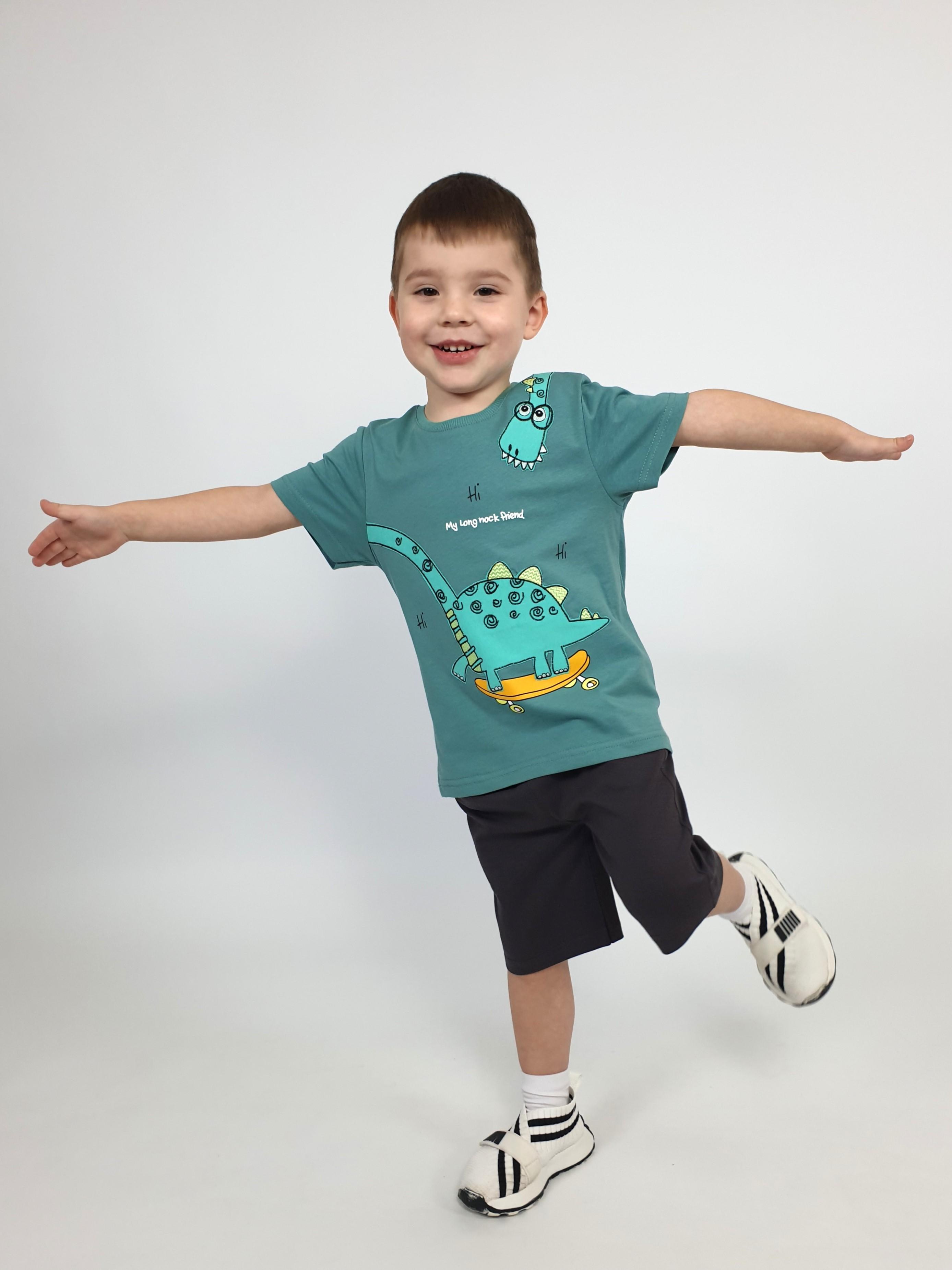 Кулирное полотно: 100% х/б. Фуфайка-прямая,перед с печатью и вышивкой.Рукав втачной,короткий.Горловина обработана ластиком. Шорты-укороченные с притачным поясом и резинкой.Два боковых кармана.