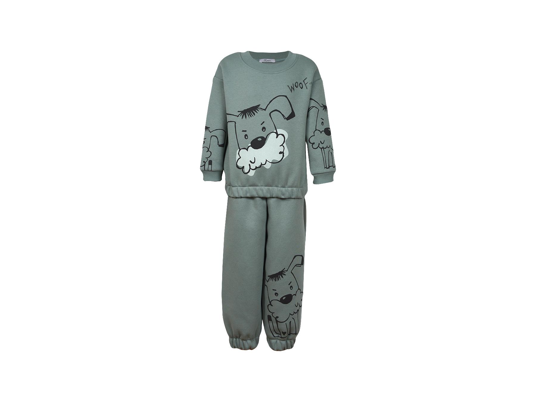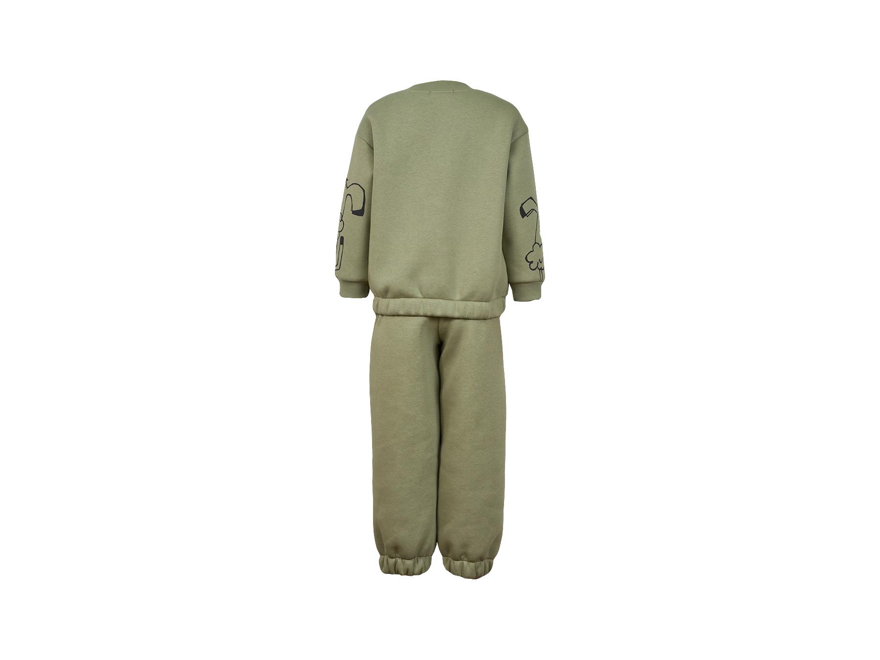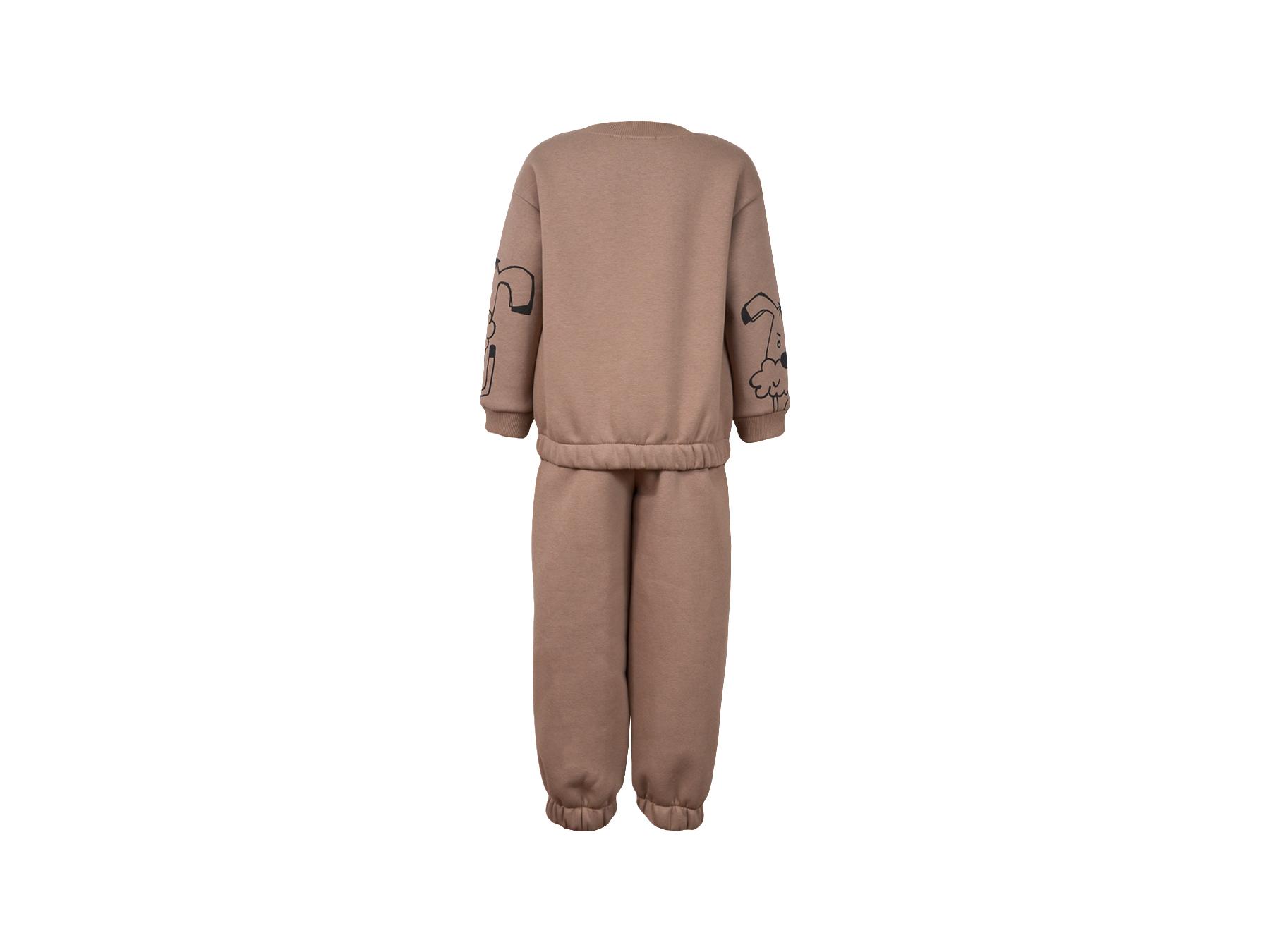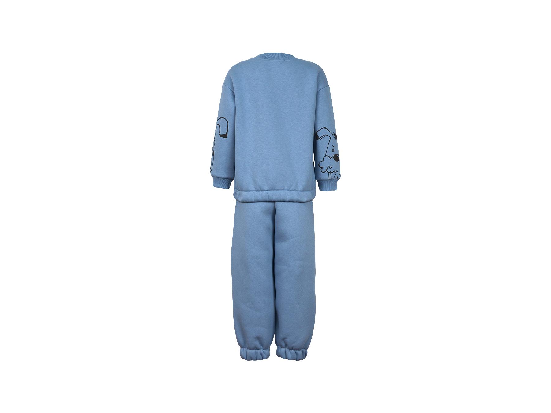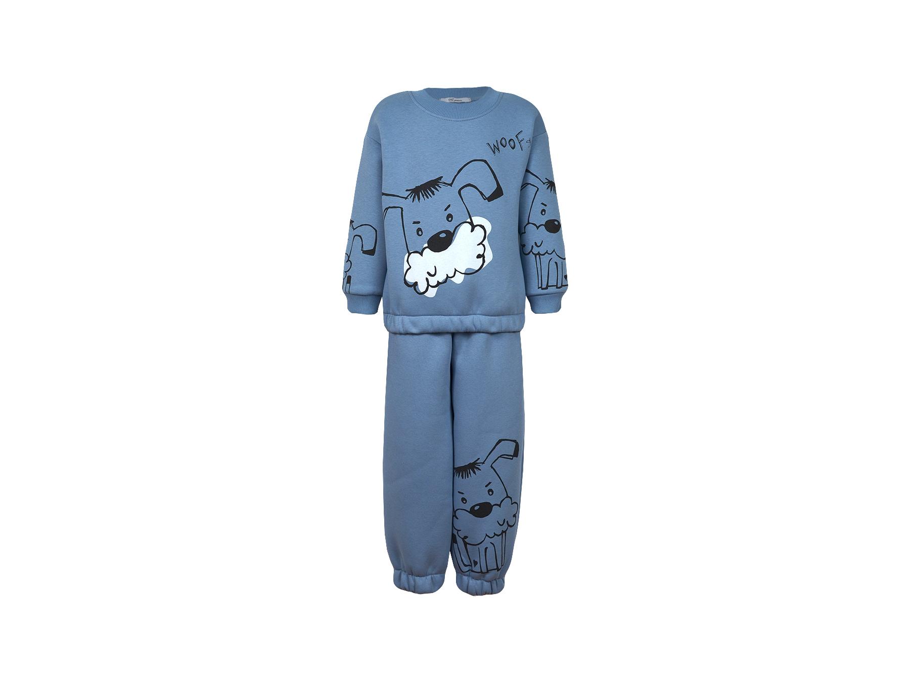 Футер трех-нитка: 70% х/б,30% п/э. Джемпер-прямого силуэта,спущенное плечо.Рукав на манжете из ластика.Низ изделия на резинке.В горловине стойка из ластика.Печать на переде и рукавах. Брюки-длинные,внизу на резинке.Вверху притачной пояс из ластика с резинкой.На передней левой половинке печать внизу.