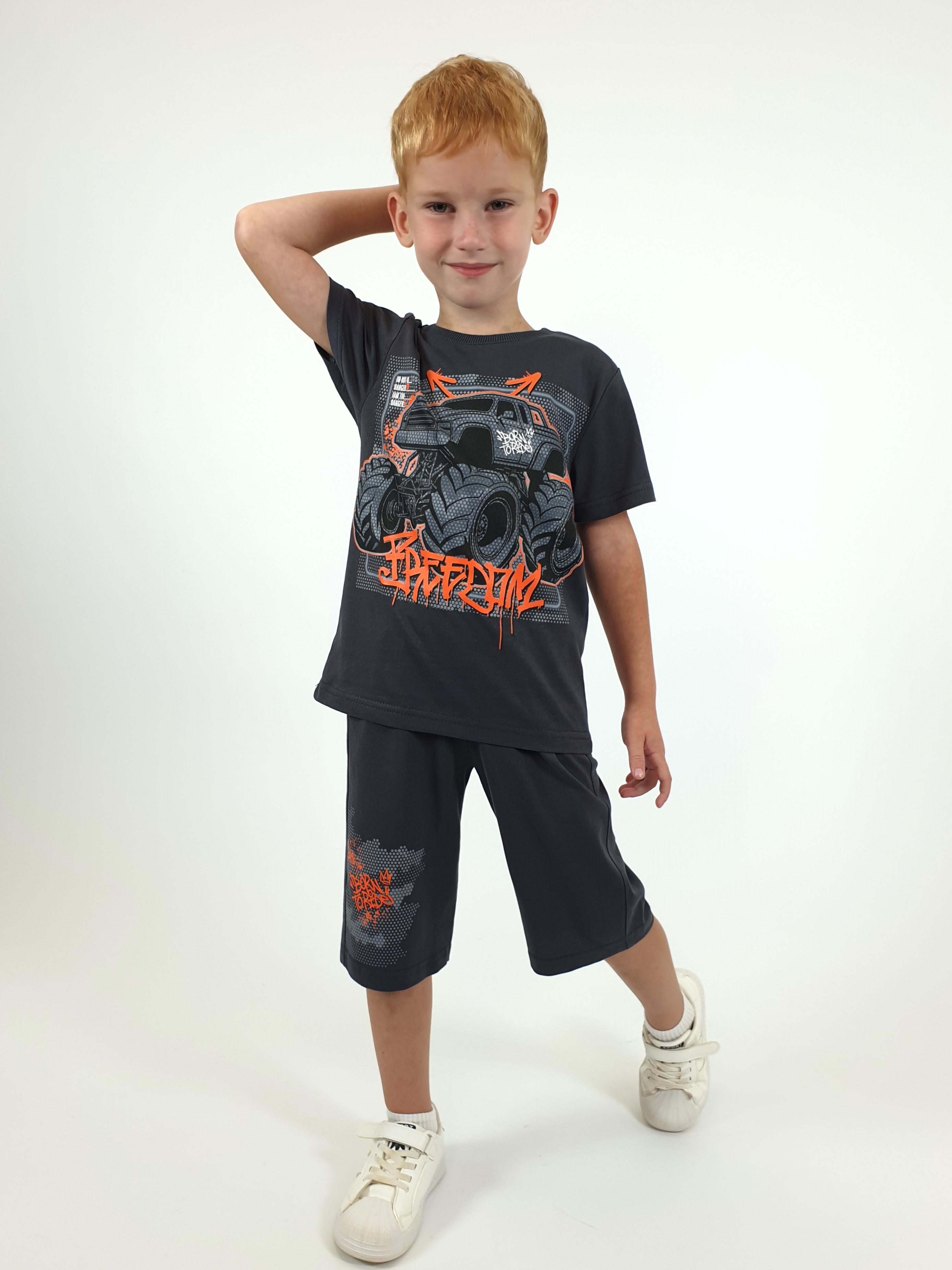 Кулирное полотно: 100% х/б. Джемпер-прямой,короткий втачной рукав,перед с печатью.Горловина обработана ластиком. Шорты-удлиненные с притачным поясом и резинкой,печать на передней правой половинке.