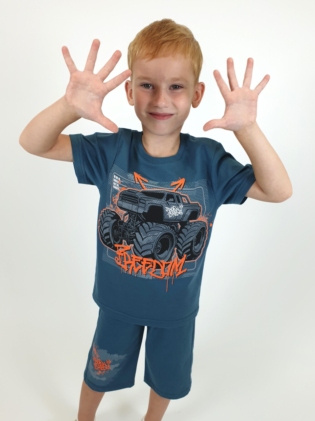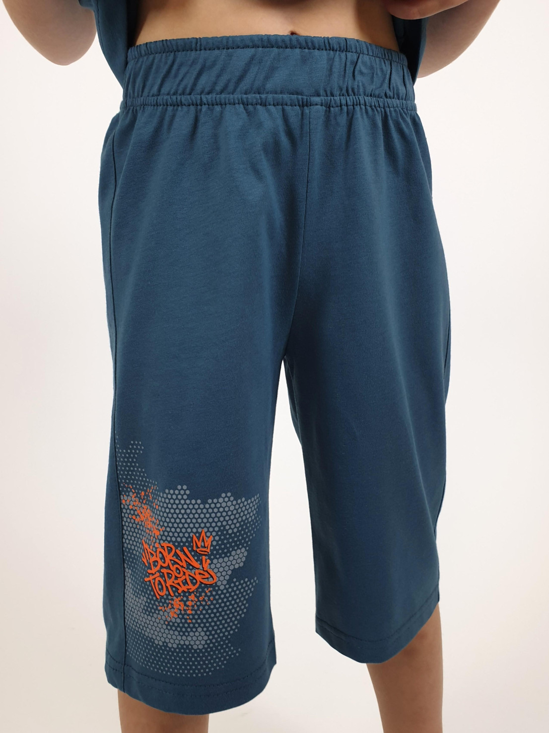 Кулирное полотно: 100% х/б. Джемпер-прямой,короткий втачной рукав,перед с печатью.Горловина обработана ластиком. Шорты-удлиненные с притачным поясом и резинкой,печать на передней правой половинке.