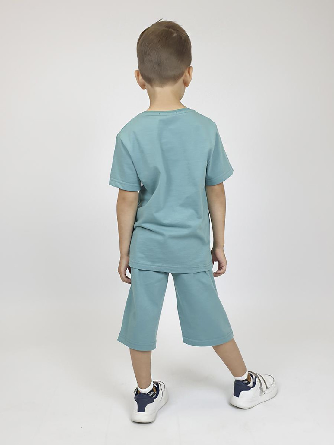 Кулирное полотно: 100% х/б. Джемпер-прямой с печатью,короткий втачной рукав.Горловина обработана ластиком. Шорты-удлиненные с притачным поясом и резинкой.Два кармана на переде.