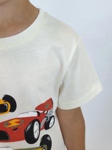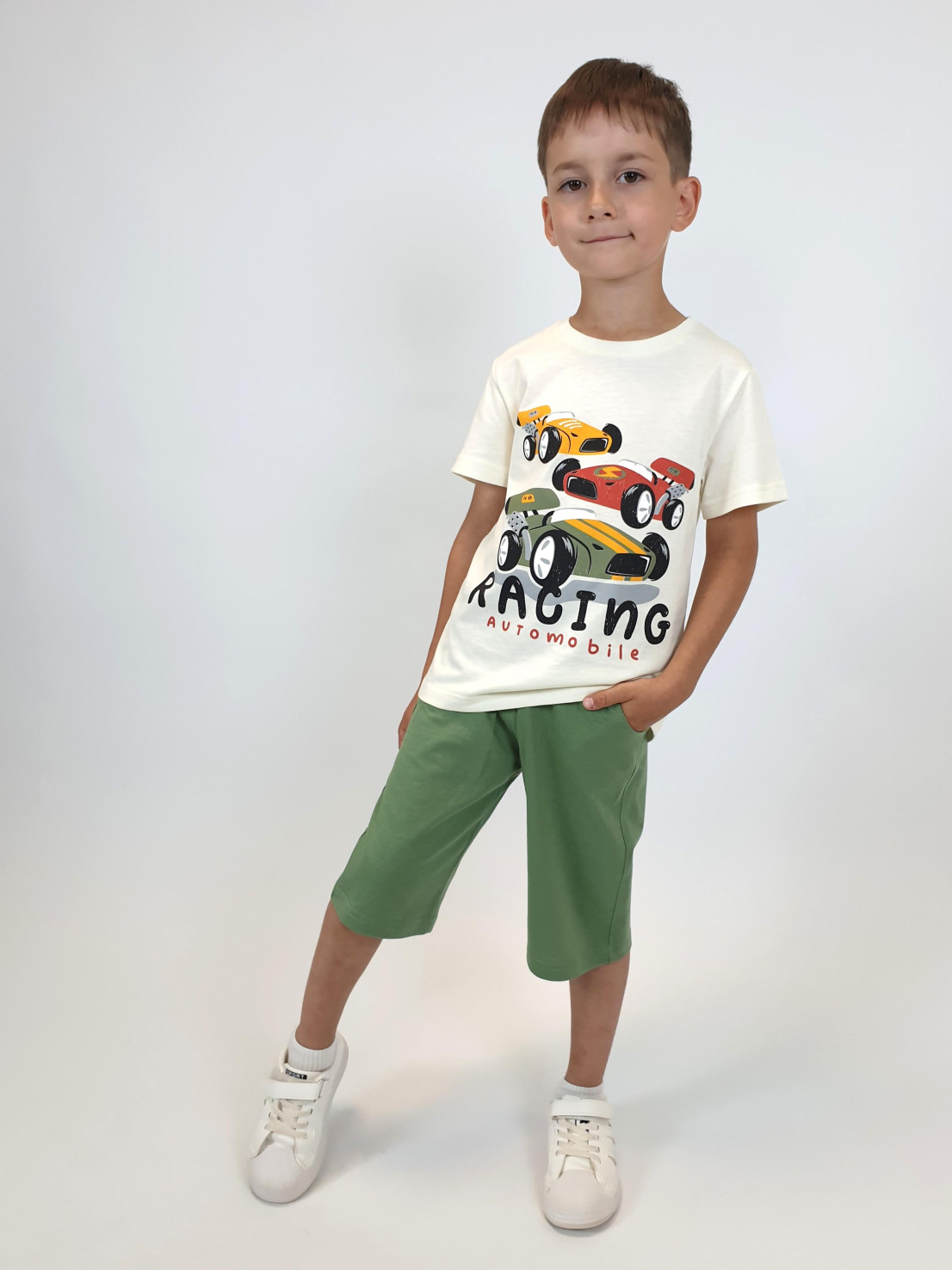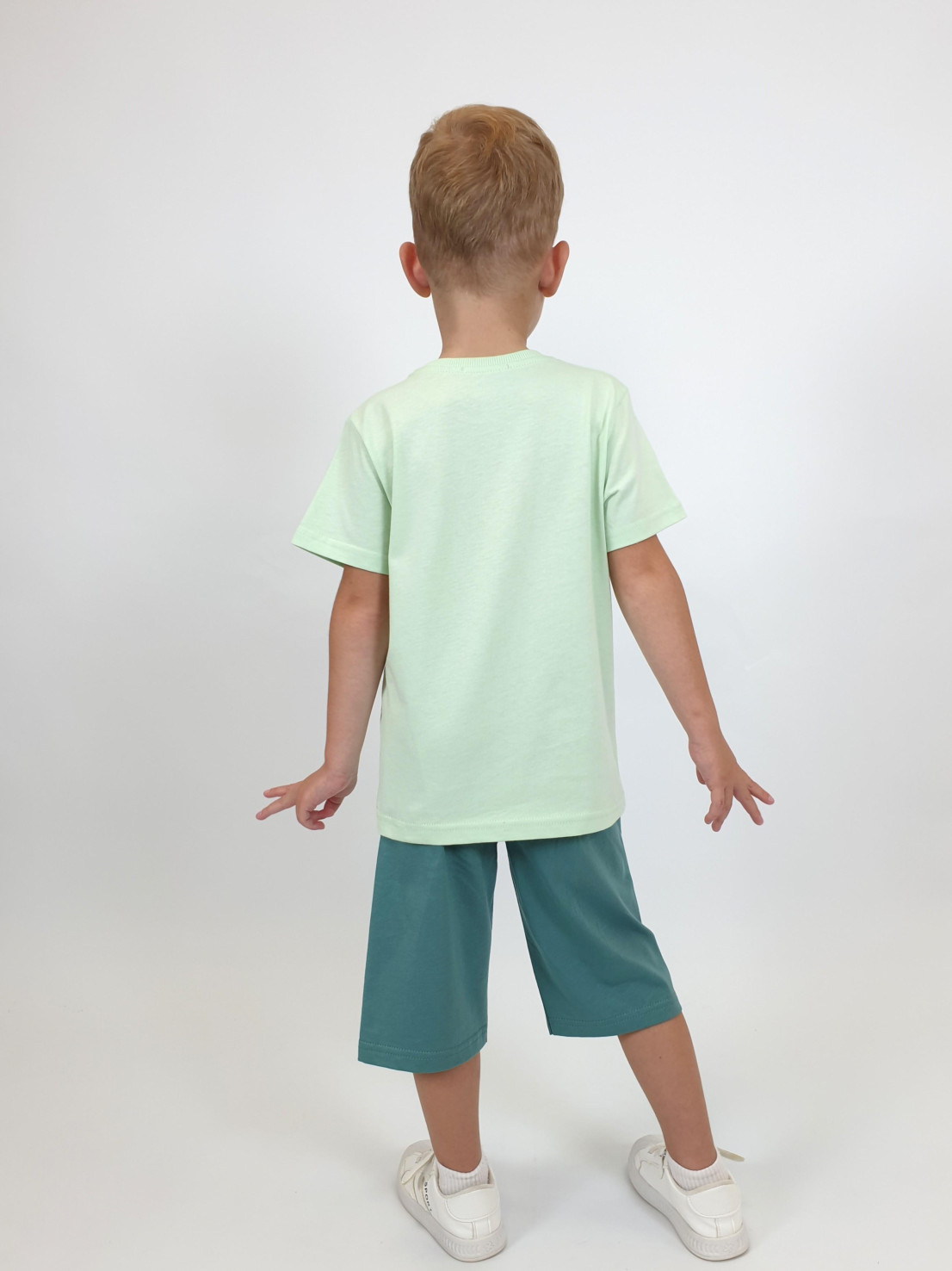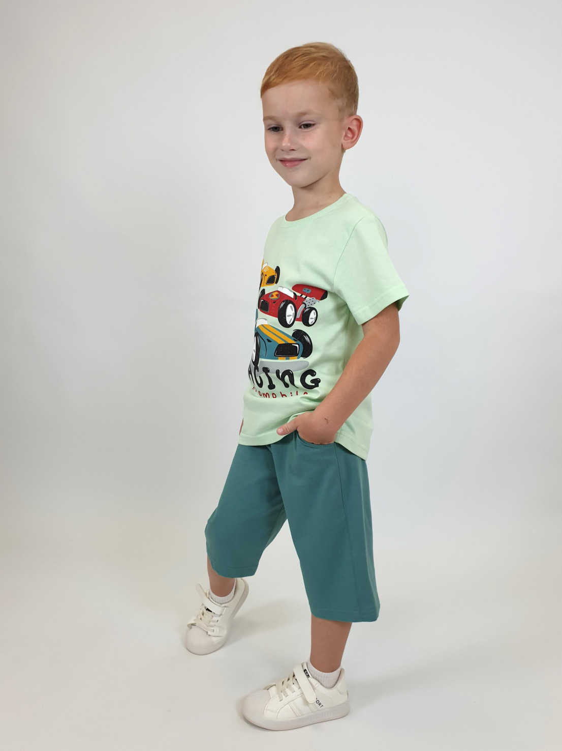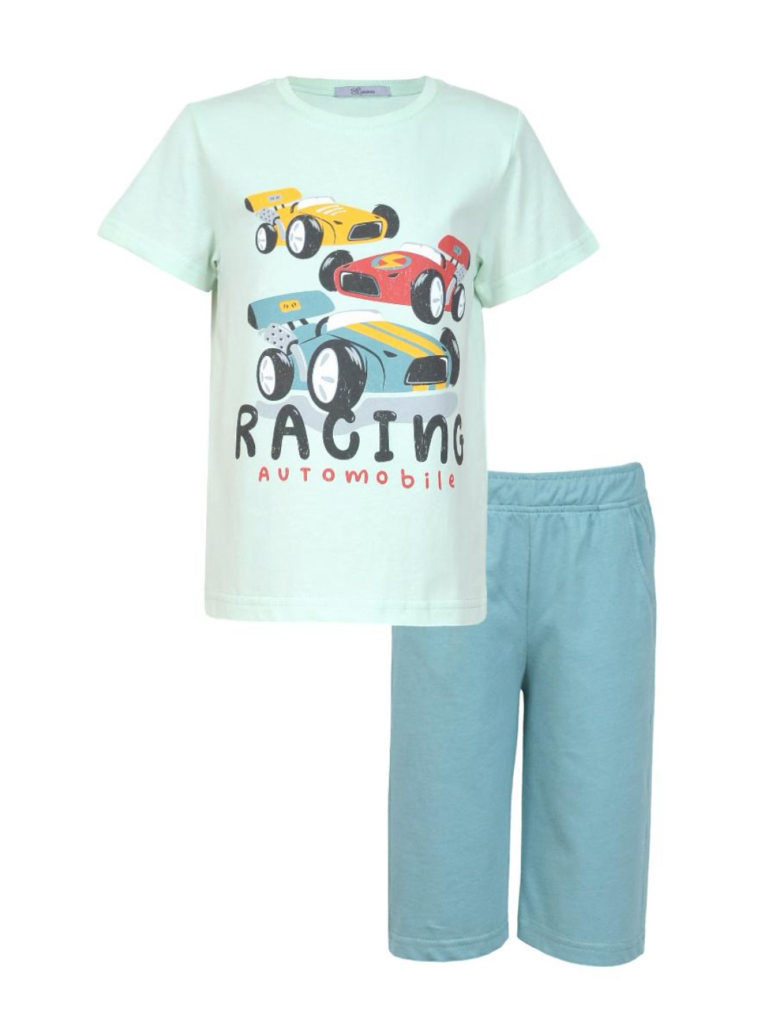 Кулирное полотно: 100% х/б. Джемпер-прямой,короткий втачной рукав,перед с печатью.Горловина обработана ластиком. Шорты-удлиненные с притачным поясом и резинкой.Два боковых кармана.