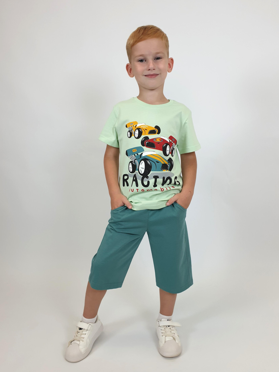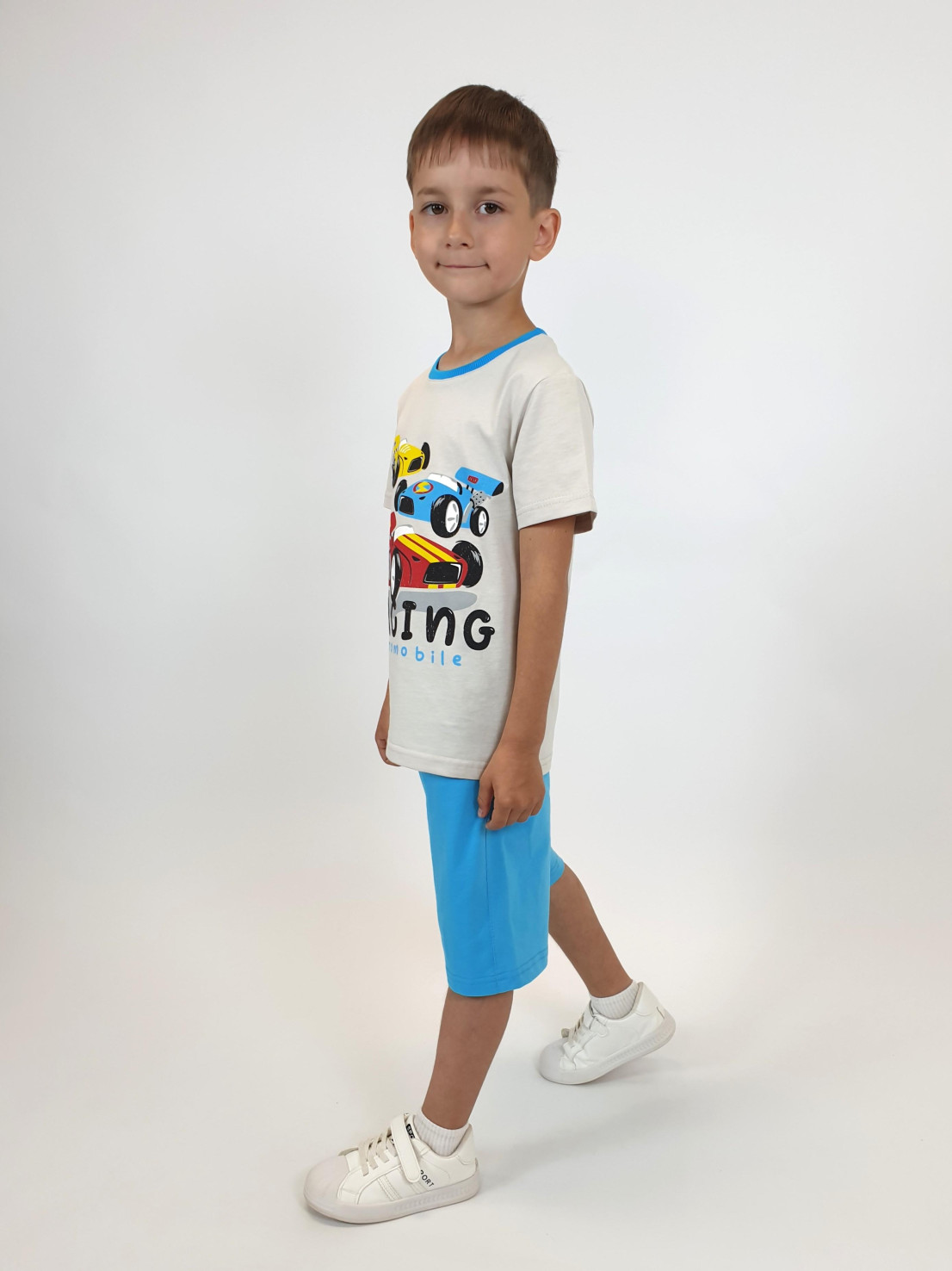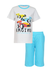Кулирное полотно: 100% х/б. Джемпер-прямой,короткий втачной рукав,перед с печатью.Горловина обработана ластиком. Шорты-удлиненные с притачным поясом и резинкой.Два боковых кармана.