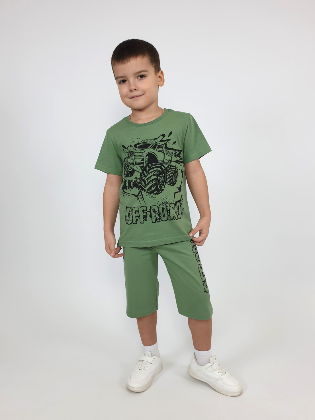 Кулирное полотно: 100% х/б. Джемпер-прямой,короткий втачной рукав,перед с печатью.Горловина обработана ластиком. Шорты-удлиненные с притачным поясом и резинкой,без бокового шва.Печать сбоку.