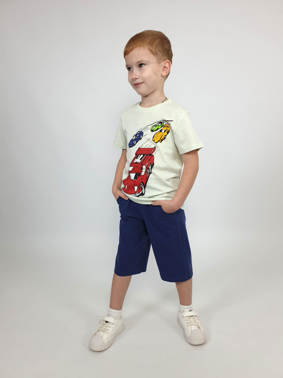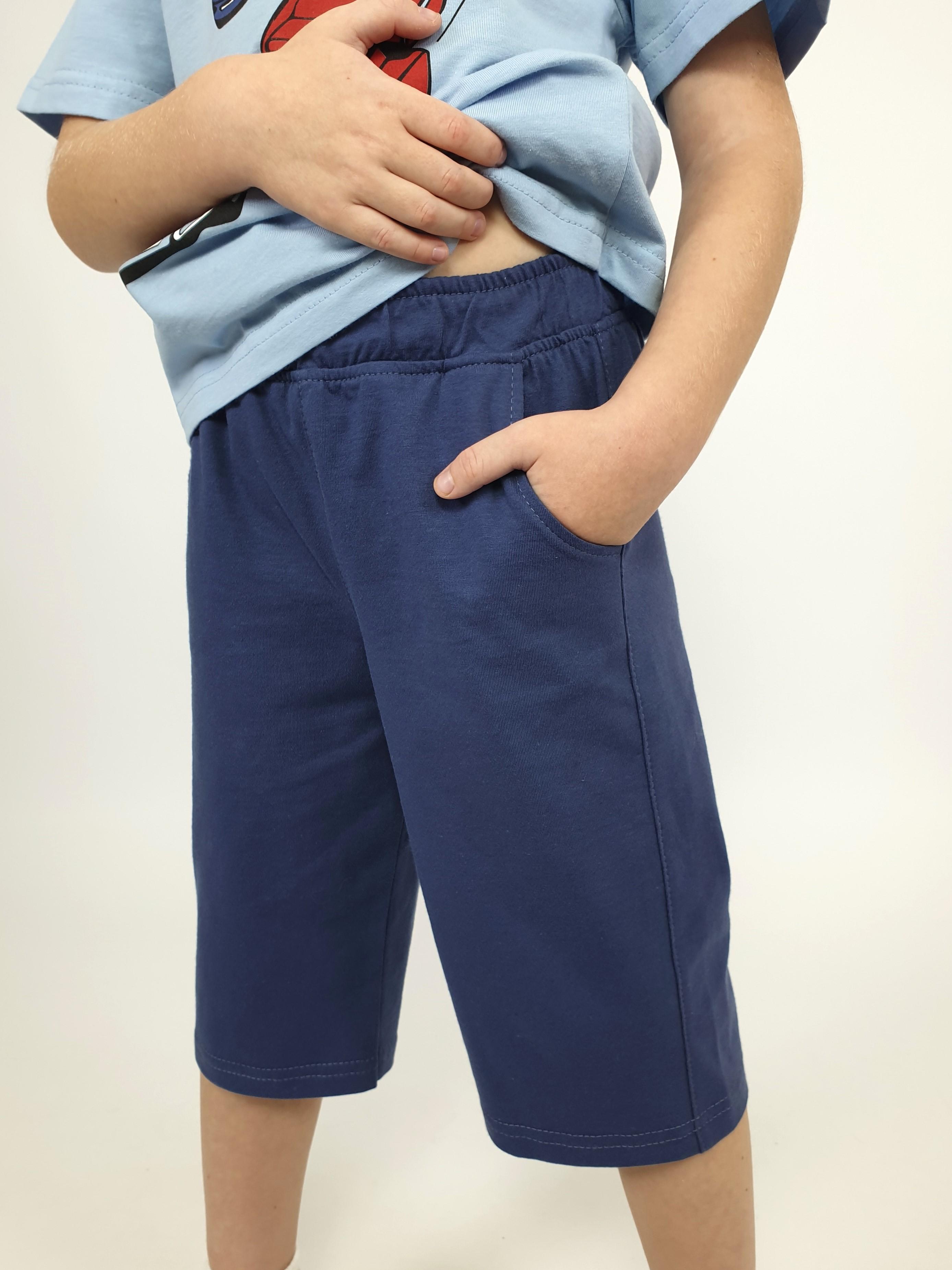 Кулирное полотно: 100% х/б. Джемпер-прямой,перед и спинка с печатью.Короткий,втачной рукав.Горловина обработана ластиком. Шорты-удлиненные с притачным поясом и резинкой.Два боковых кармана.