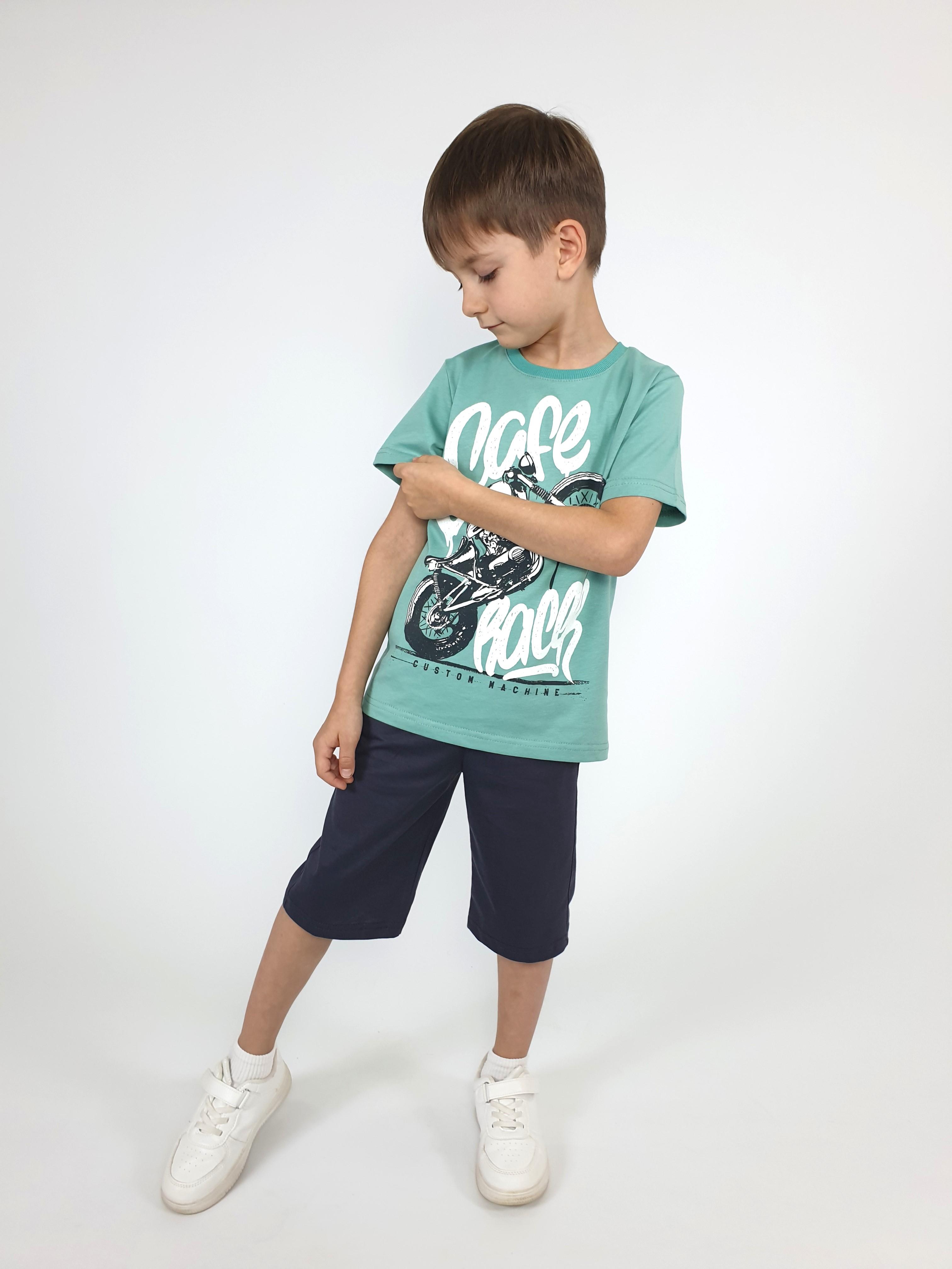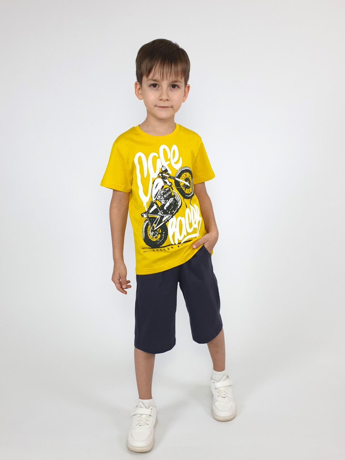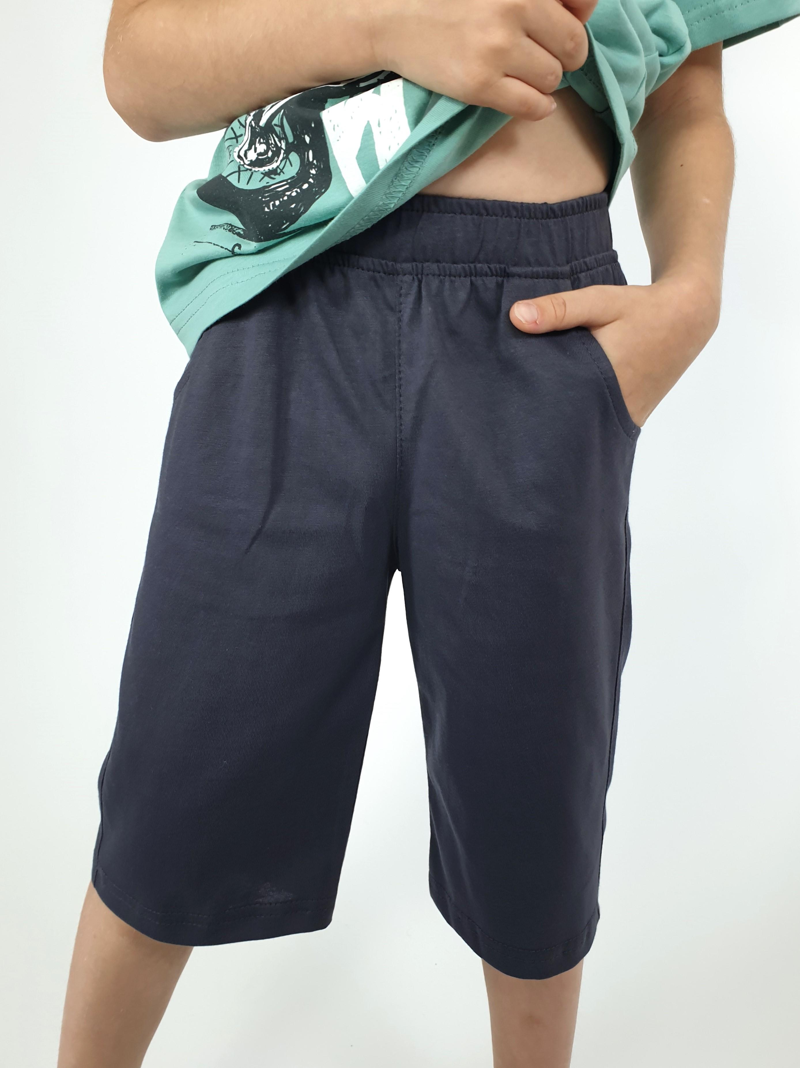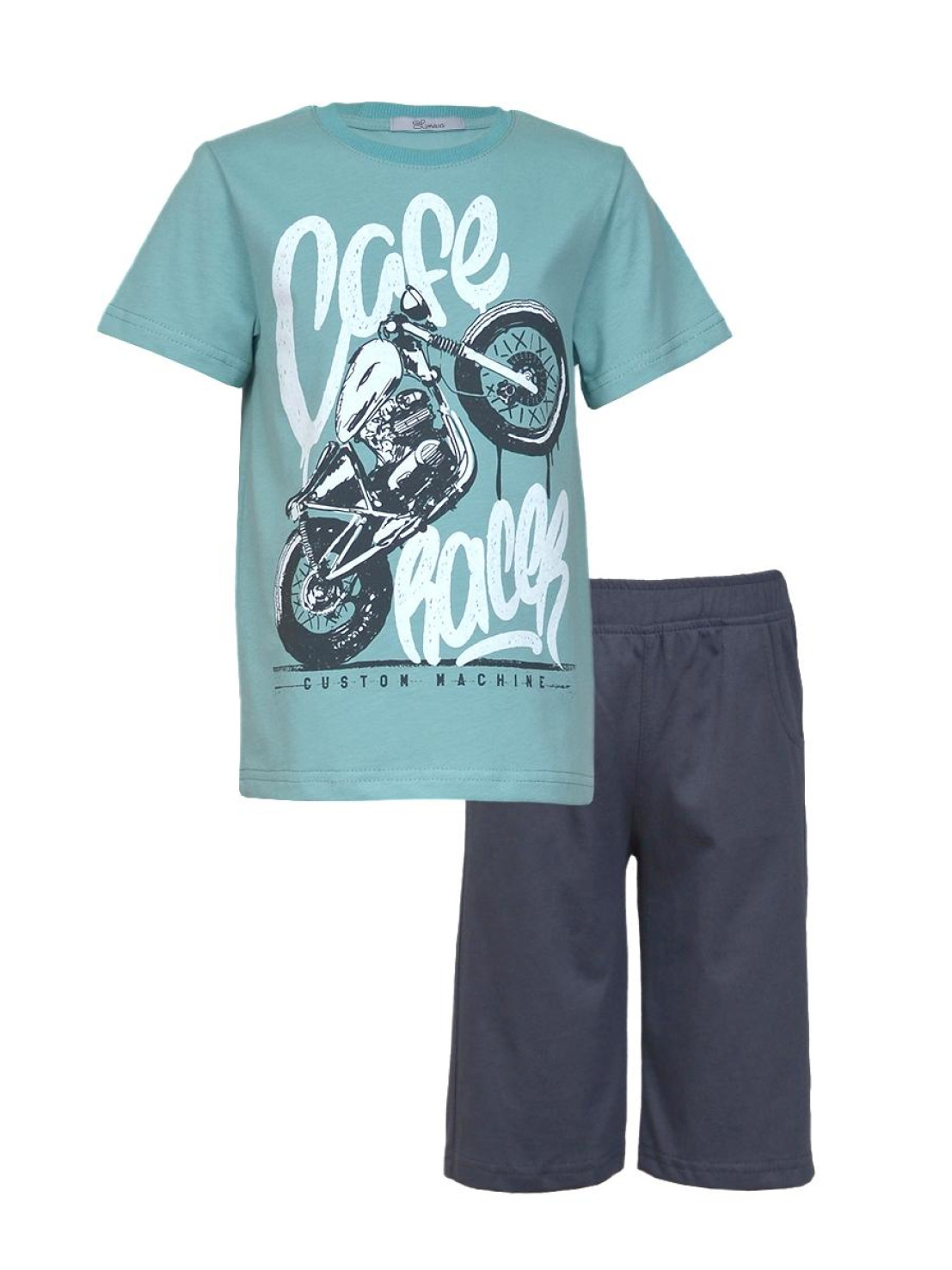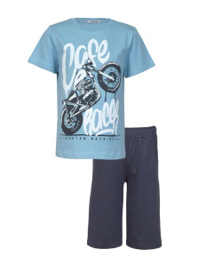 Кулирное полотно: 100% х/б. Джемпер-прямой,перед с печатью.Короткий,втачной рукав.Горловина обработана ластиком. Шорты-удлиненные с притачным поясом и резинкой.Два боковых кармана.