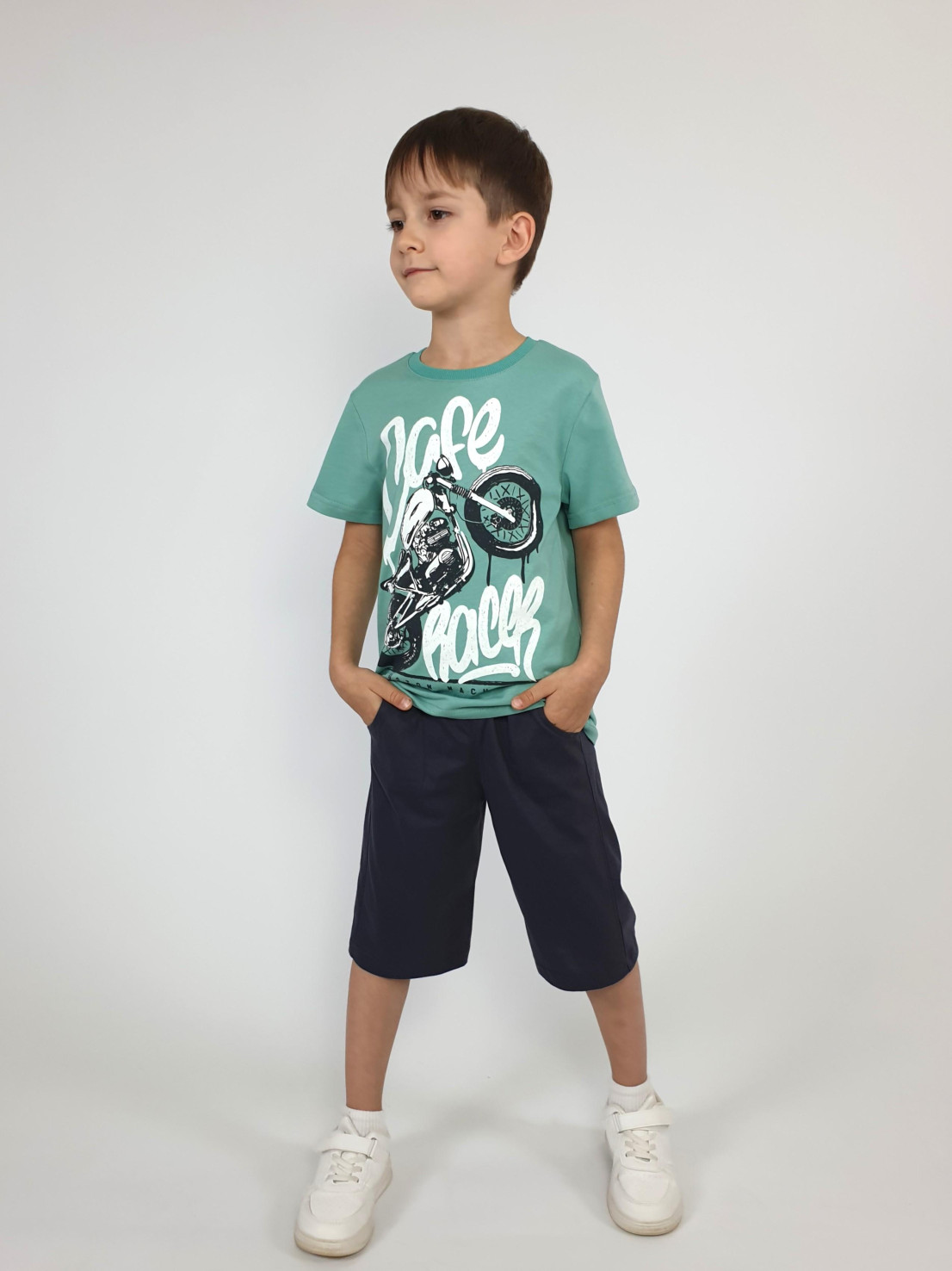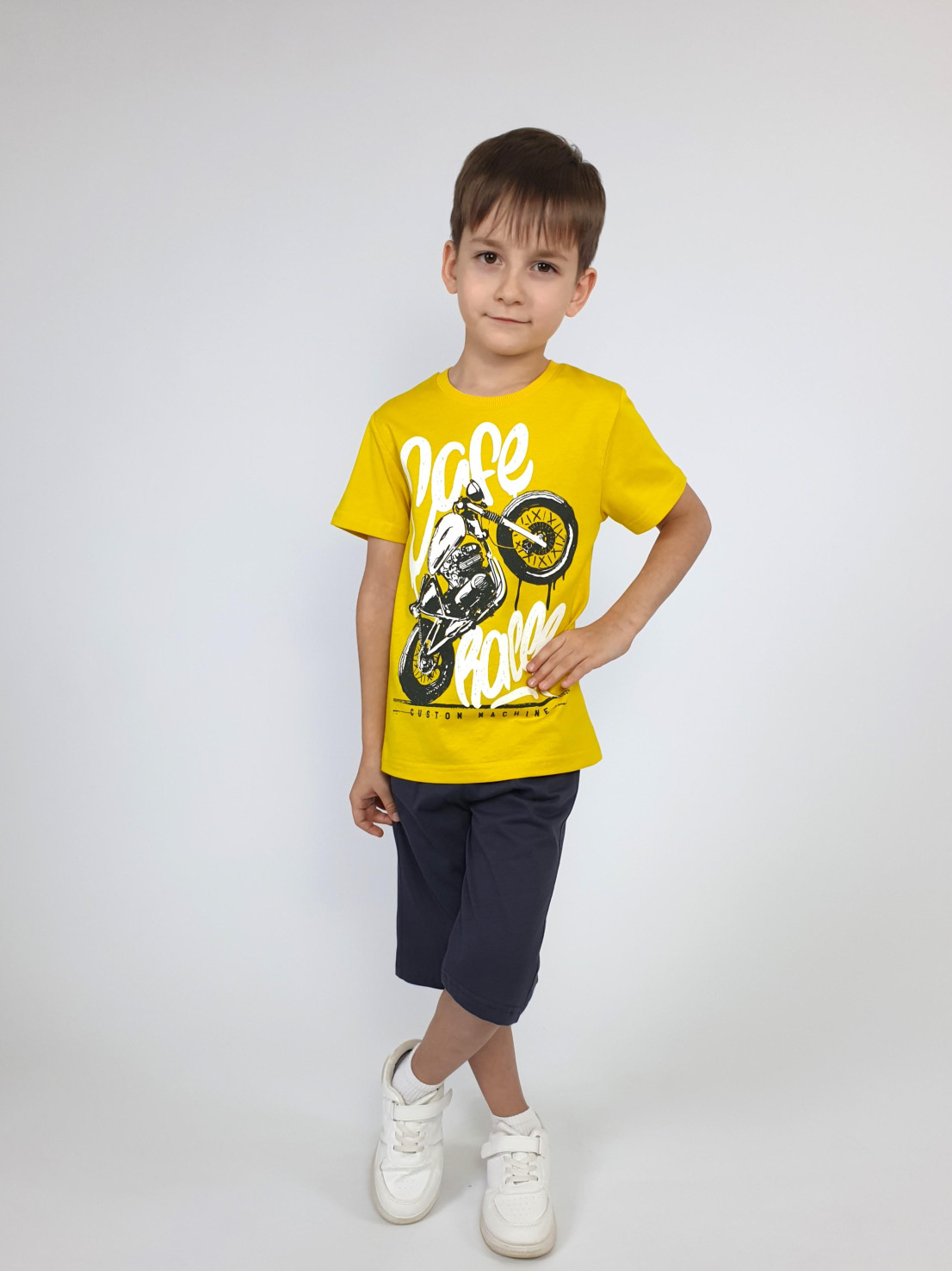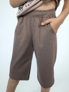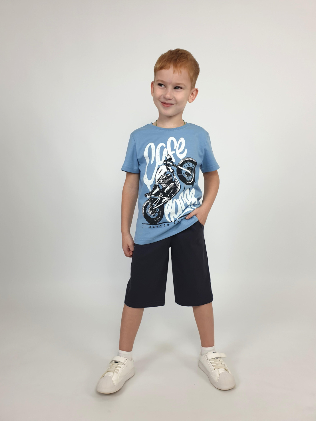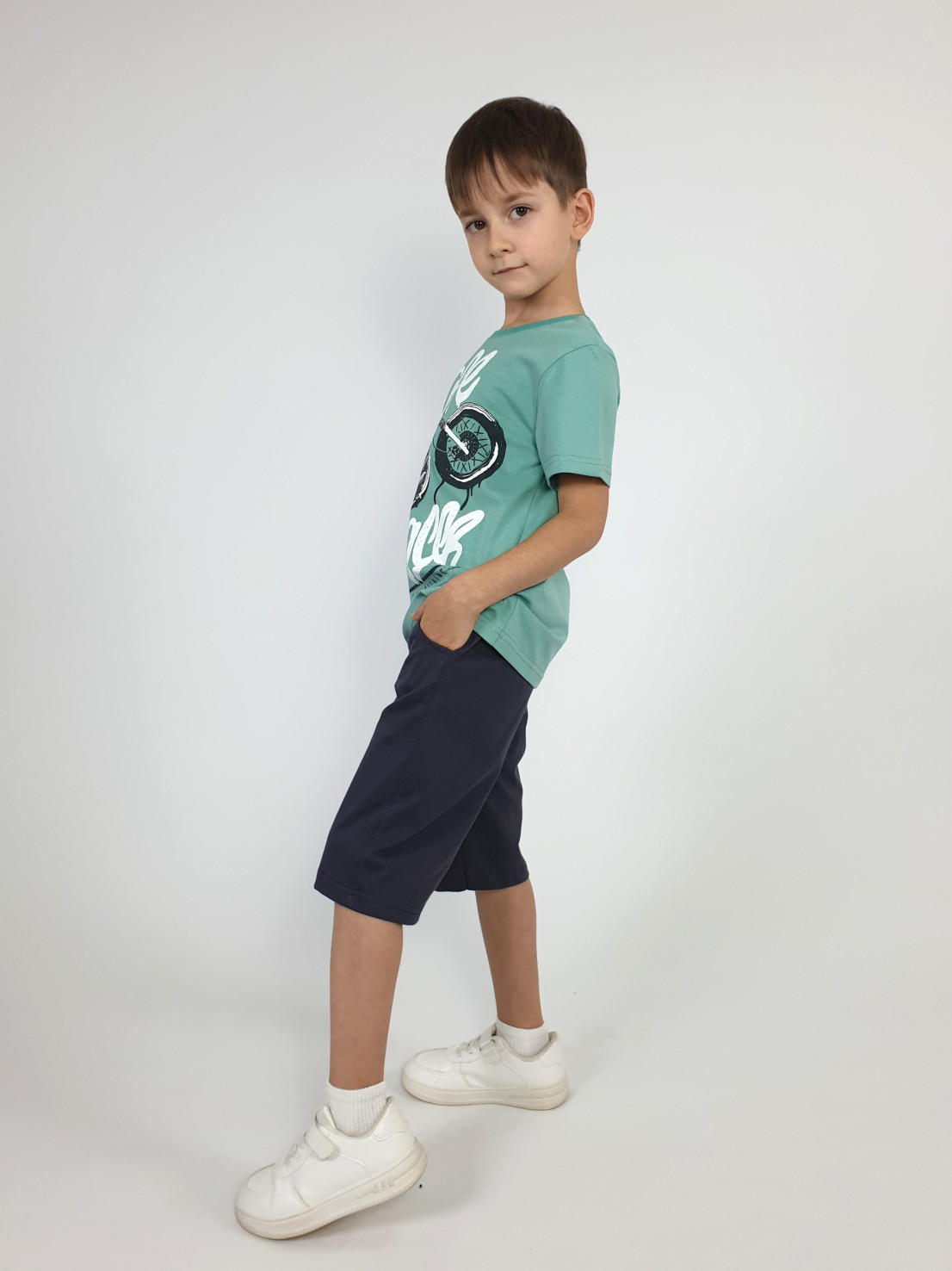 Кулирное полотно: 100% х/б. Джемпер-прямой,перед с печатью.Короткий,втачной рукав.Горловина обработана ластиком. Шорты-удлиненные с притачным поясом и резинкой.Два боковых кармана.