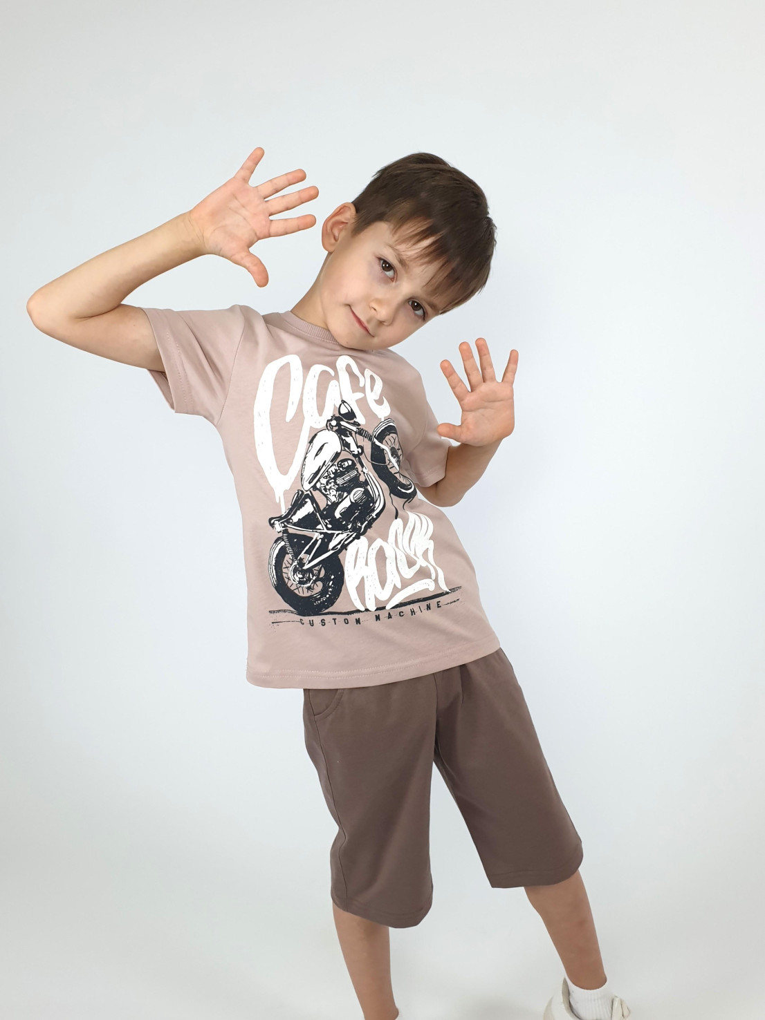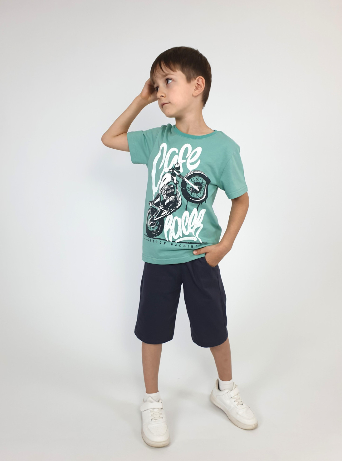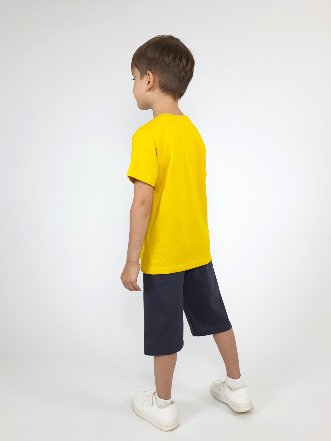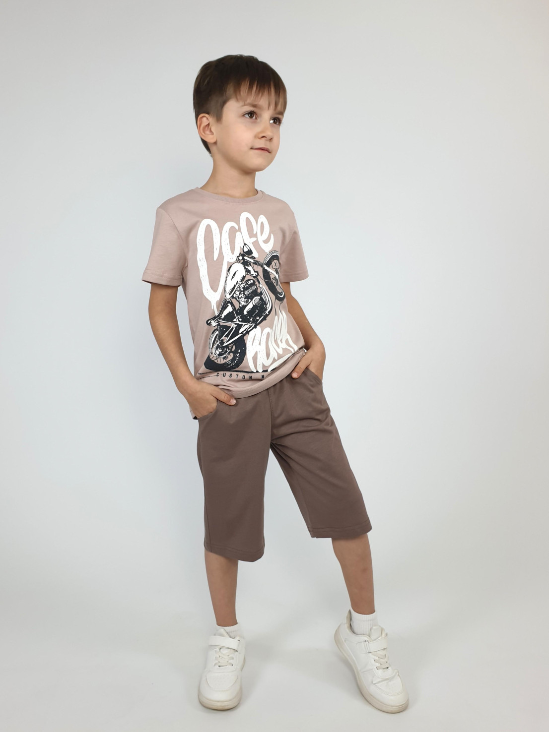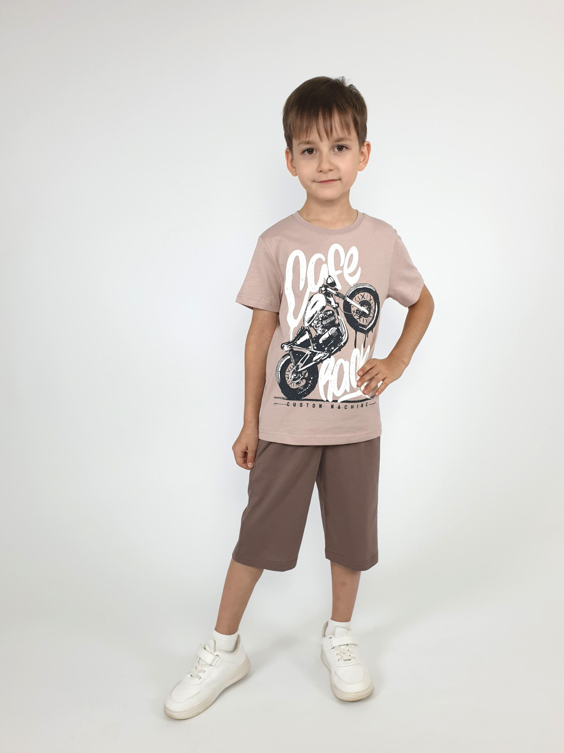 Кулирное полотно: 100% х/б. Джемпер-прямой,перед с печатью.Короткий,втачной рукав.Горловина обработана ластиком. Шорты-удлиненные с притачным поясом и резинкой.Два боковых кармана.