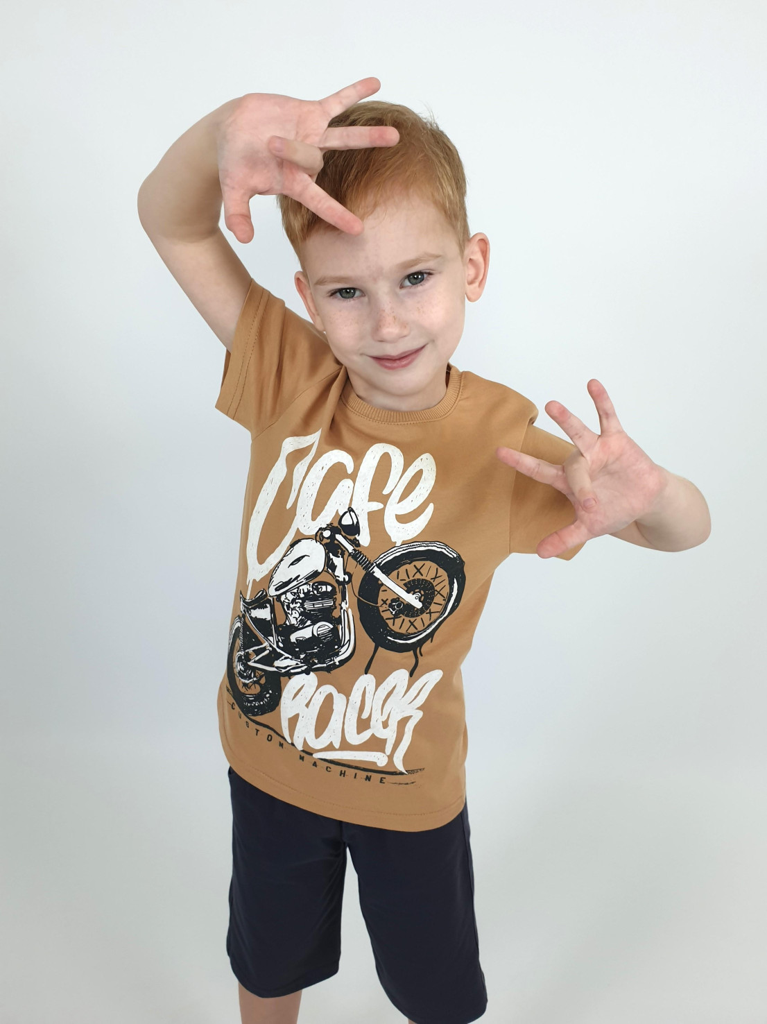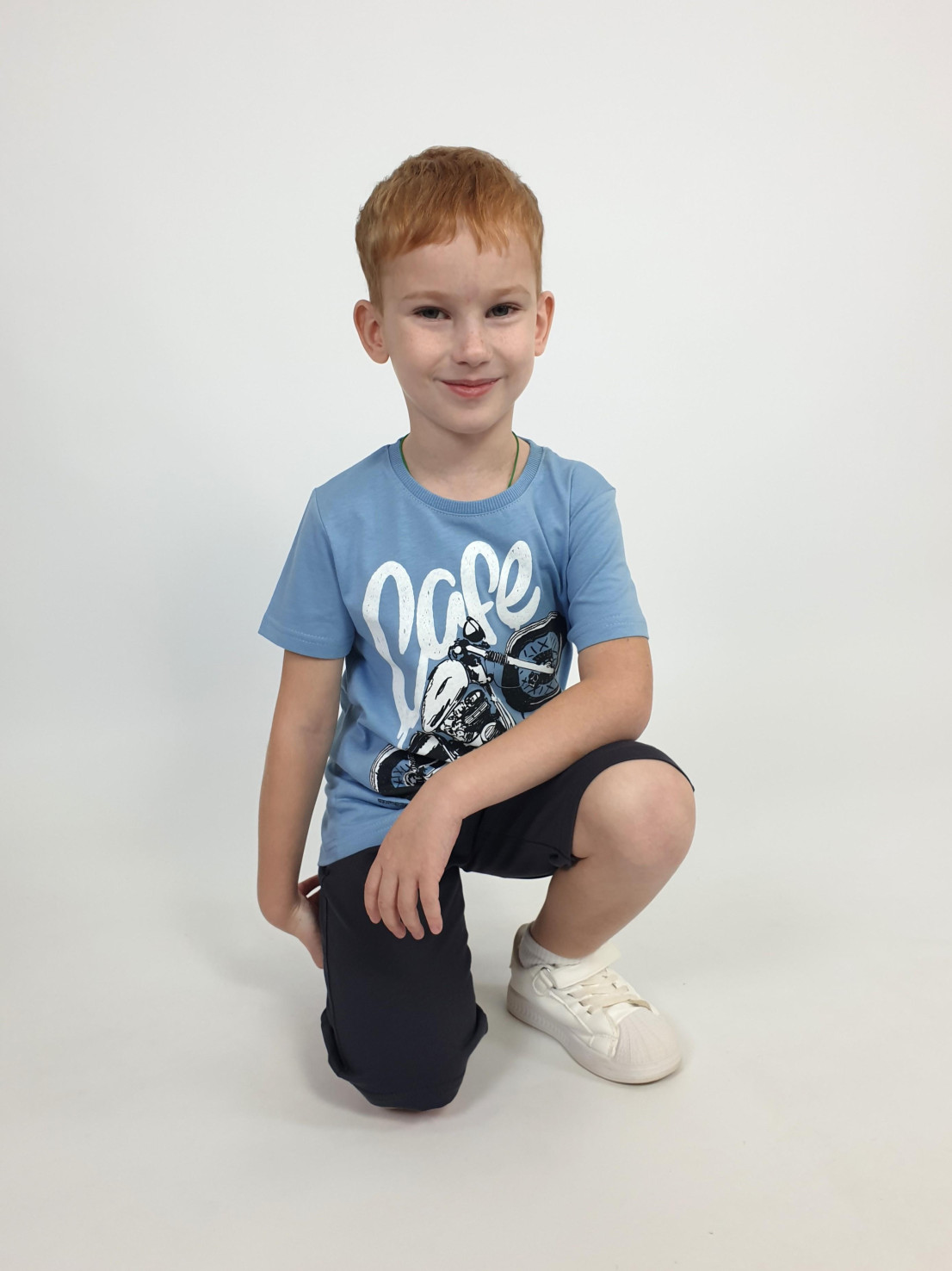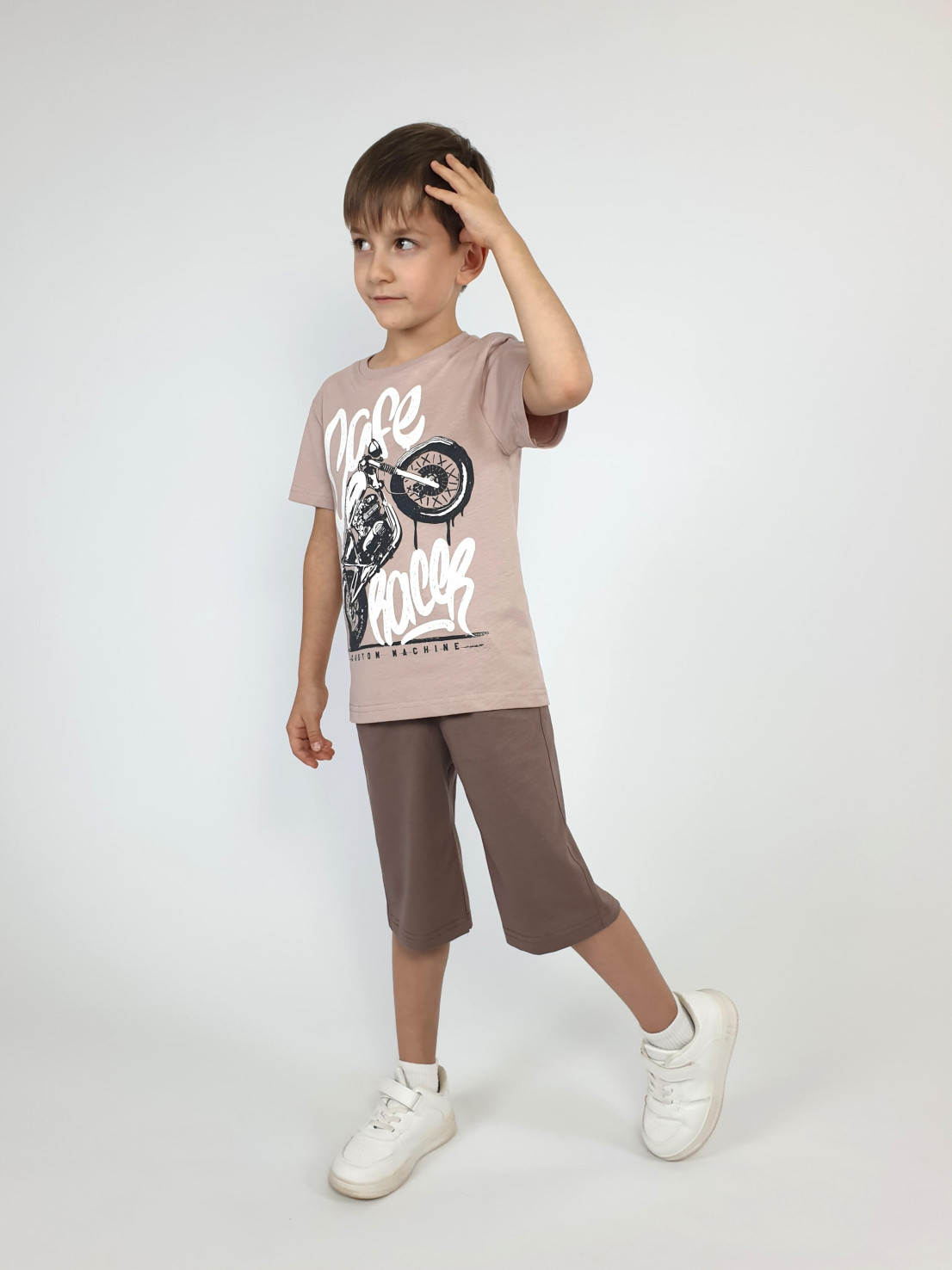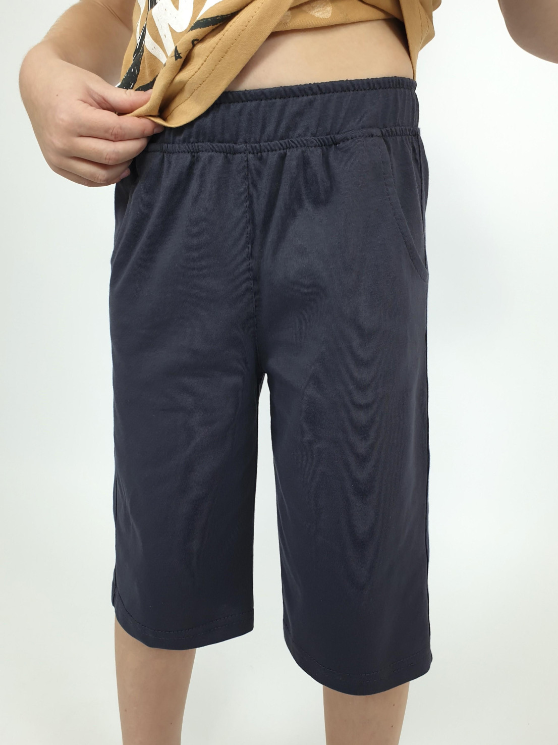 Кулирное полотно: 100% х/б. Джемпер-прямой,перед с печатью.Короткий,втачной рукав.Горловина обработана ластиком. Шорты-удлиненные с притачным поясом и резинкой.Два боковых кармана.