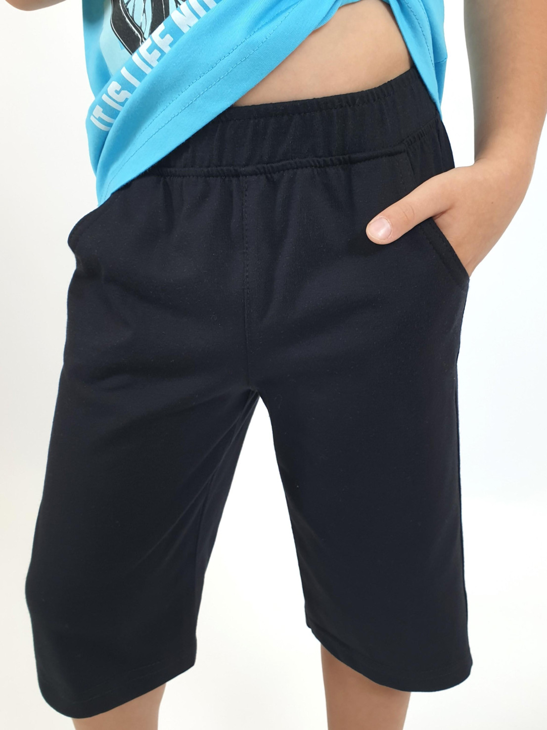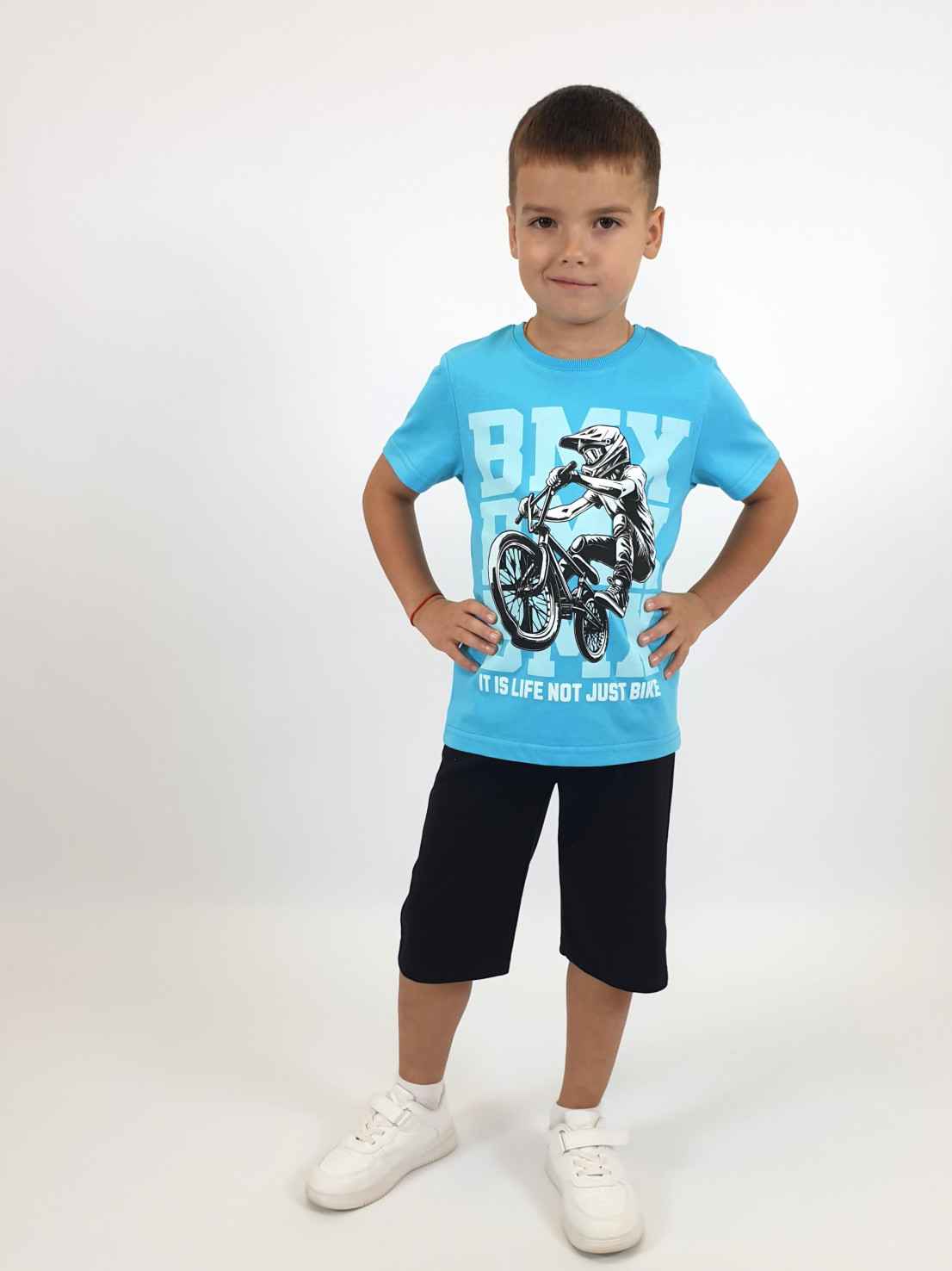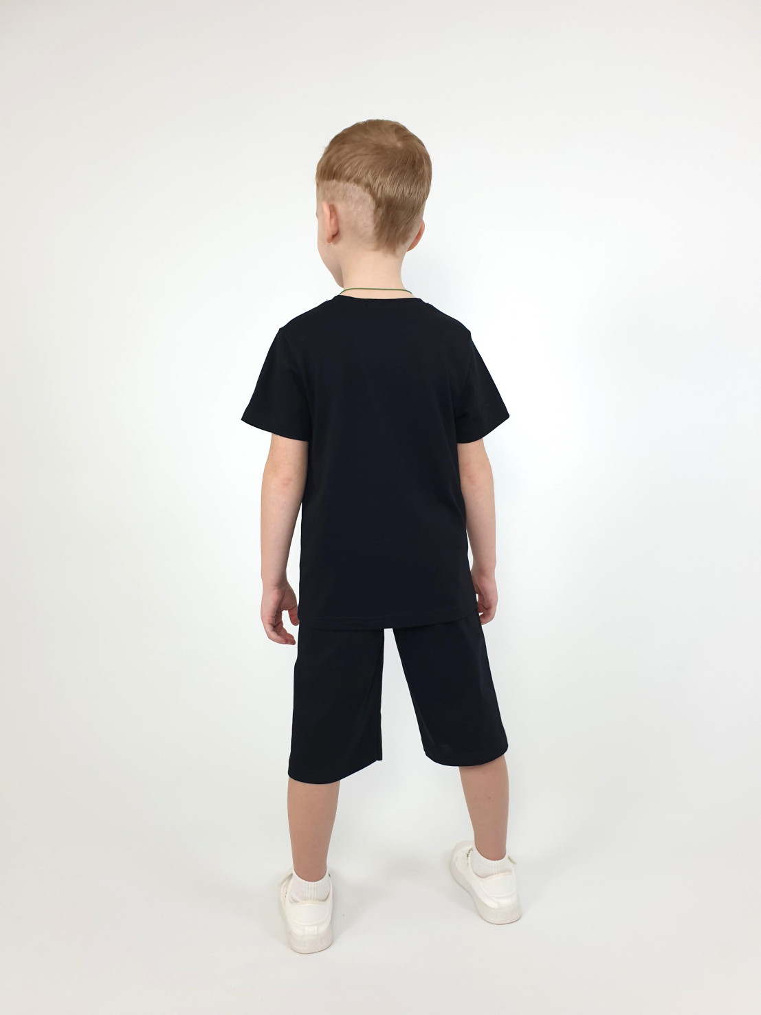 Кулирное полотно: 100% х/б. Джемпер-прямой,с печатью.Короткий,втачной рукав.Горловина обработана ластиком. Шорты-удлиненные с притачным поясом и резинкой.Два кармана на переде.