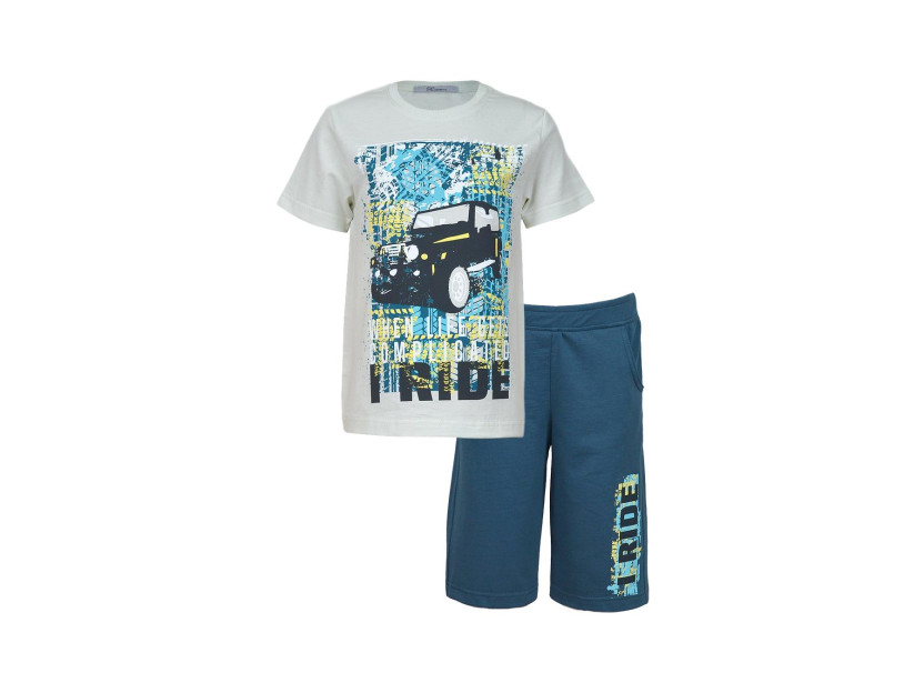 Кулирное полотно: 100% х/б. Фуфайка-прямая,короткий втачной рукав.Горловина обработана ластиком.Печать на переде. Шорты-укороченные с притачным поясом и резинкой.Два боковых кармана на переде,печать на левой передней половинке.