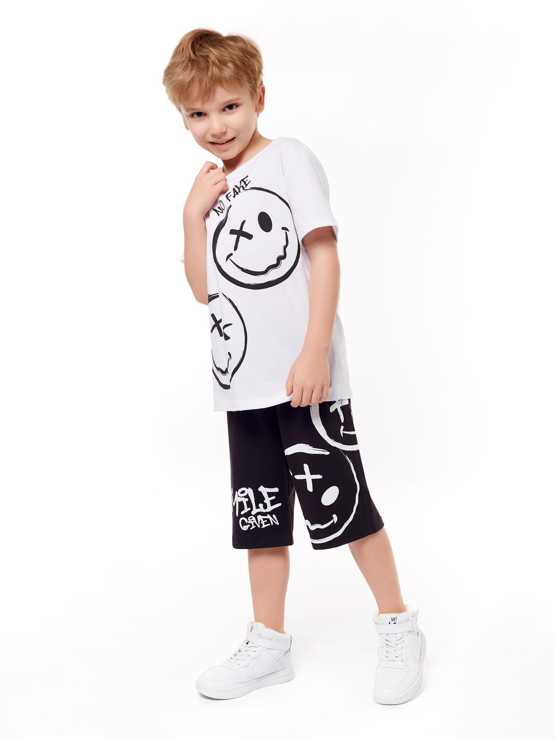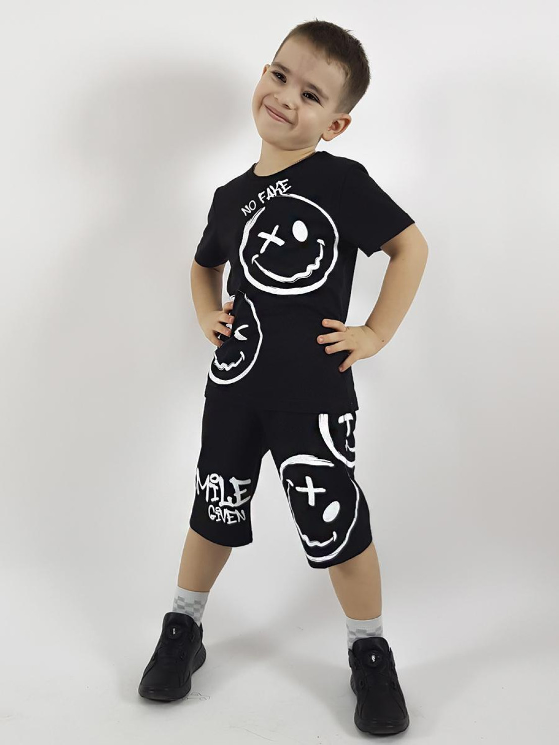 Кулирное полотно: 100% х/б. Фуфайка-прямая,короткий втачной рукав,перед с печатью.Горловина обработана ластиком. Шорты-удлиненные с притачным поясом,с резинкой.Печать на правой передней половинке внизу и левой стороне(сзади на перед).