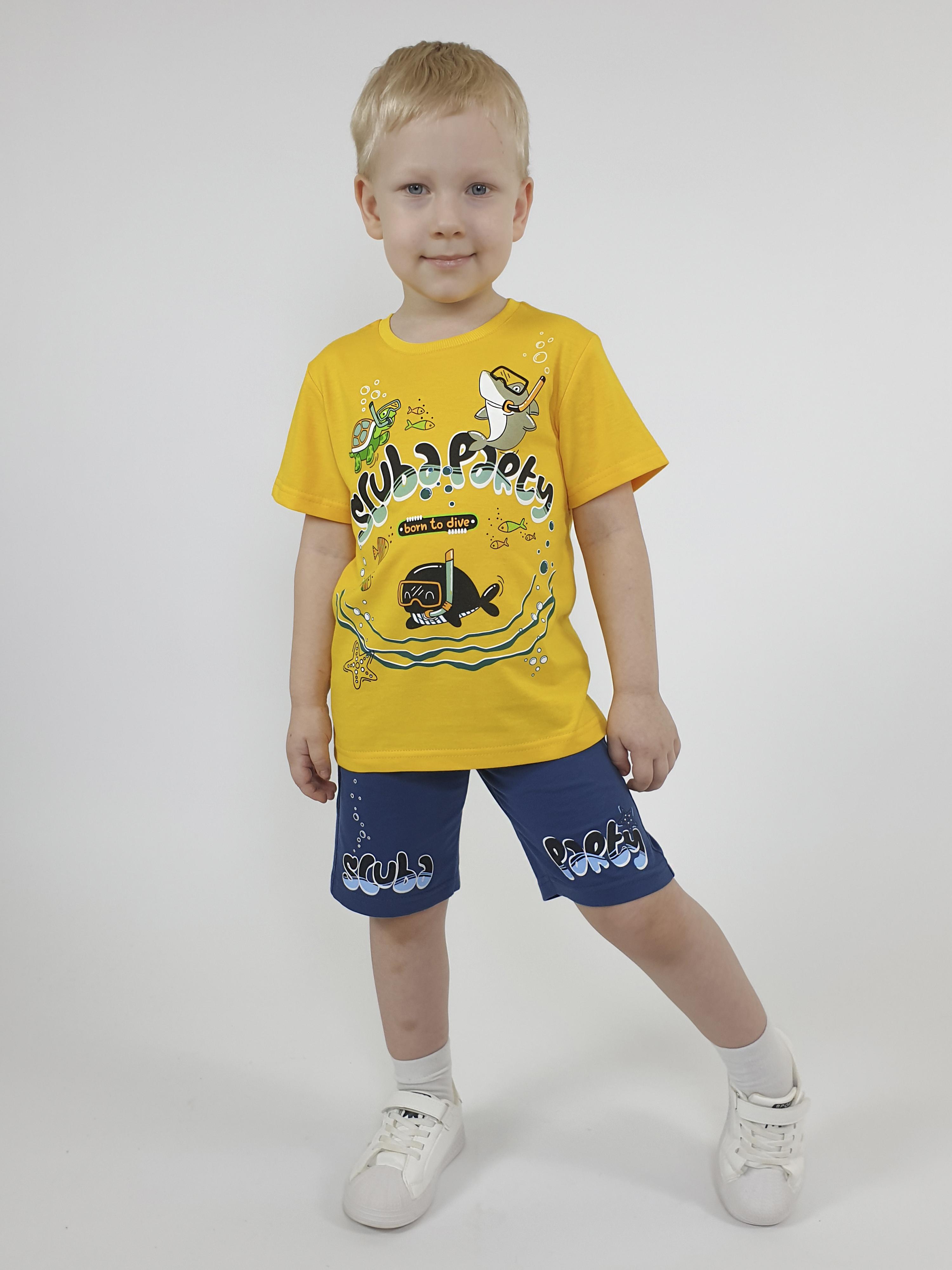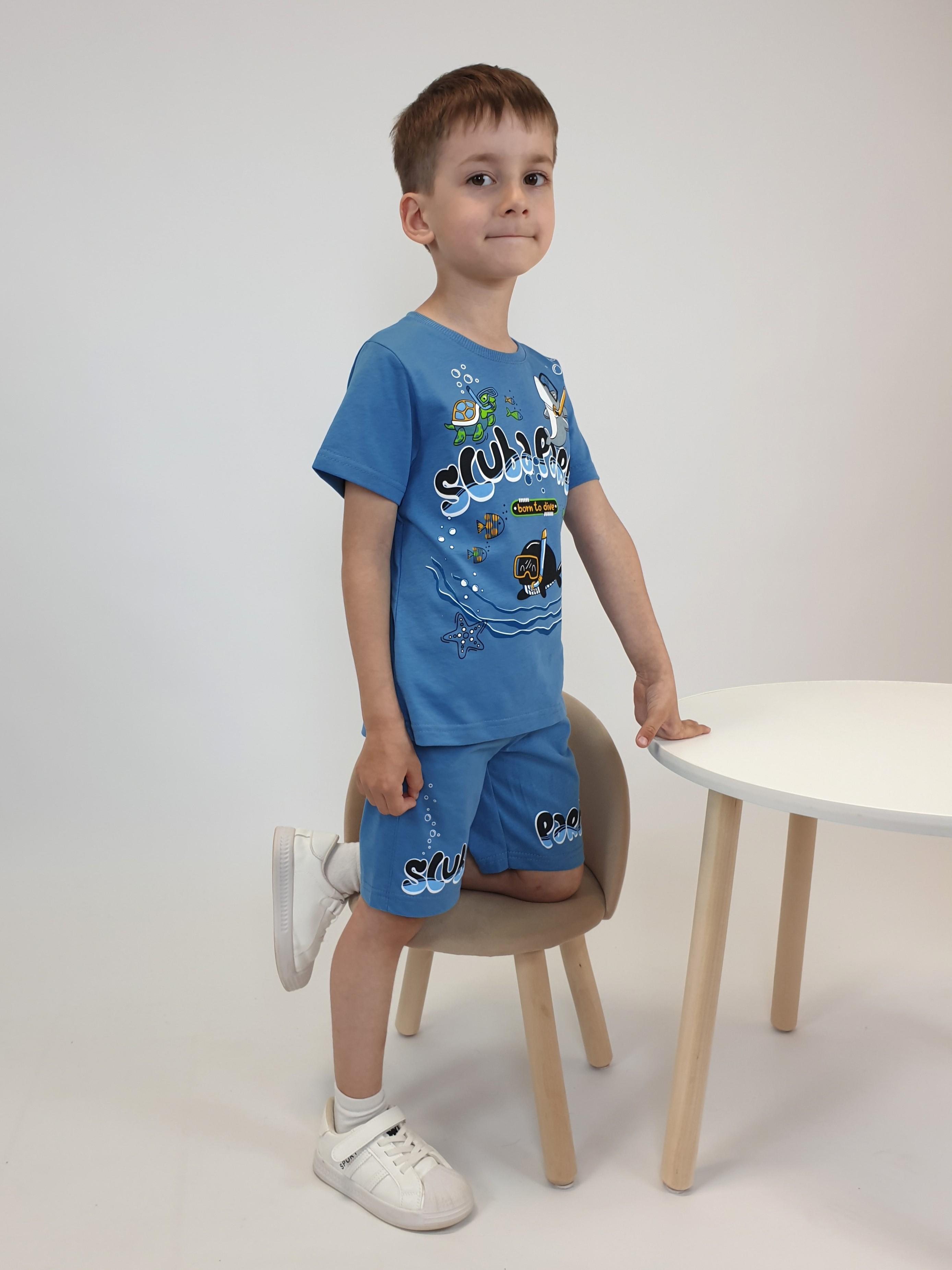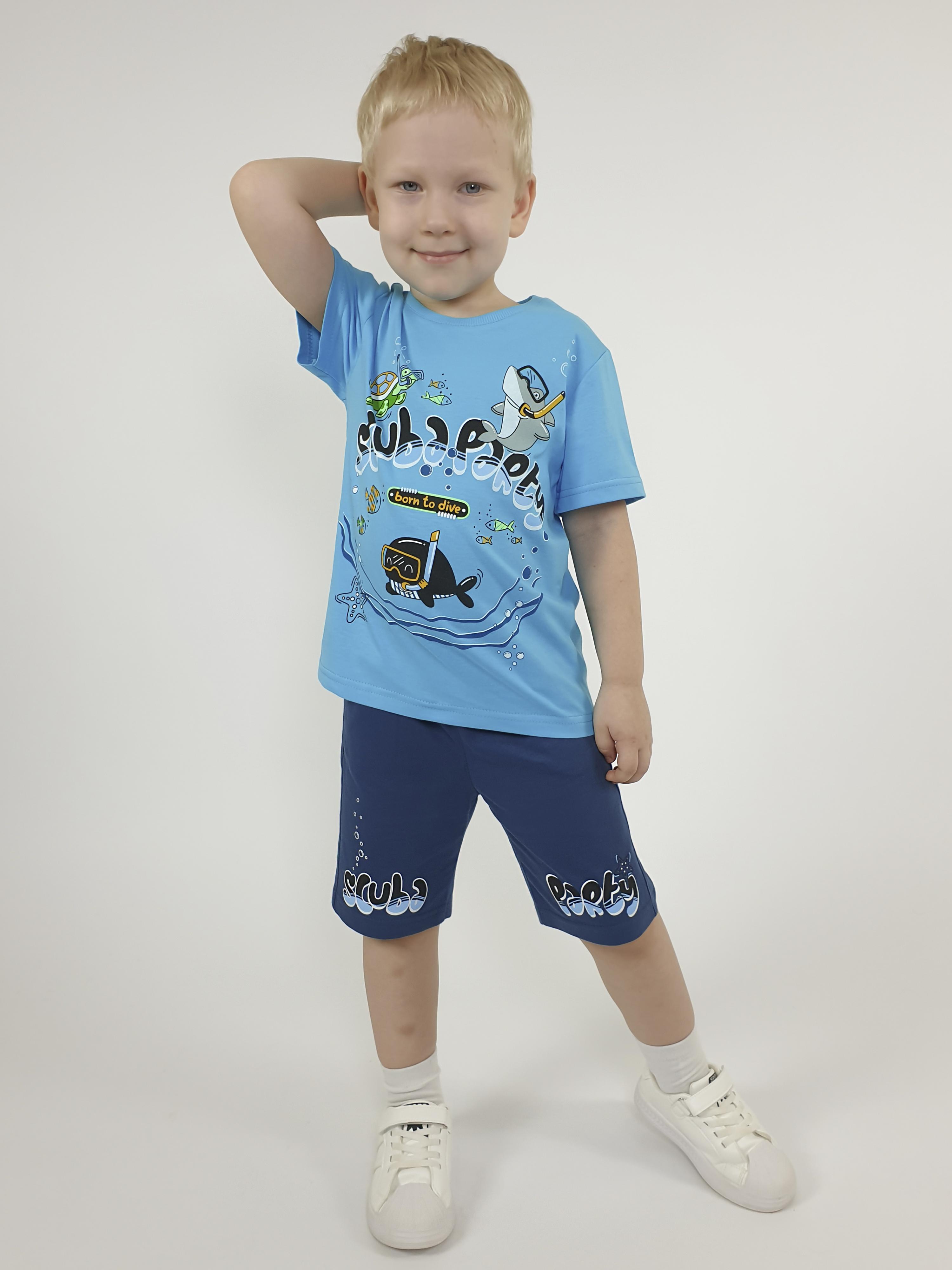 Кулирное полотно: 100% х/б. Фуфайка-прямая,перед с печатью.Рукав втачной,короткий.Горловина обработана ластиком. Шорты-укороченные с притачным поясом и резинкой.Два боковых кармана по переду.Печать на передних половинках внизу.