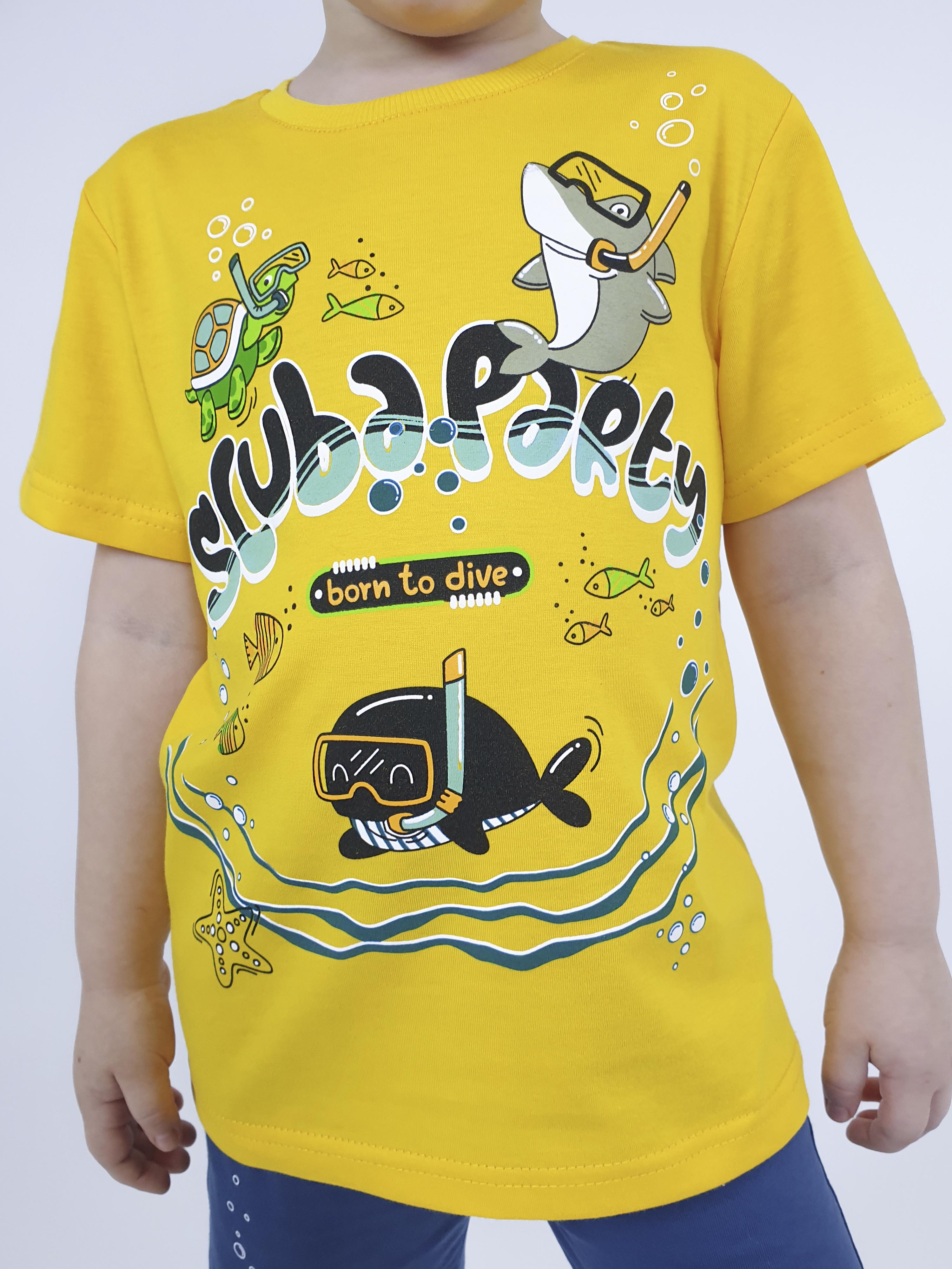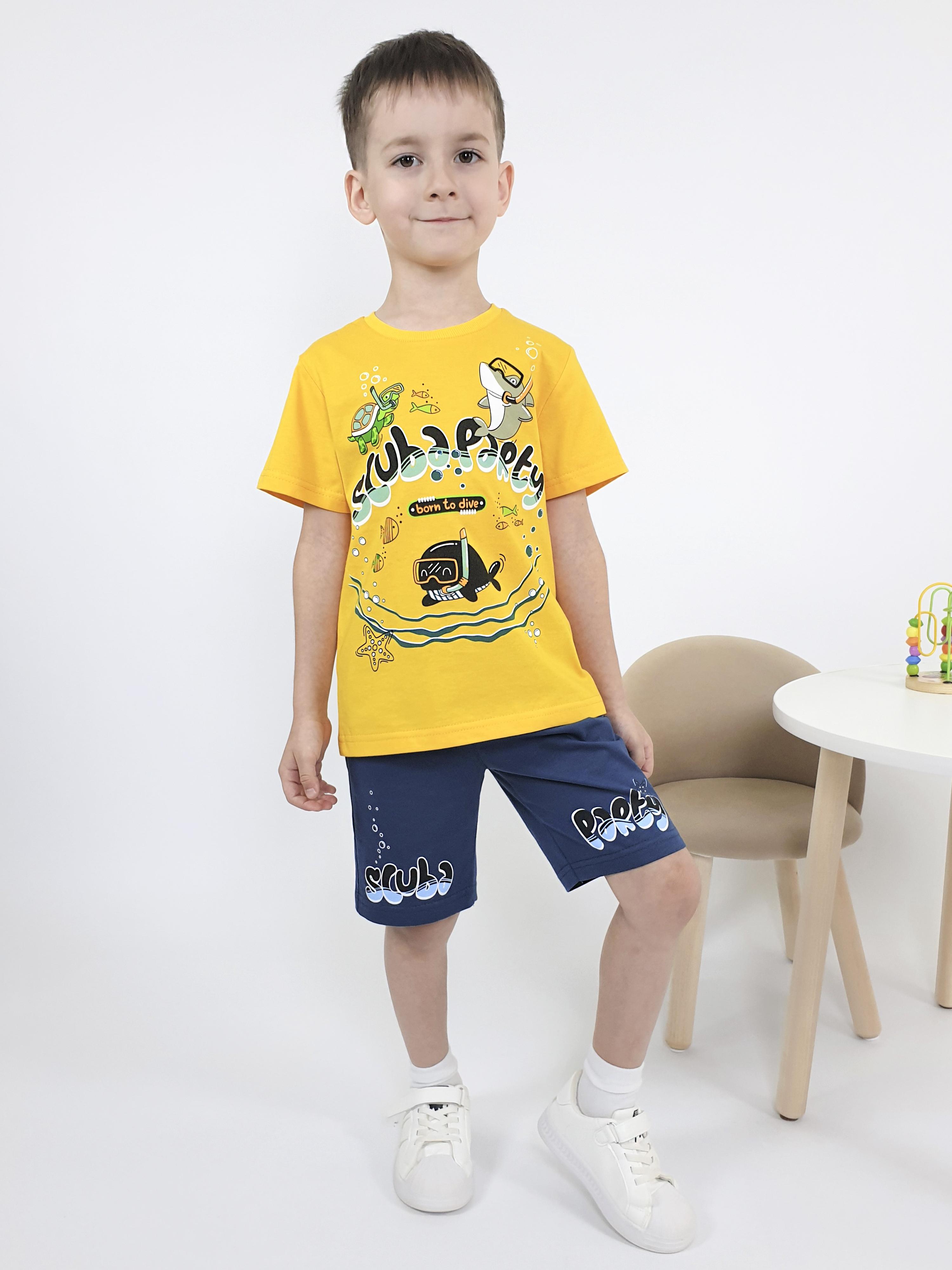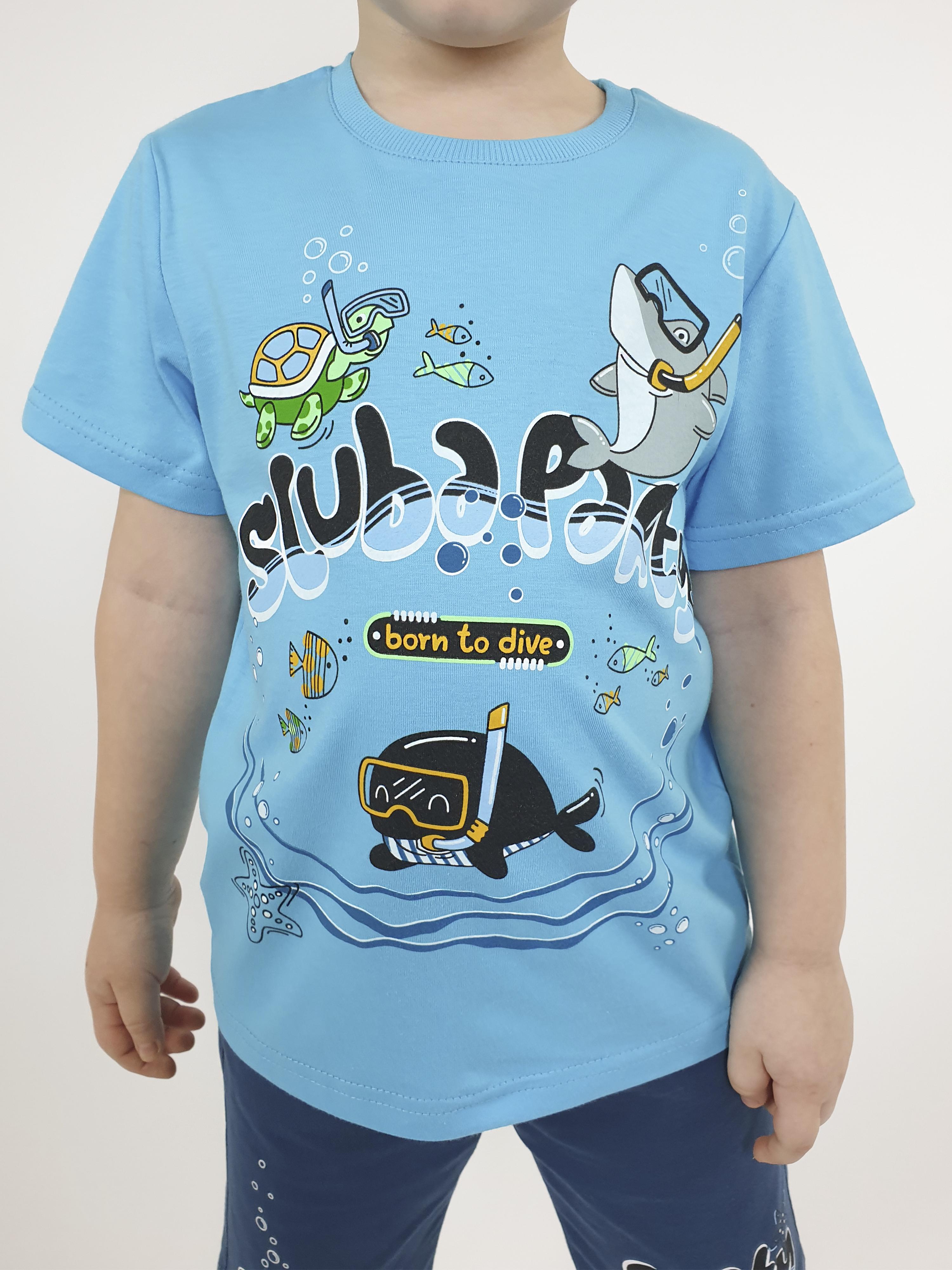 Кулирное полотно: 100% х/б. Фуфайка-прямая,перед с печатью.Рукав втачной,короткий.Горловина обработана ластиком. Шорты-укороченные с притачным поясом и резинкой.Два боковых кармана по переду.Печать на передних половинках внизу.