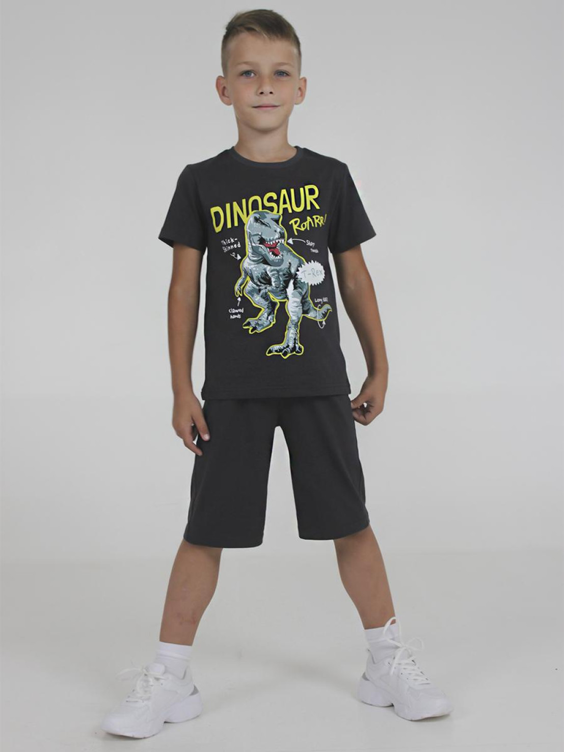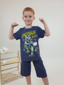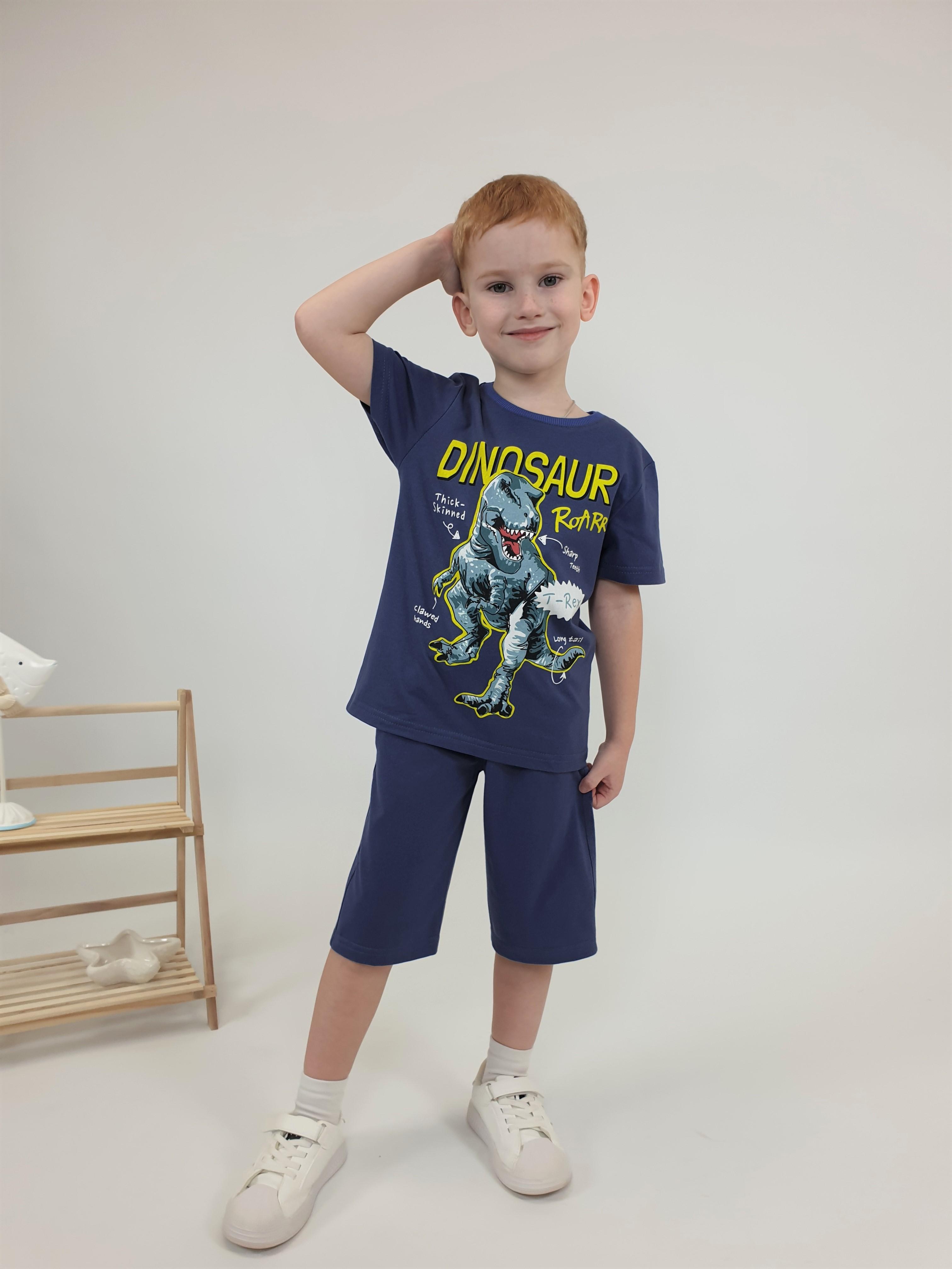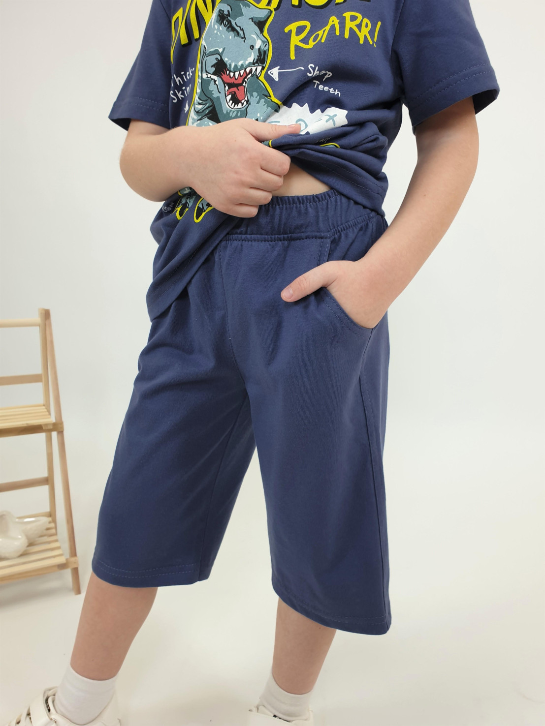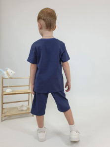 Кулирное полотно: 100% х/б. Фуфайка-прямая с печатью,короткий втачной рукав.Горловина обработана ластиком. Шорты-удлиненные с притачным поясом и резинкой.Два кармана на переде.