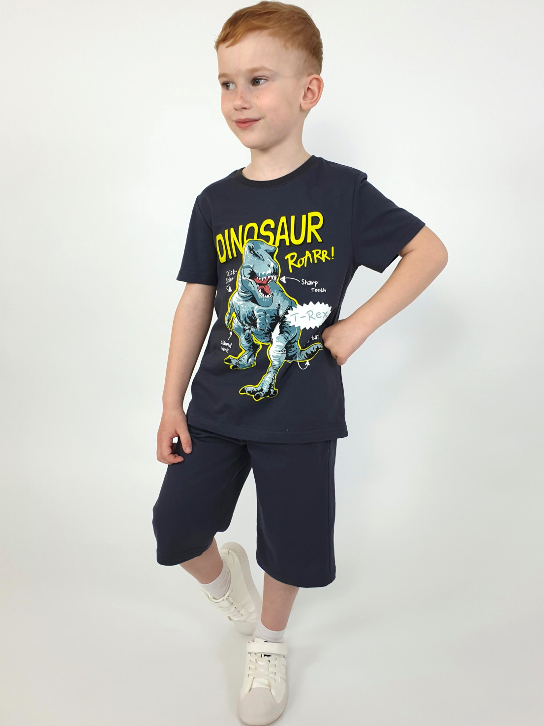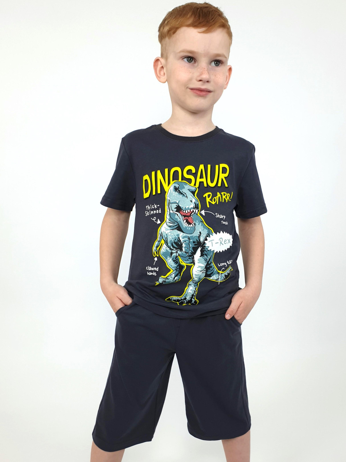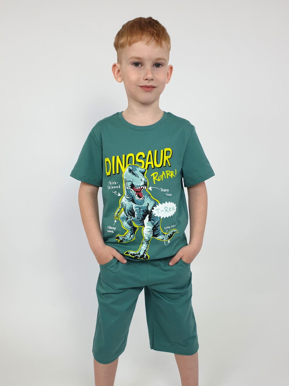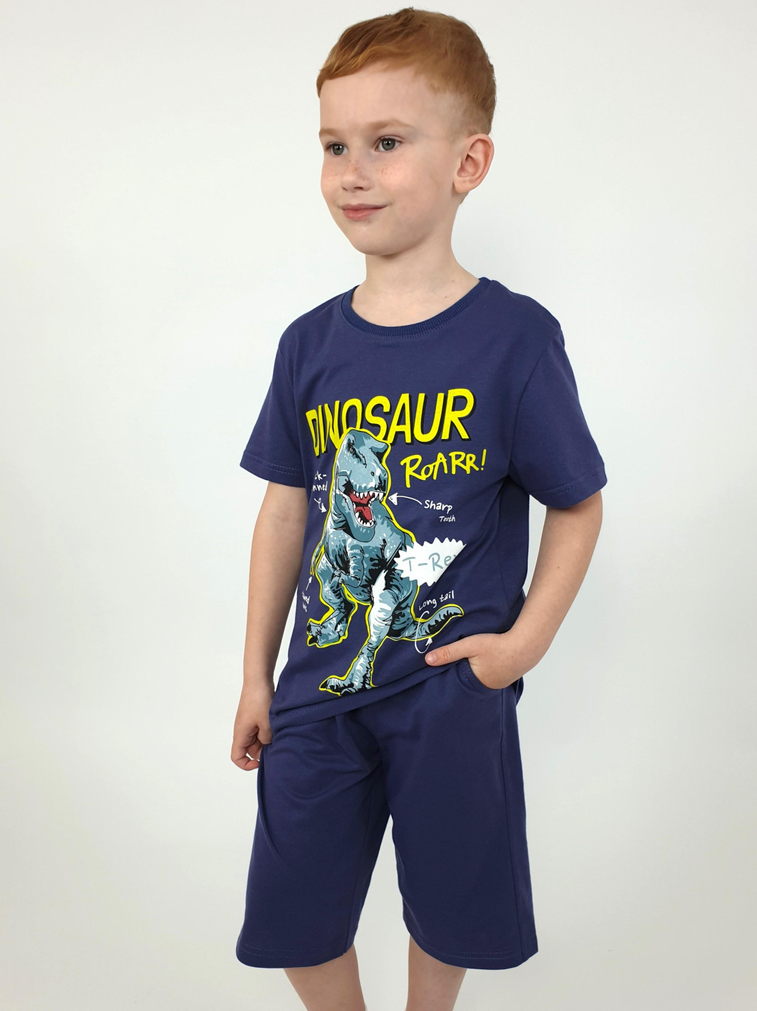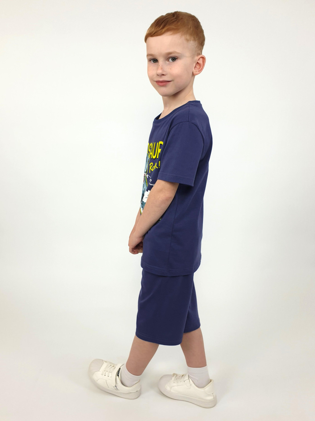 Кулирное полотно: 100% х/б. Фуфайка-прямая с печатью,короткий втачной рукав.Горловина обработана ластиком. Шорты-удлиненные с притачным поясом и резинкой.Два кармана на переде.