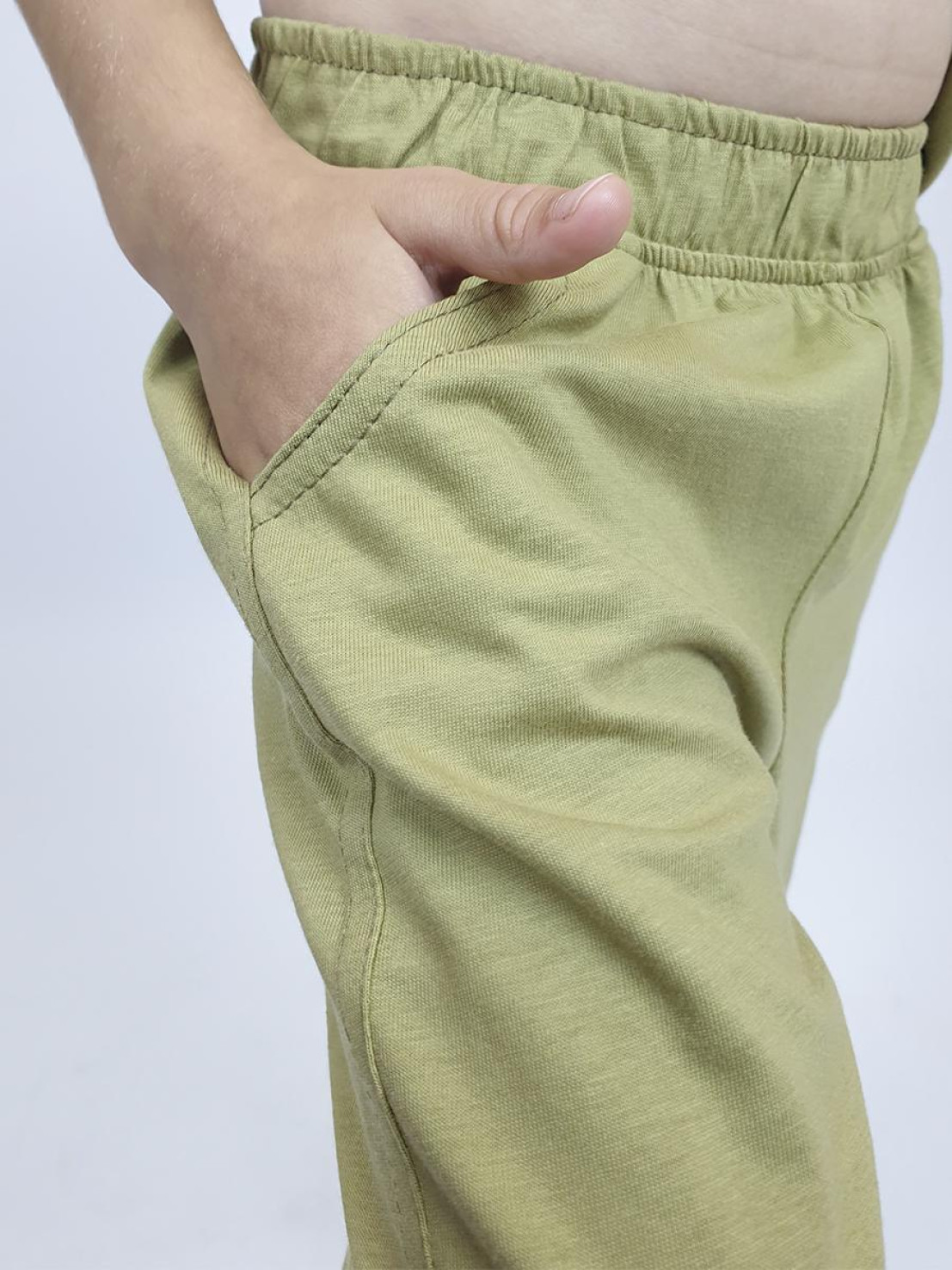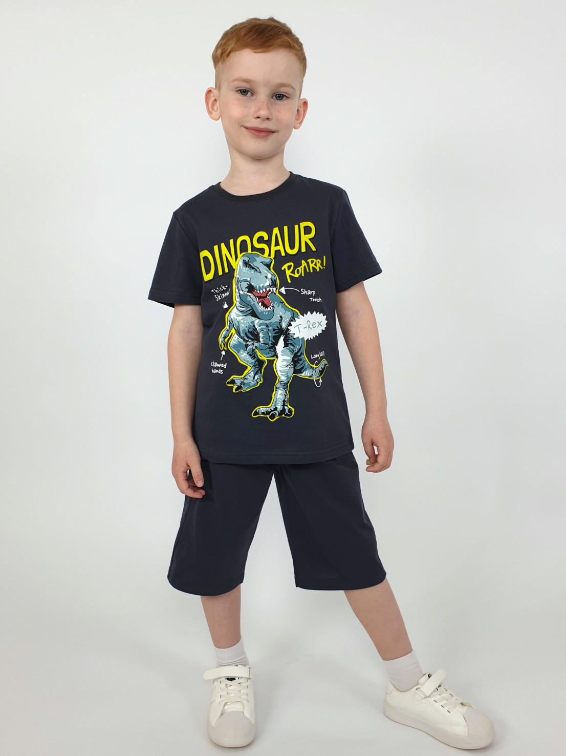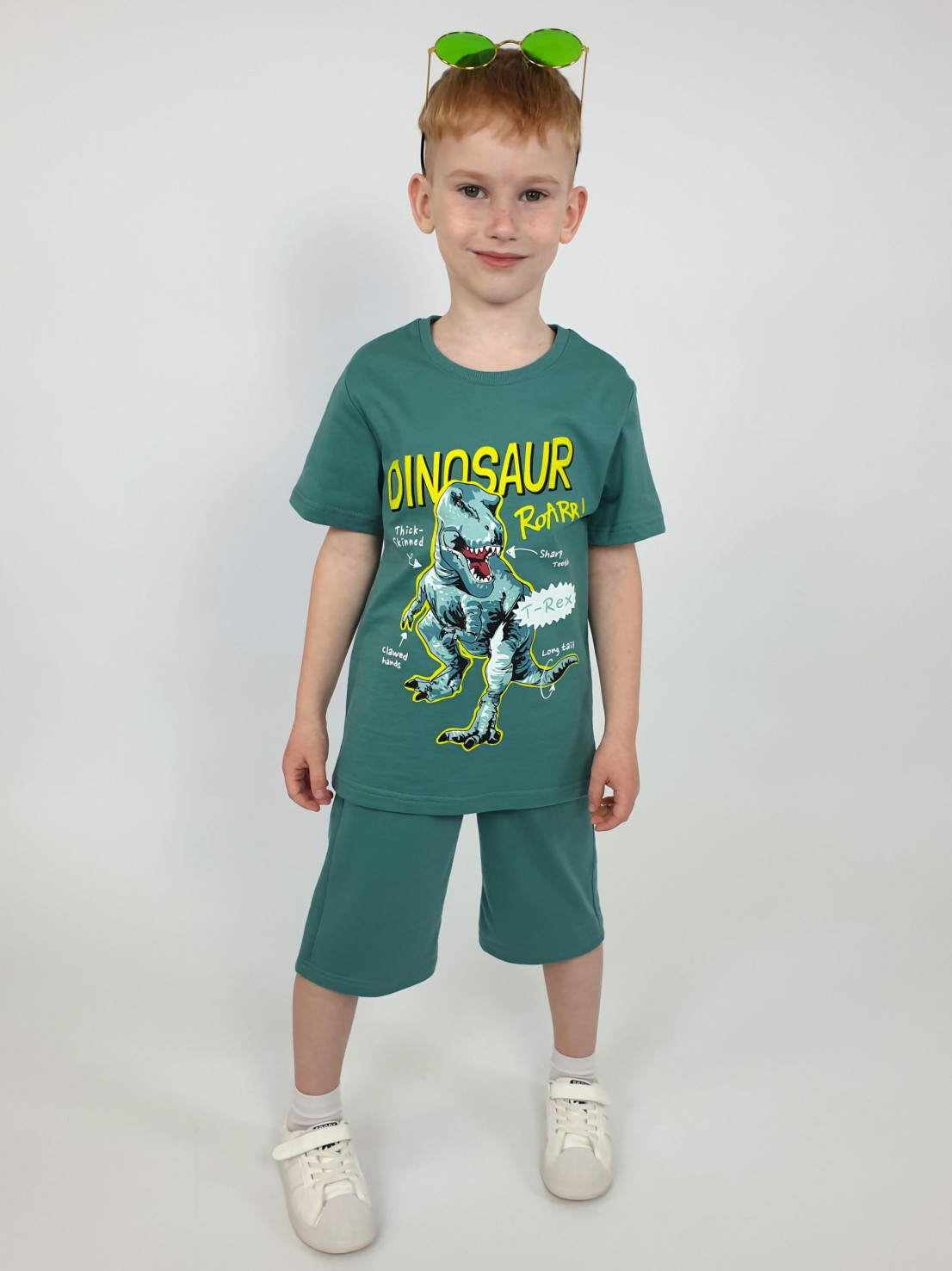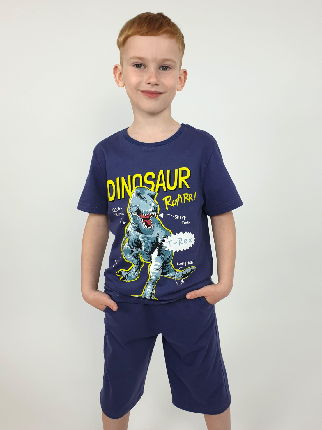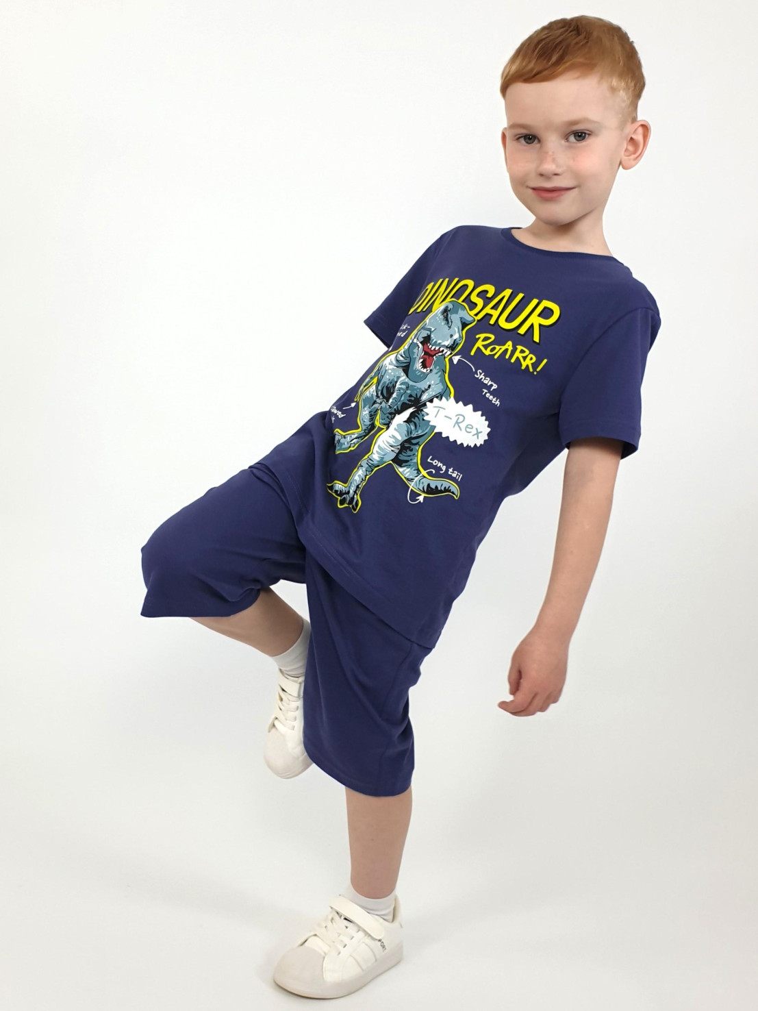 Кулирное полотно: 100% х/б. Фуфайка-прямая с печатью,короткий втачной рукав.Горловина обработана ластиком. Шорты-удлиненные с притачным поясом и резинкой.Два кармана на переде.