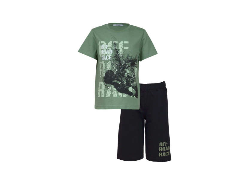 Кулирное полотно: 100% х/б. Фуфайка-прямая с печатью,короткий втачной рукав.Горловина обработана ластиком. Шорты-удлиненные с притачным поясом и резинкой.Два кармана на переде.Печать-слева,внизу на передней половинке.