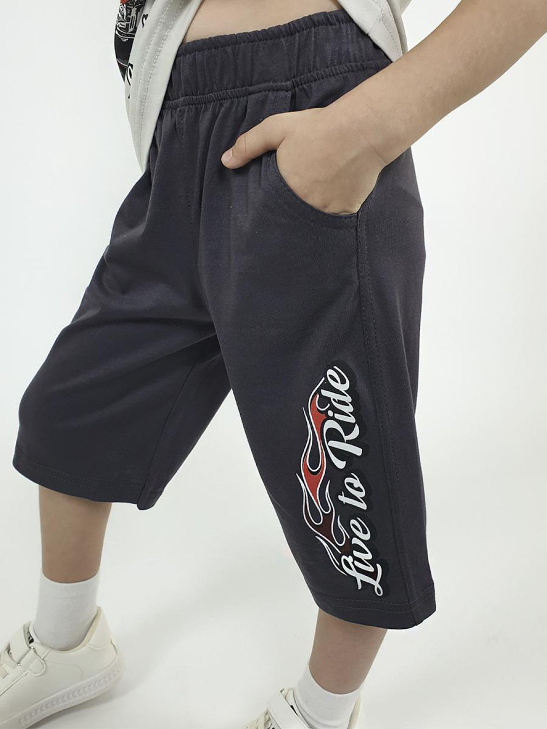 Кулирное полотно: 100% х/б. Фуфайка-прямая,короткий втачной рукав.Перед с печатью.Горловина обработана ластиком. Шорты-удлиненные с притачным поясом и резинкой.Печать на левой передней половинке.Два кармана на переде.