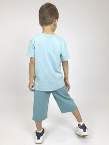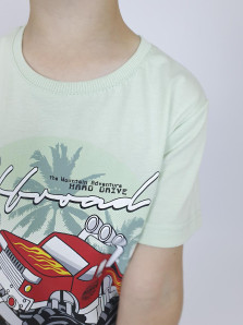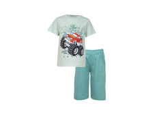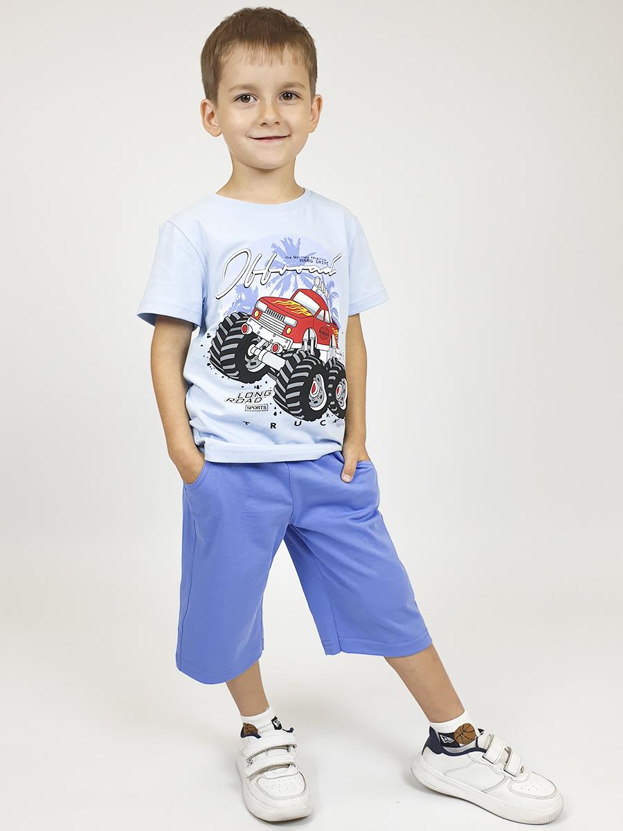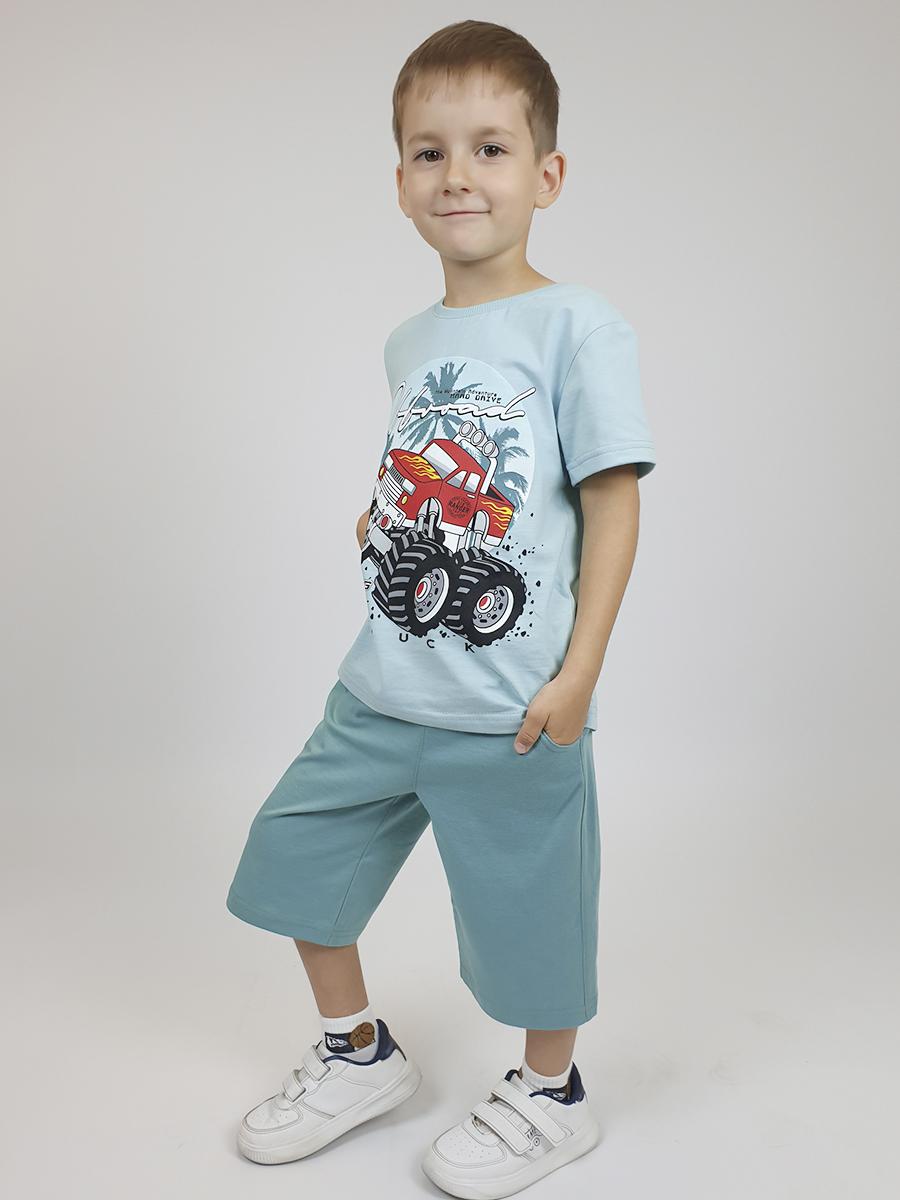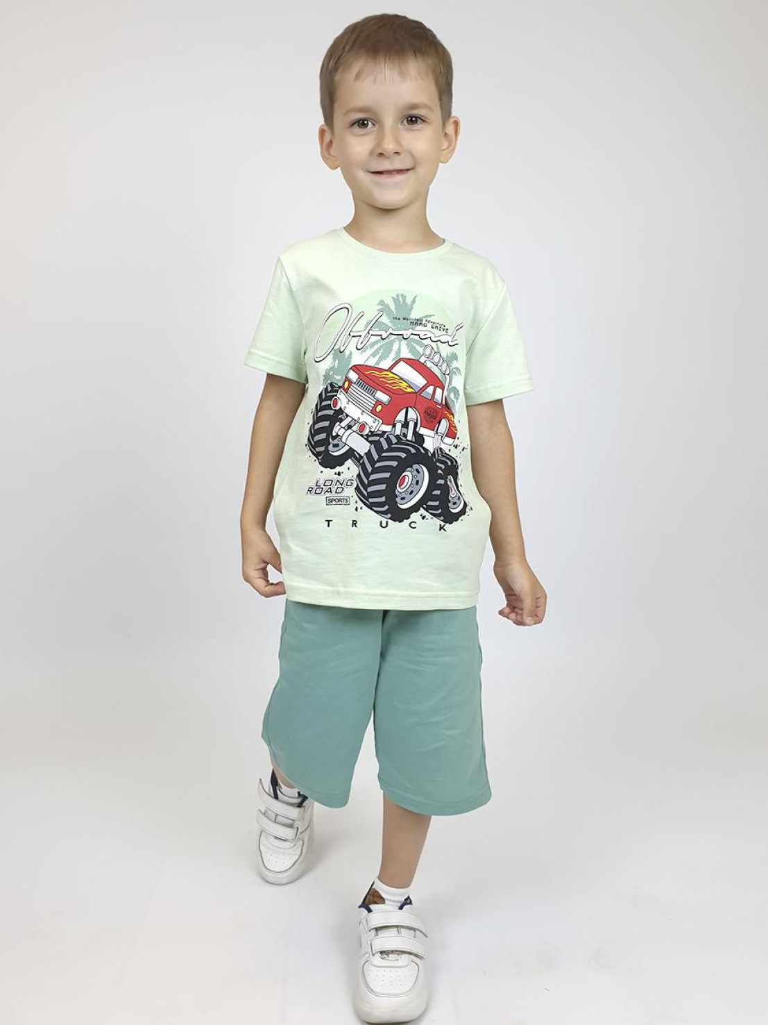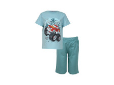 Кулирное полотно: 100% х/б,серый меланж 50% х/б,50% п/э. Фуфайка-прямая с печатью,короткий втачной рукав.Горловина обработана ластиком. Шорты-удлиненные с притачным поясом и резинкой.Два кармана на переде.