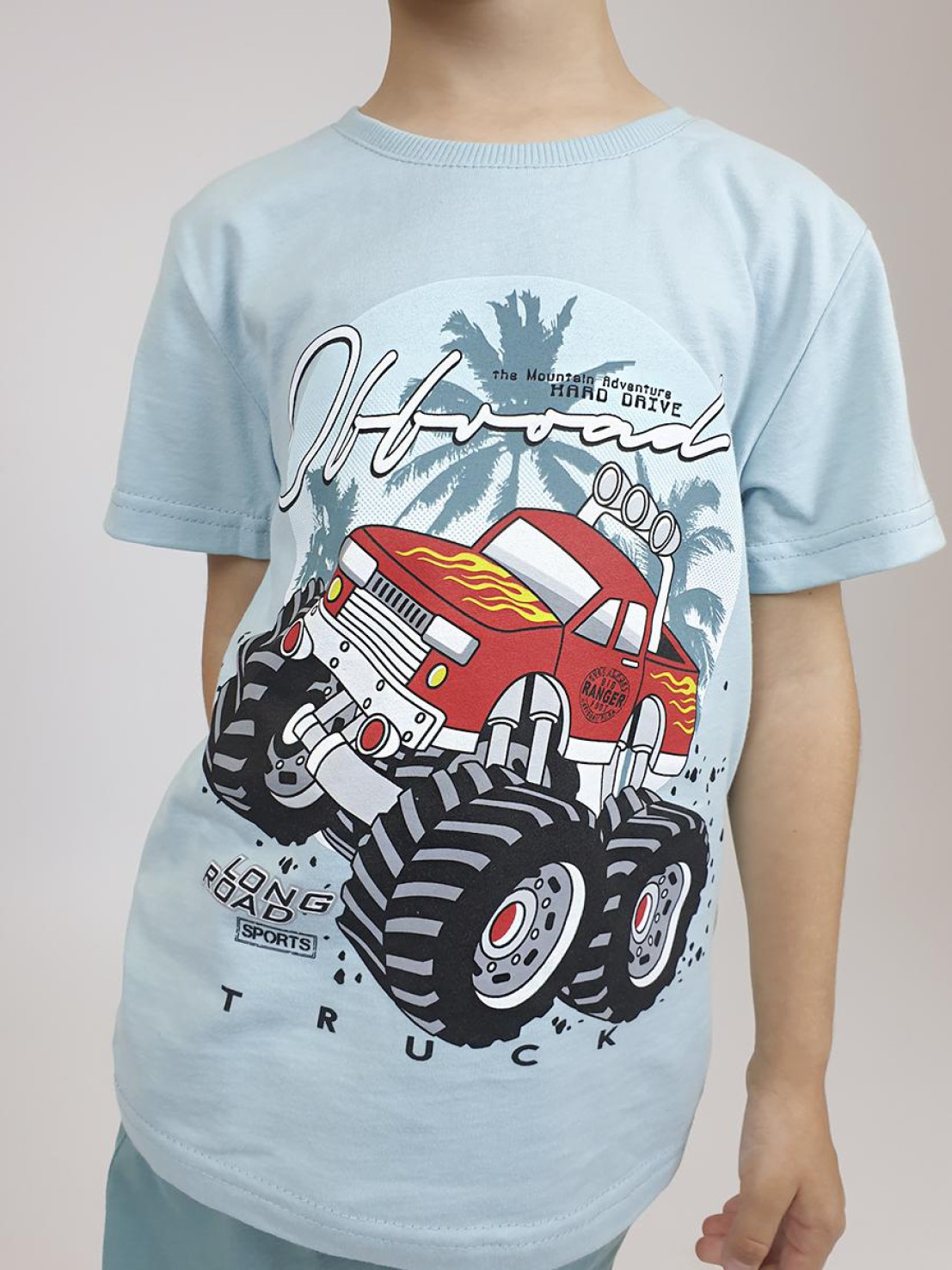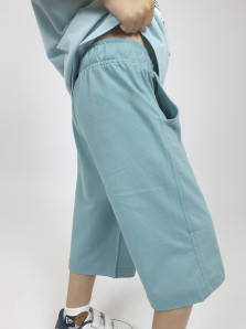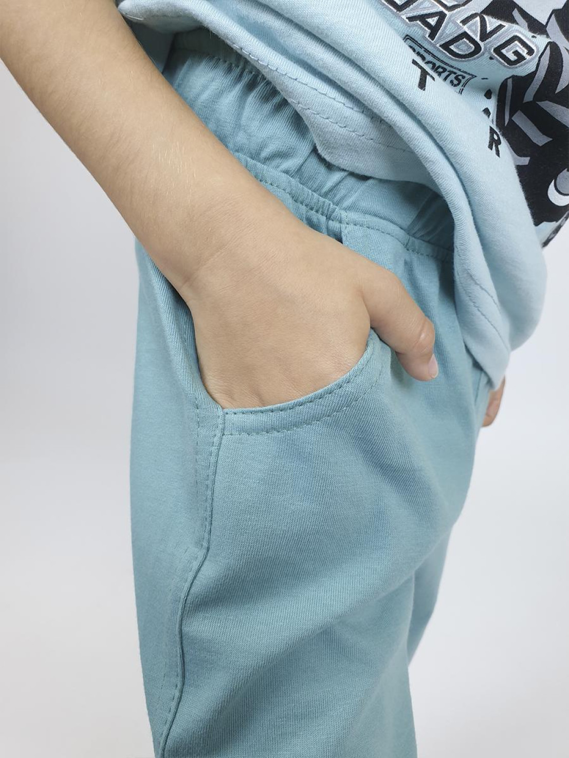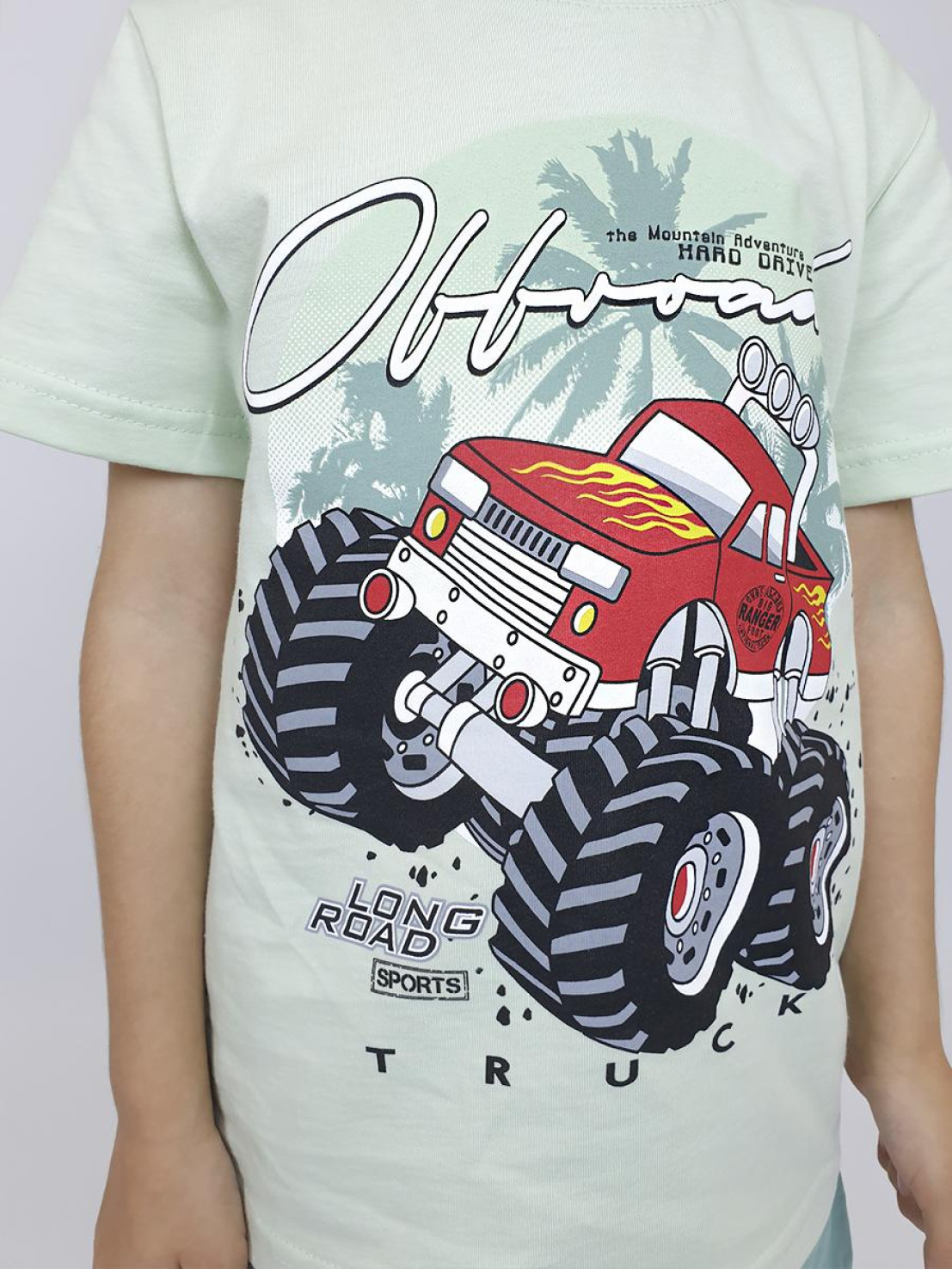 Кулирное полотно: 100% х/б,серый меланж 50% х/б,50% п/э. Фуфайка-прямая с печатью,короткий втачной рукав.Горловина обработана ластиком. Шорты-удлиненные с притачным поясом и резинкой.Два кармана на переде.