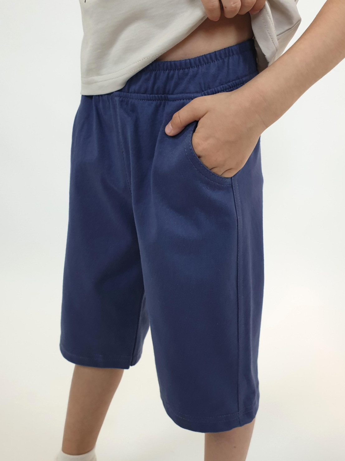 Кулирное полотно: 100% х/б. Фуфайка-прямая с печатью,короткий втачной рукав.Горловина обработана ластиком. Шорты-удлиненные с притачным поясом и резинкой.Два кармана на переде.