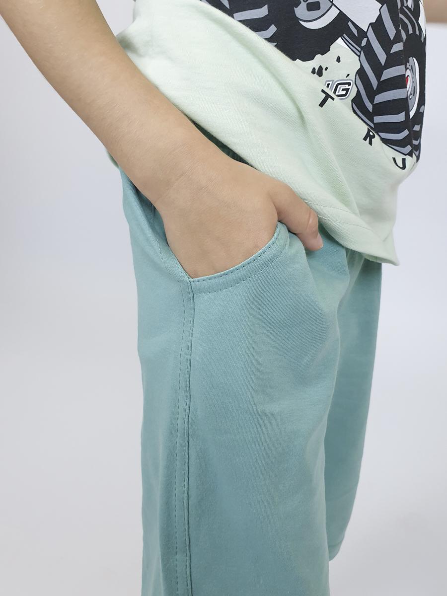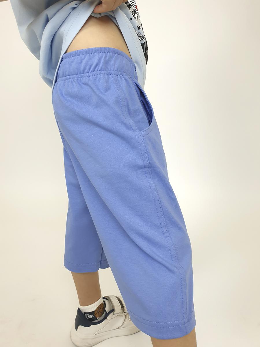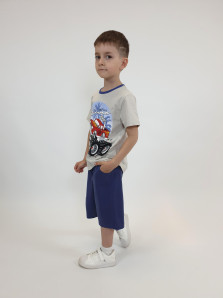 Кулирное полотно: 100% х/б. Фуфайка-прямая с печатью,короткий втачной рукав.Горловина обработана ластиком. Шорты-удлиненные с притачным поясом и резинкой.Два кармана на переде.