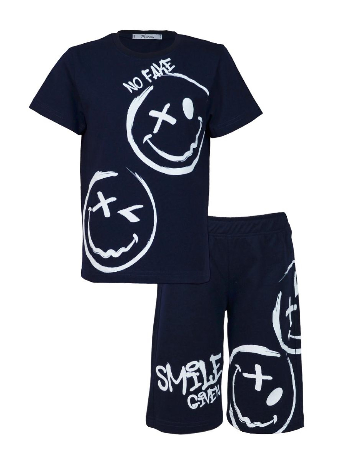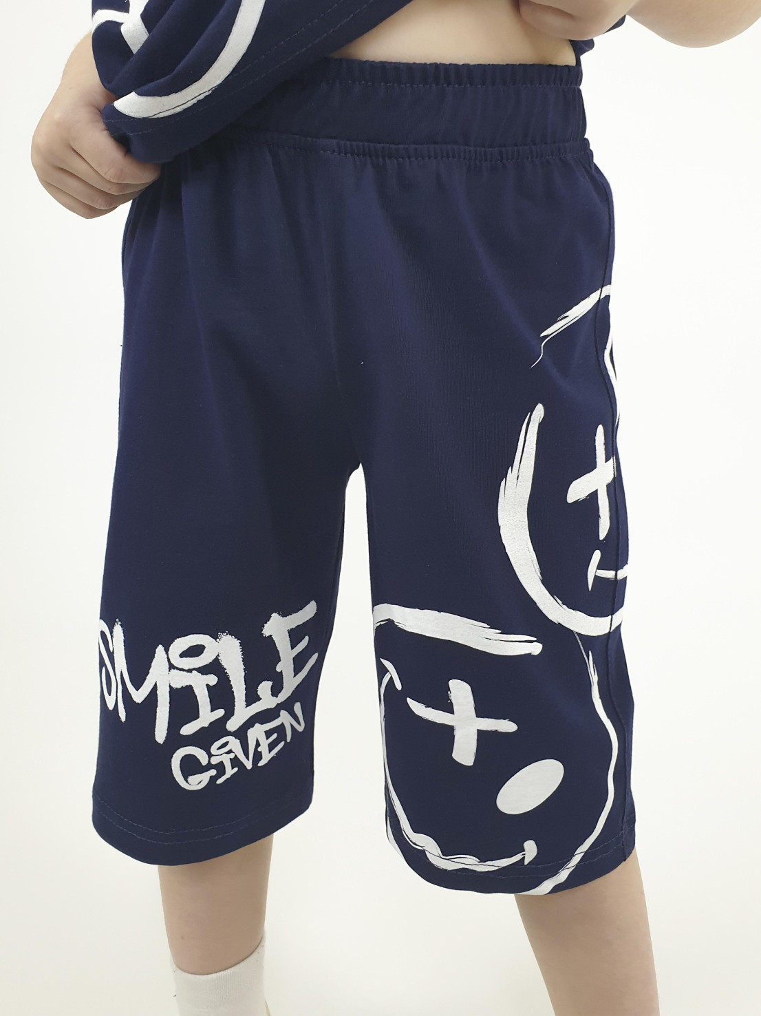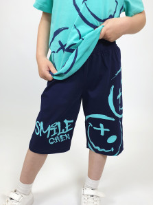 Кулирное полотно: 100% х/б. Фуфайка-прямая,короткий втачной рукав,перед с печатью.Горловина обработана ластиком. Шорты-удлиненные с притачным поясом,с резинкой.Печать на правой передней половинке внизу и левой стороне(сзади на перед).