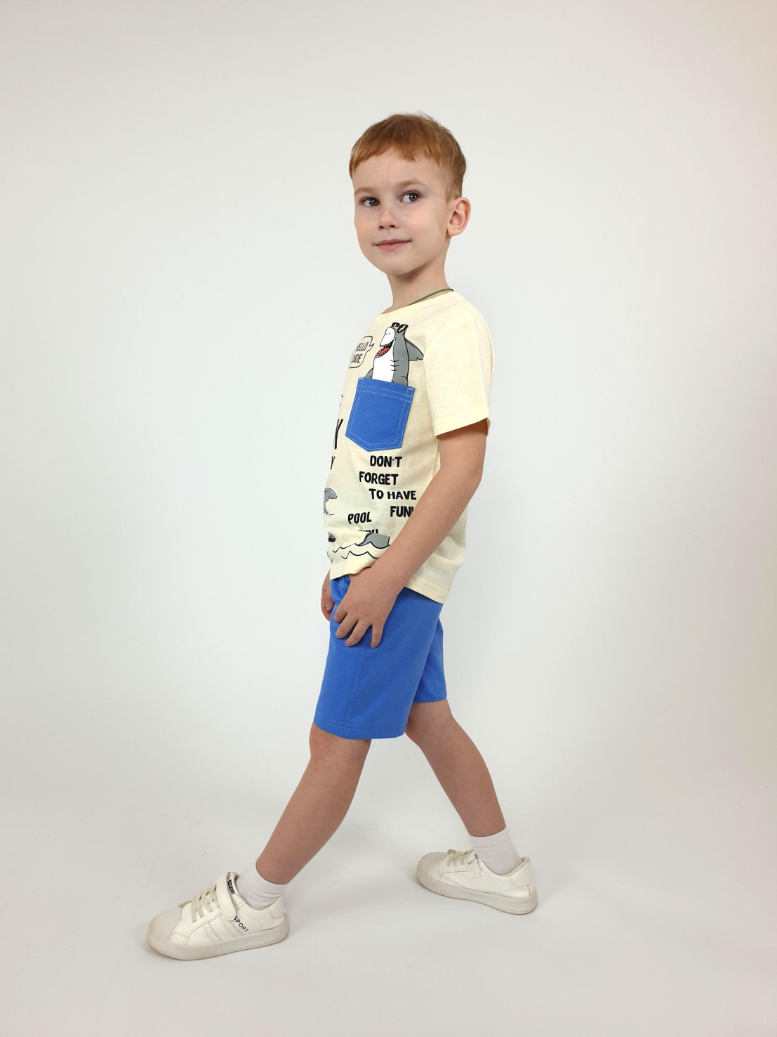Кулирное полотно: 100% х/б. Фуфайка-прямая,короткий втачной рукав,перед с печатью и отделочным карманом.Горловина обработана ластиком. Шорты -укороченные с притачным поясом и резинкой.Два боковых кармана по переду,иммитация гульфика.
