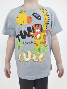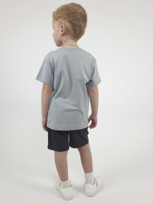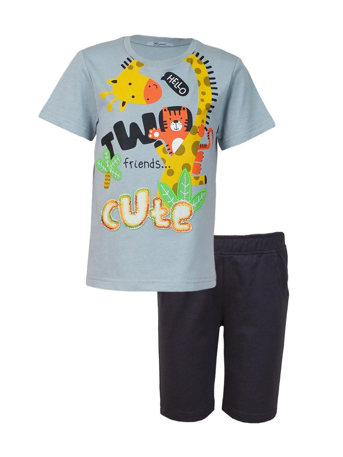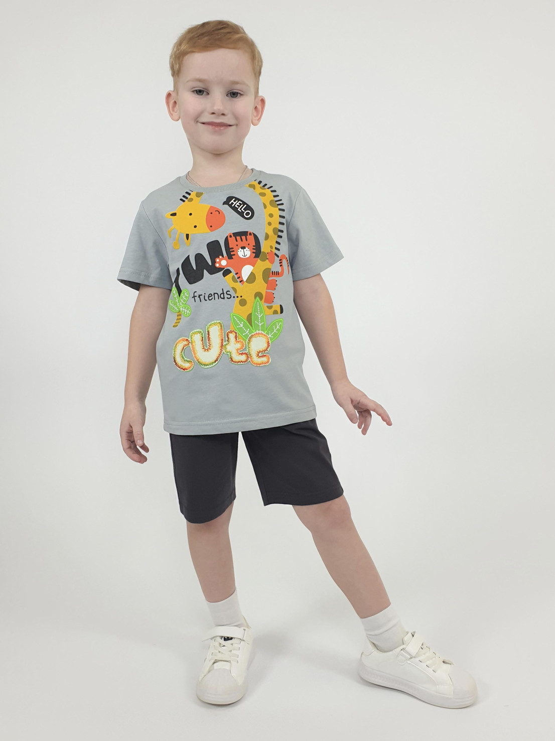 Кулирное полотно: 100% х/б. Фуфайка-прямая,перед с печатью и вышивкой.Рукав втачной,короткий.Горловина обработана ластиком. Шорты-укороченные с притачным поясом и резинкой.Два боковых кармана.