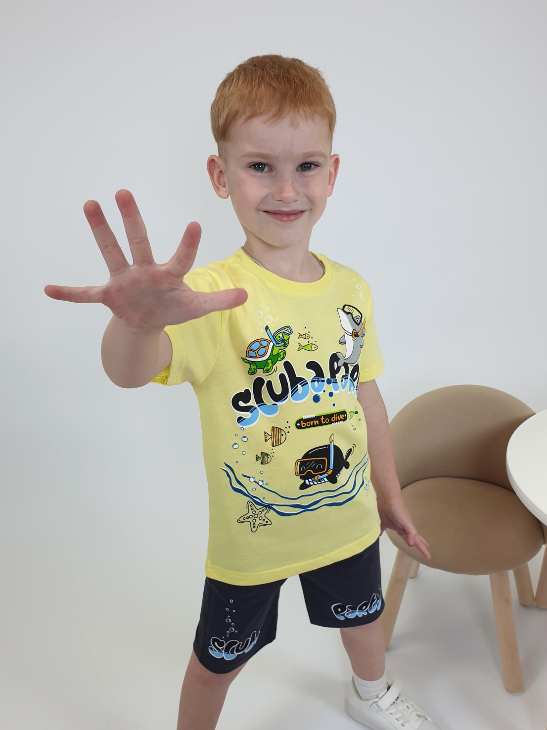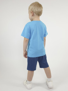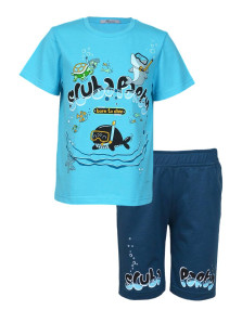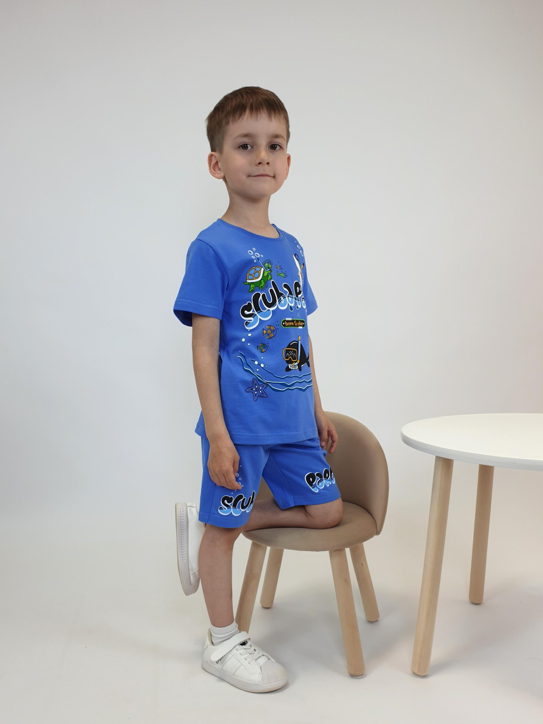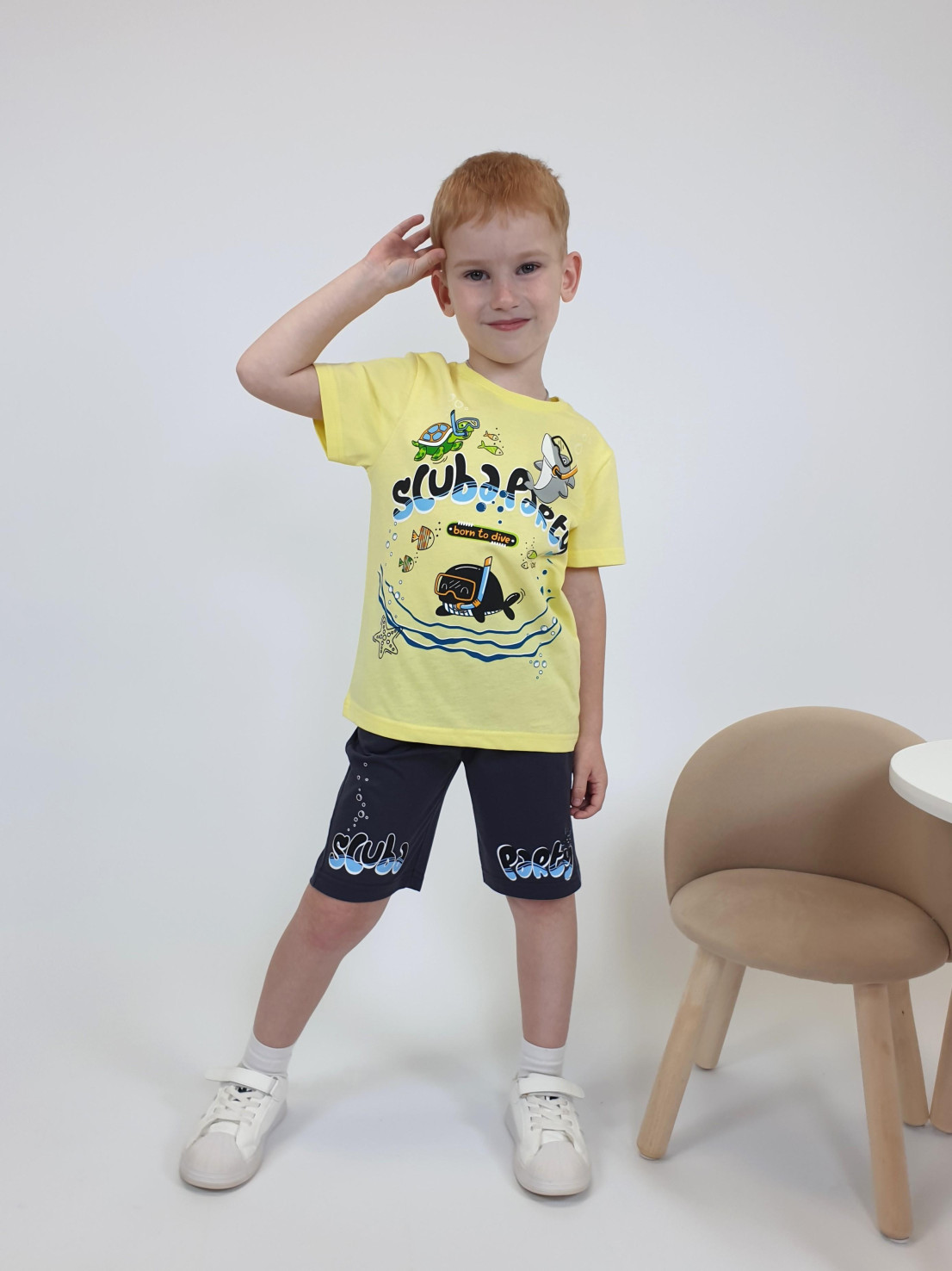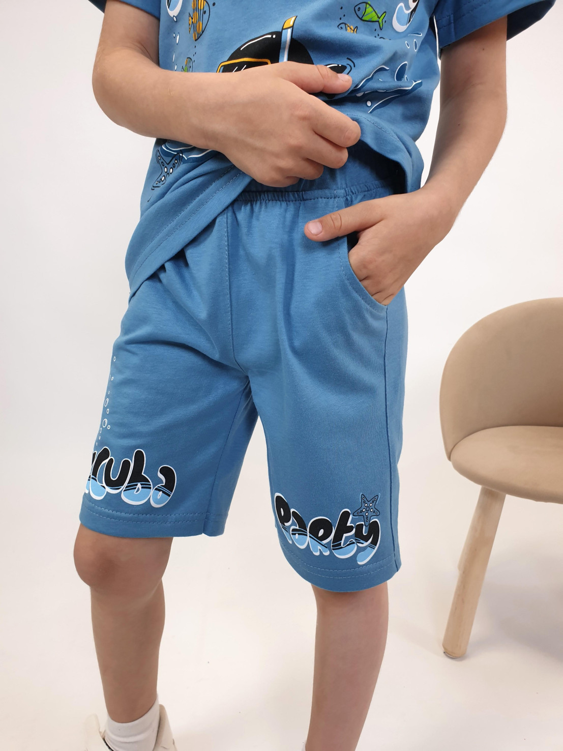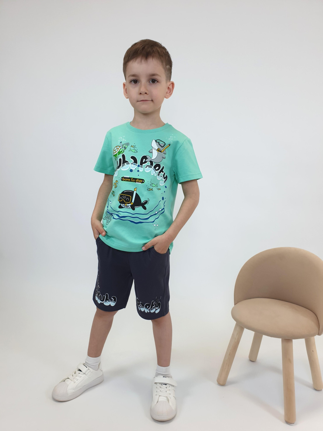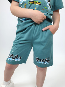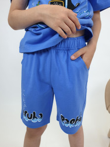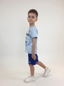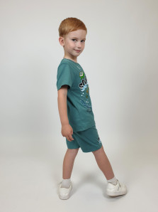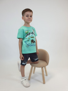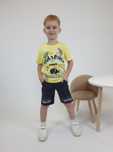 Кулирное полотно: 100% х/б. Фуфайка-прямая,перед с печатью.Рукав втачной,короткий.Горловина обработана ластиком. Шорты-укороченные с притачным поясом и резинкой.Два боковых кармана по переду.Печать на передних половинках внизу.