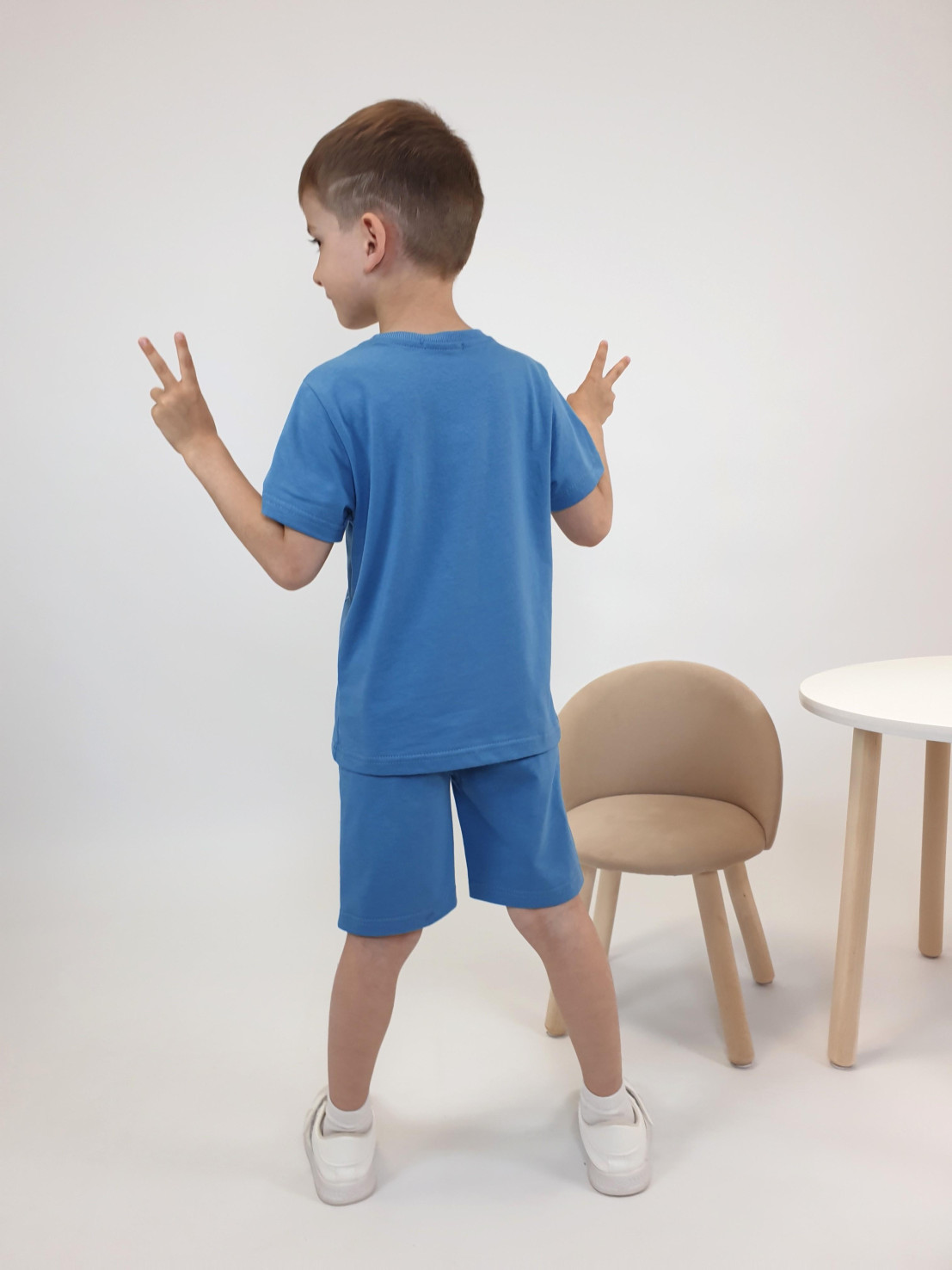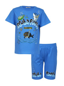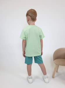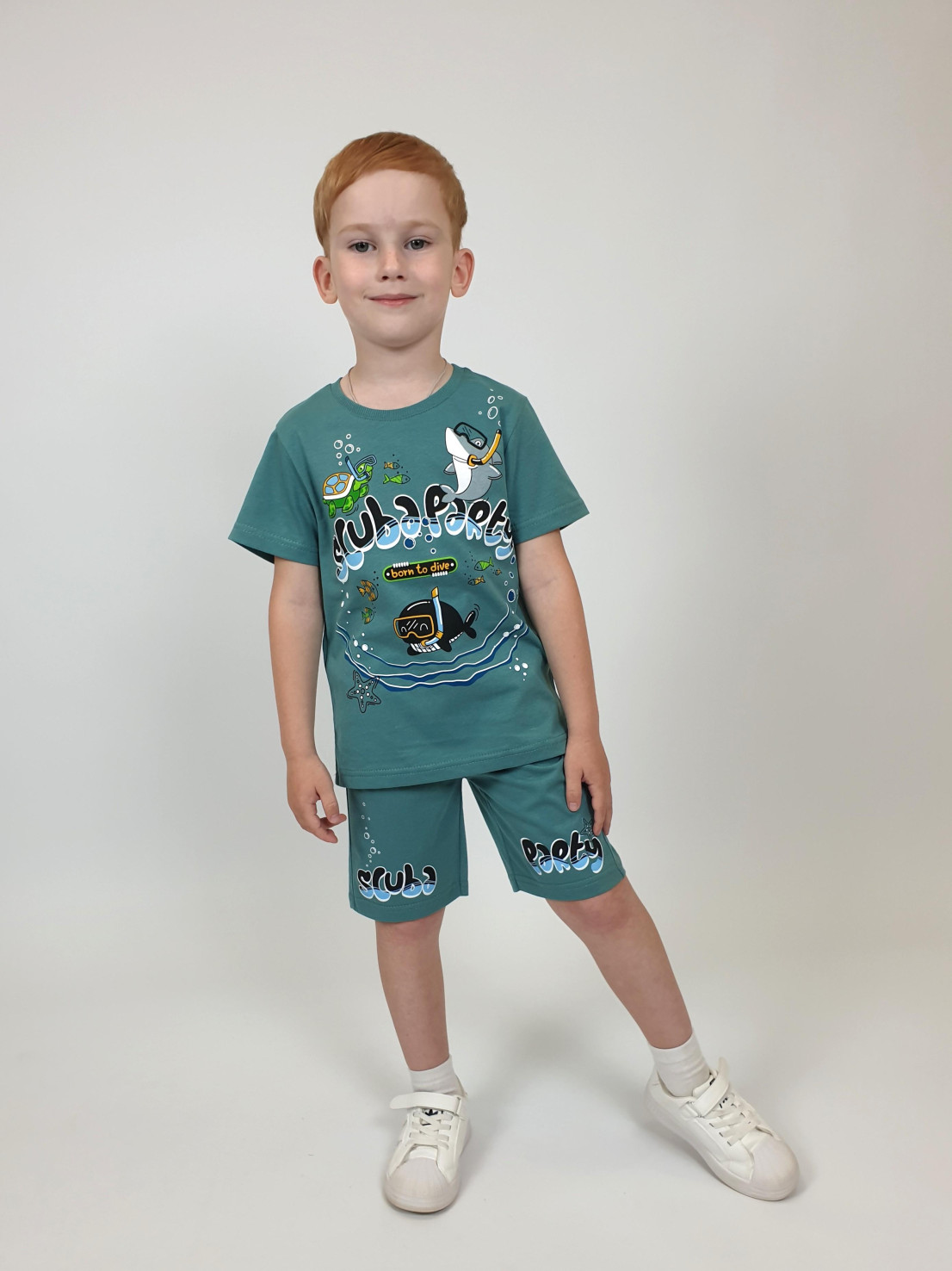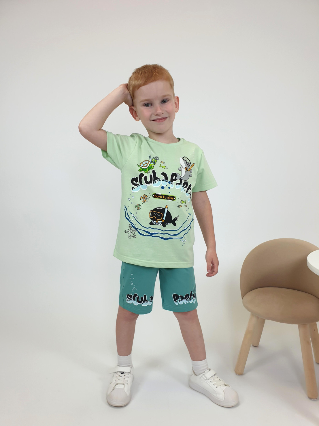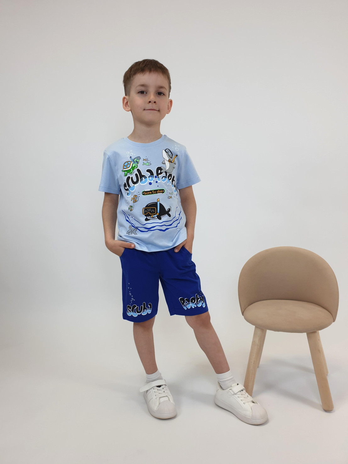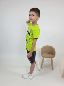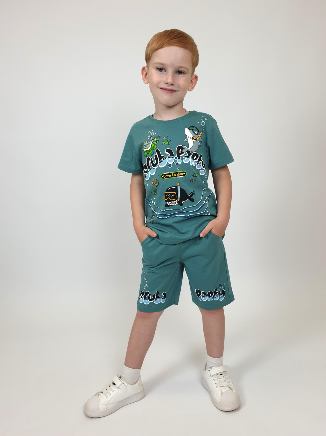 Кулирное полотно: 100% х/б. Фуфайка-прямая,перед с печатью.Рукав втачной,короткий.Горловина обработана ластиком. Шорты-укороченные с притачным поясом и резинкой.Два боковых кармана по переду.Печать на передних половинках внизу.