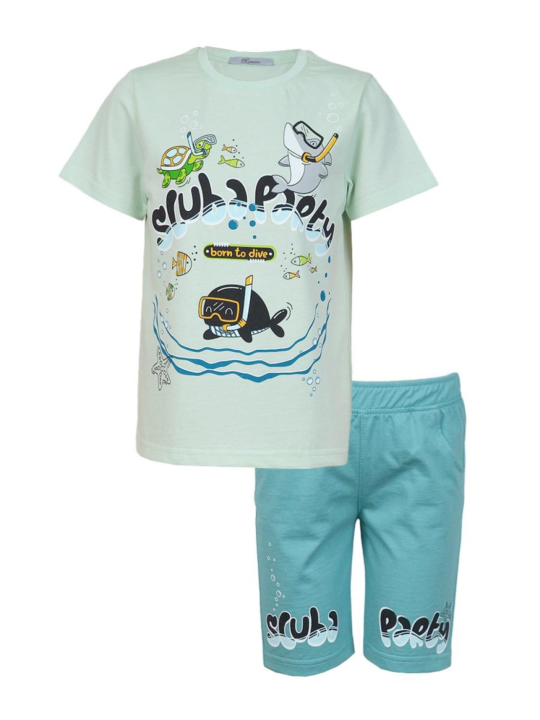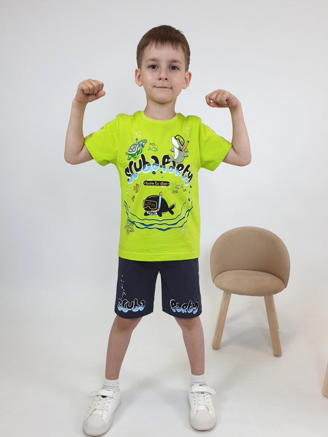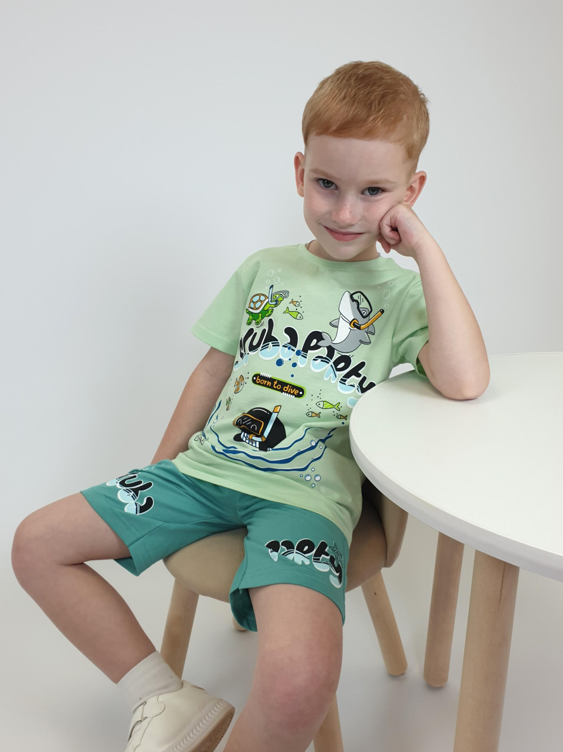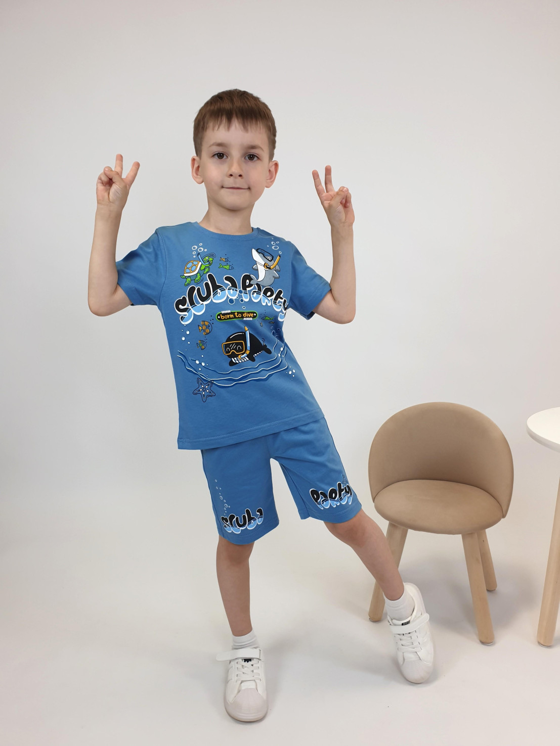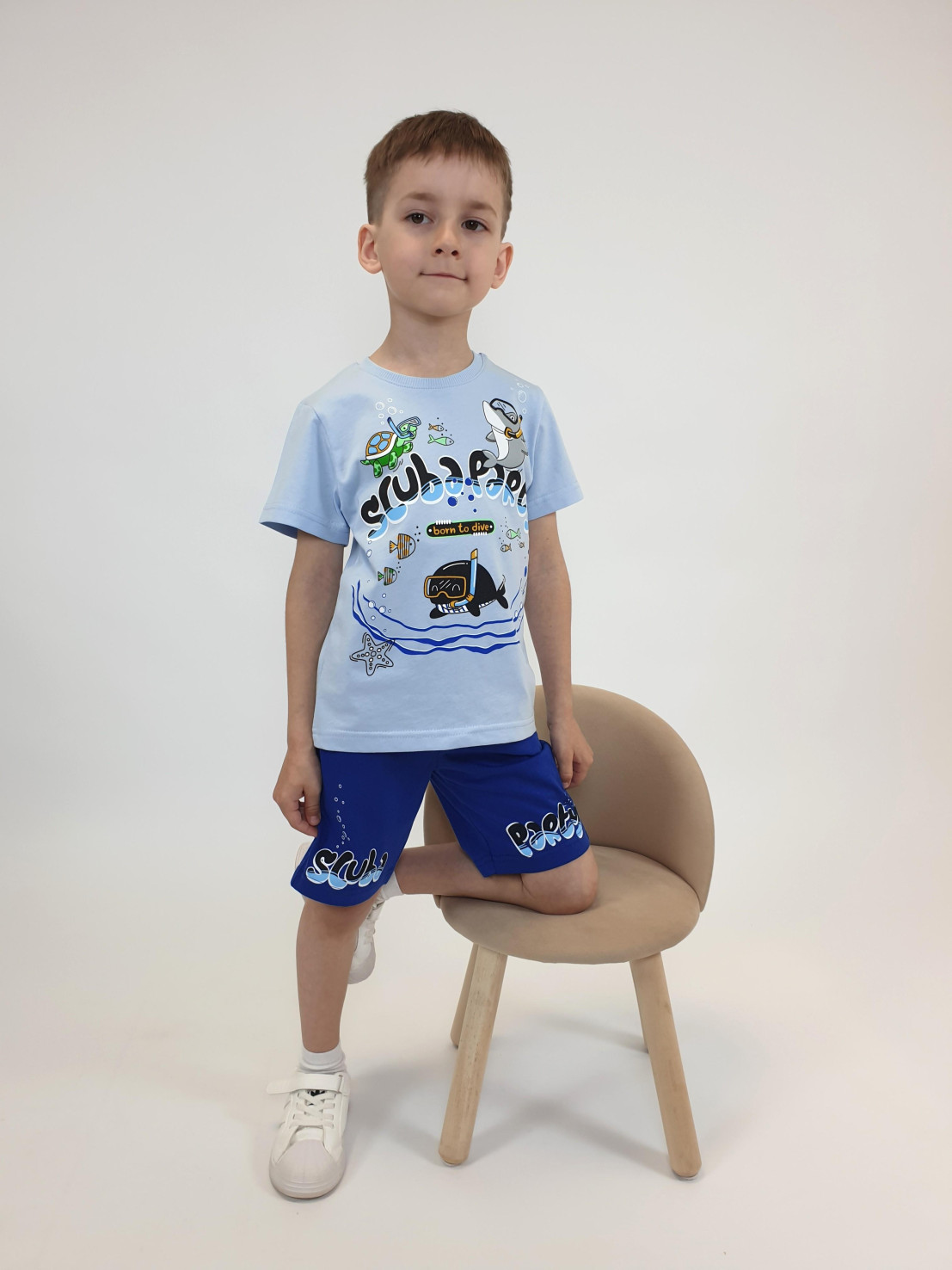 Кулирное полотно: 100% х/б. Фуфайка-прямая,перед с печатью.Рукав втачной,короткий.Горловина обработана ластиком. Шорты-укороченные с притачным поясом и резинкой.Два боковых кармана по переду.Печать на передних половинках внизу.