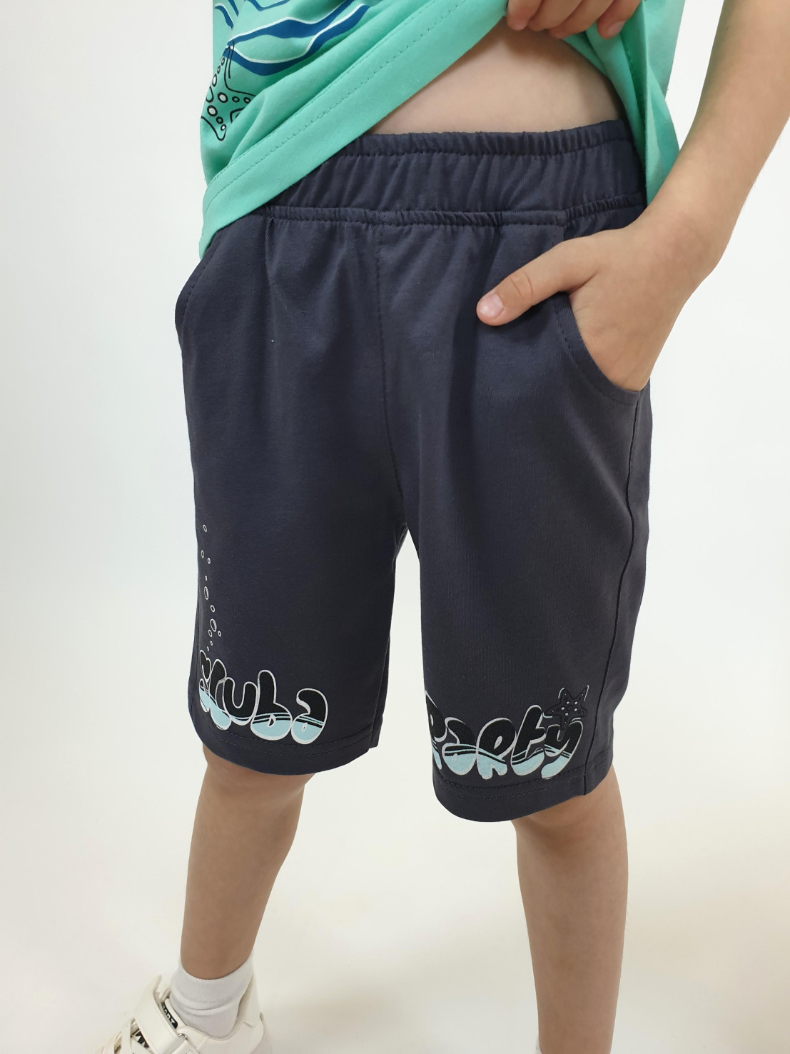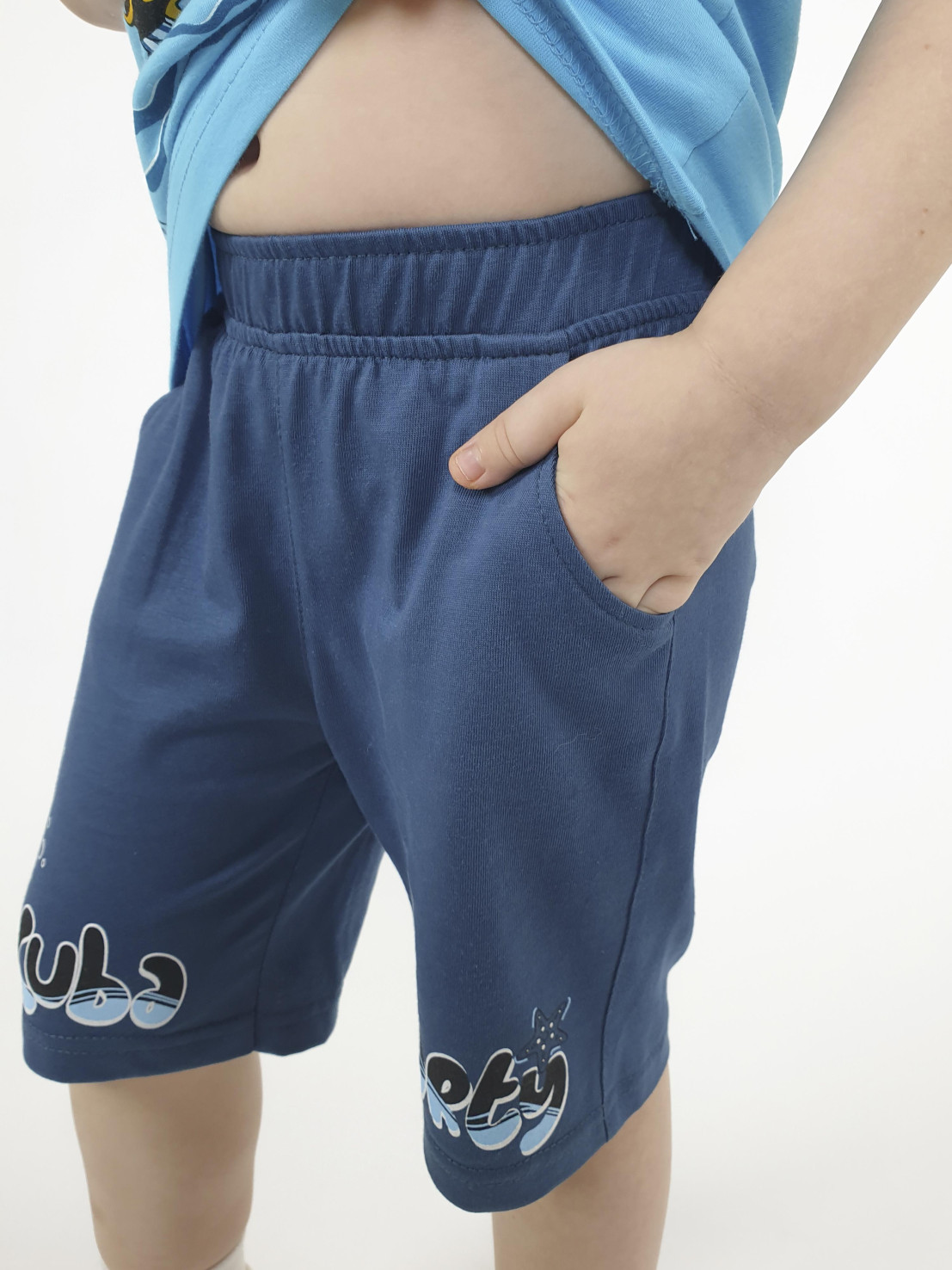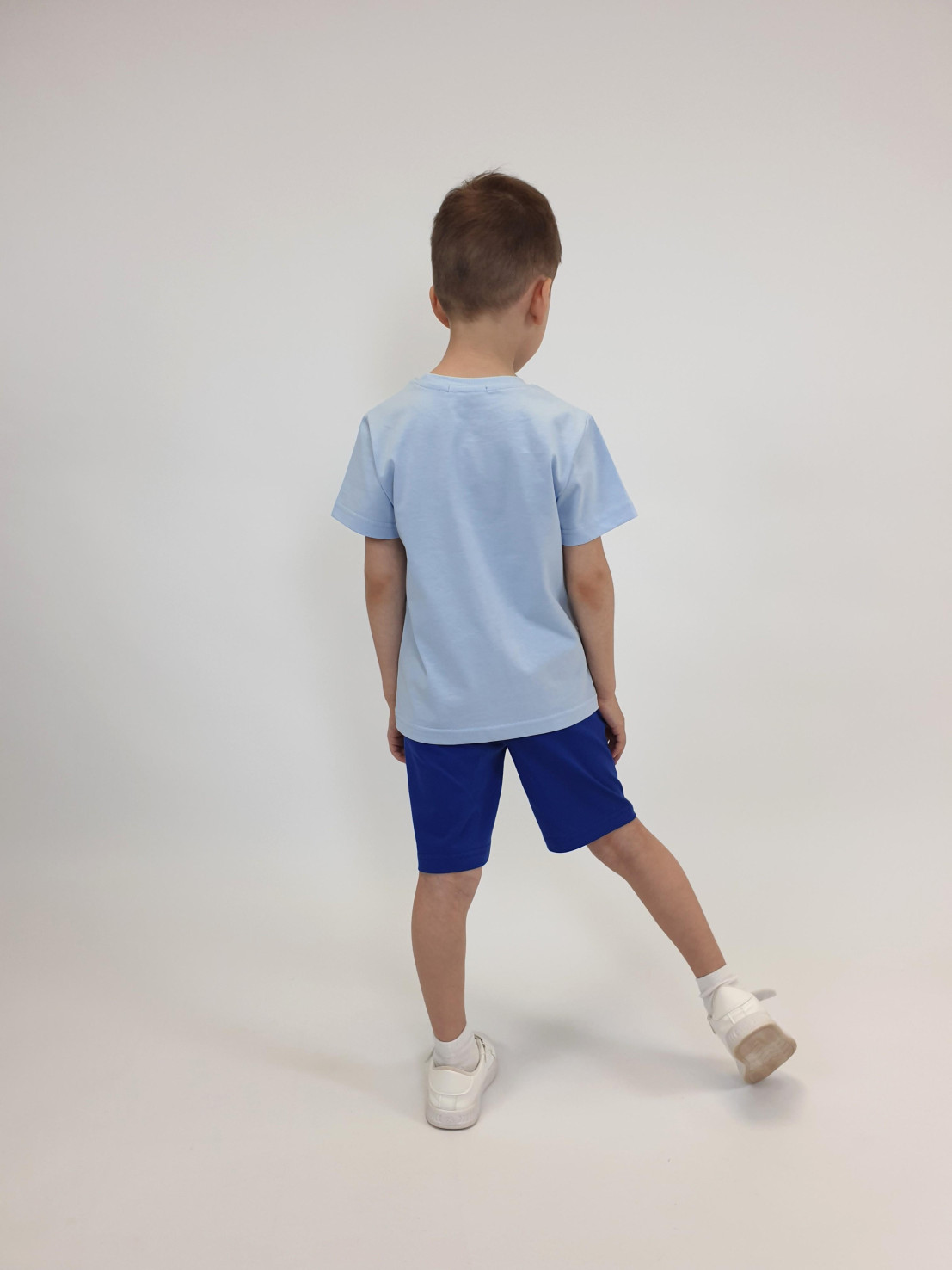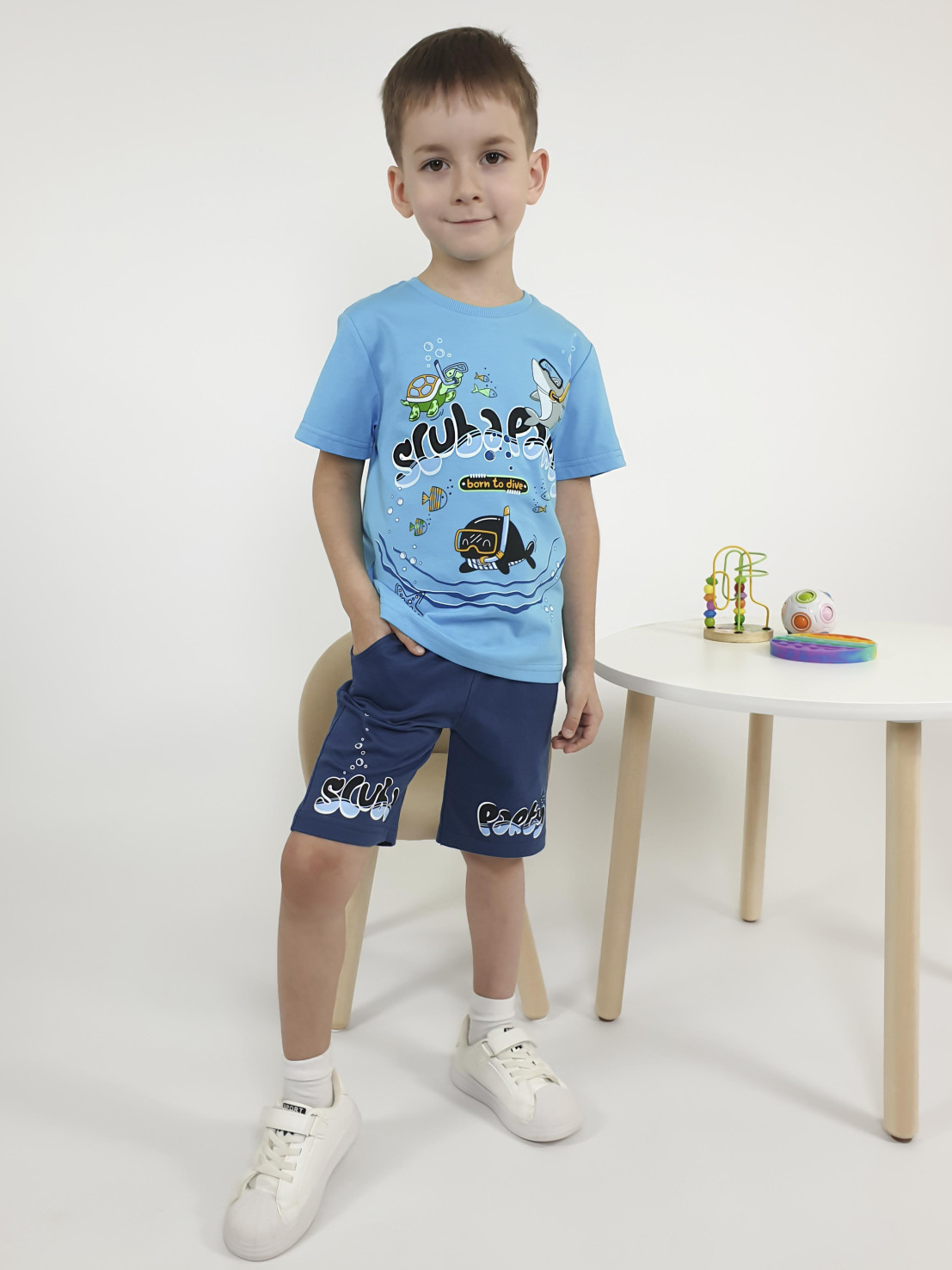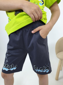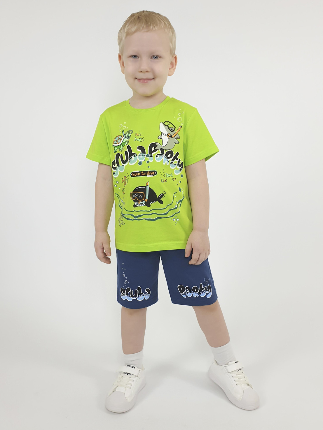 Кулирное полотно: 100% х/б. Фуфайка-прямая,перед с печатью.Рукав втачной,короткий.Горловина обработана ластиком. Шорты-укороченные с притачным поясом и резинкой.Два боковых кармана по переду.Печать на передних половинках внизу.