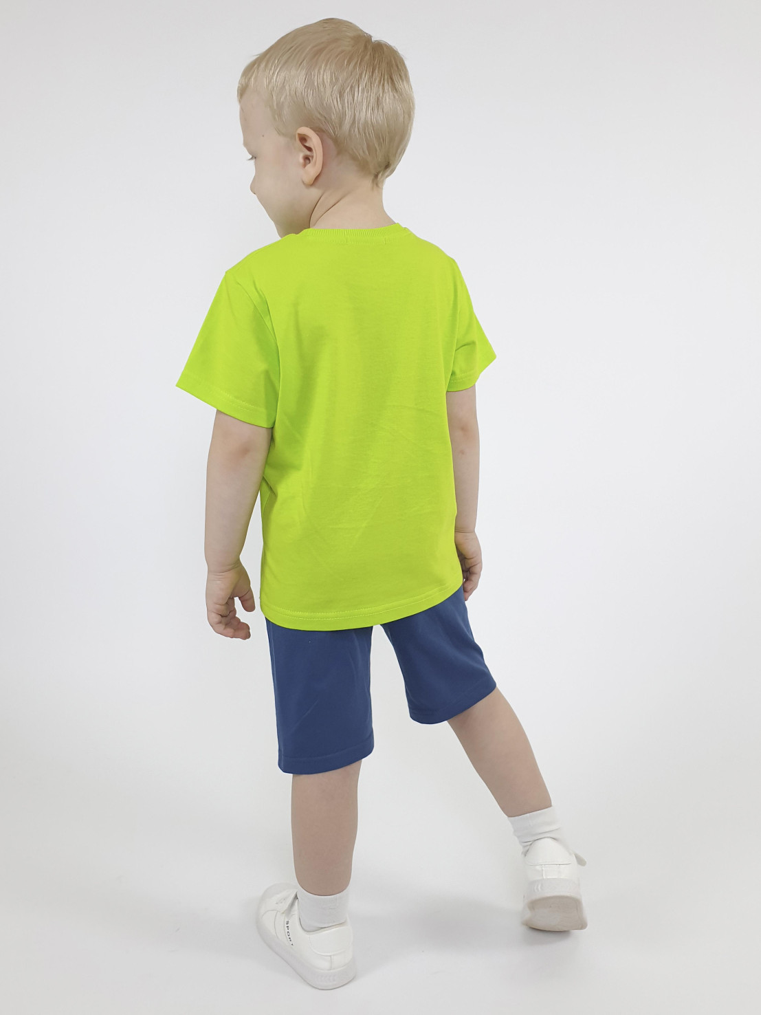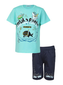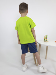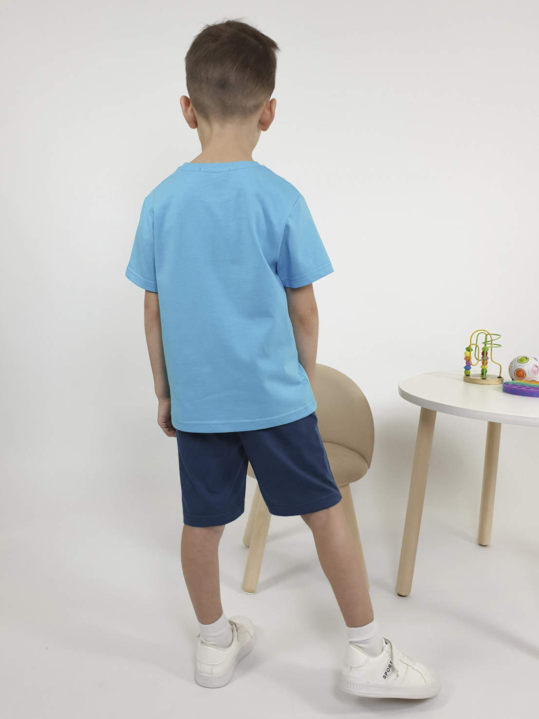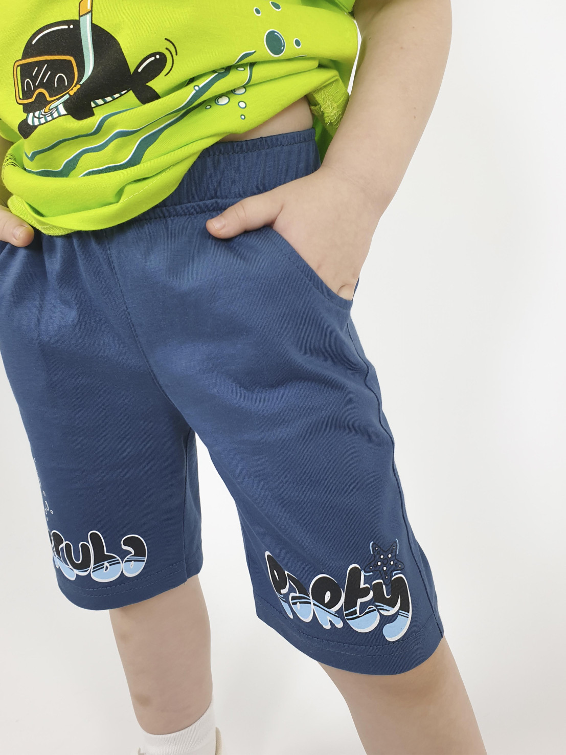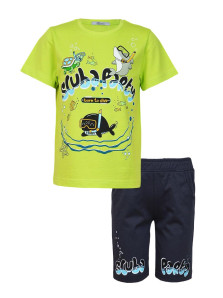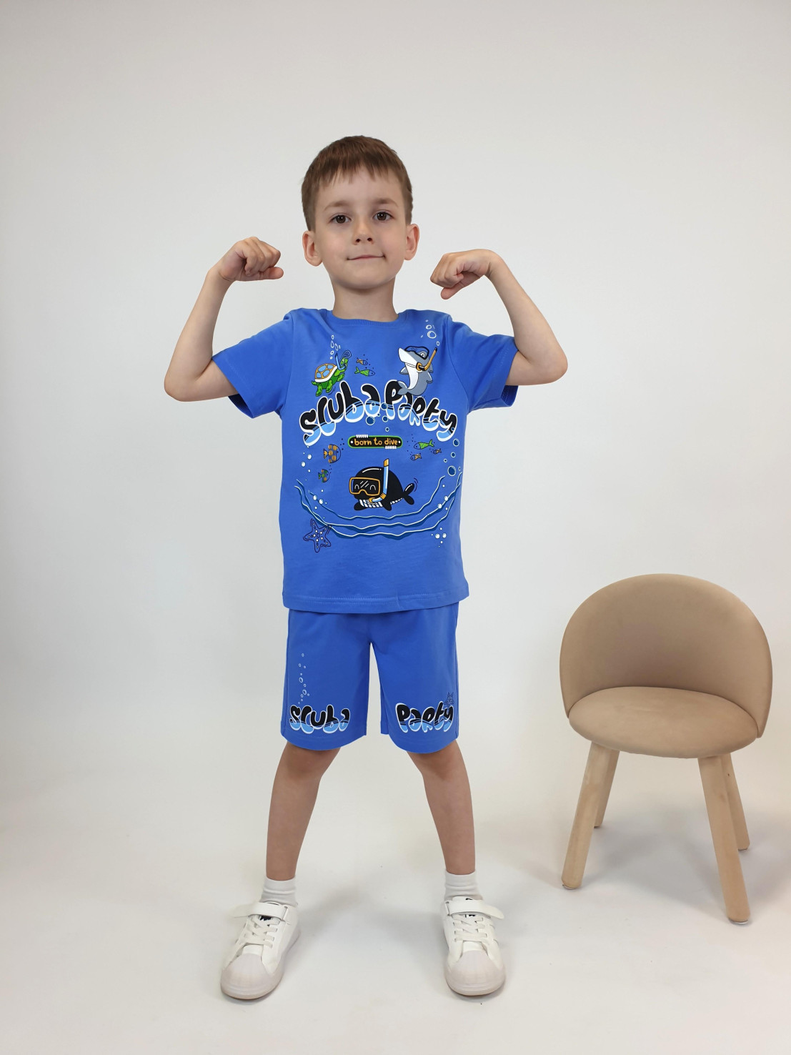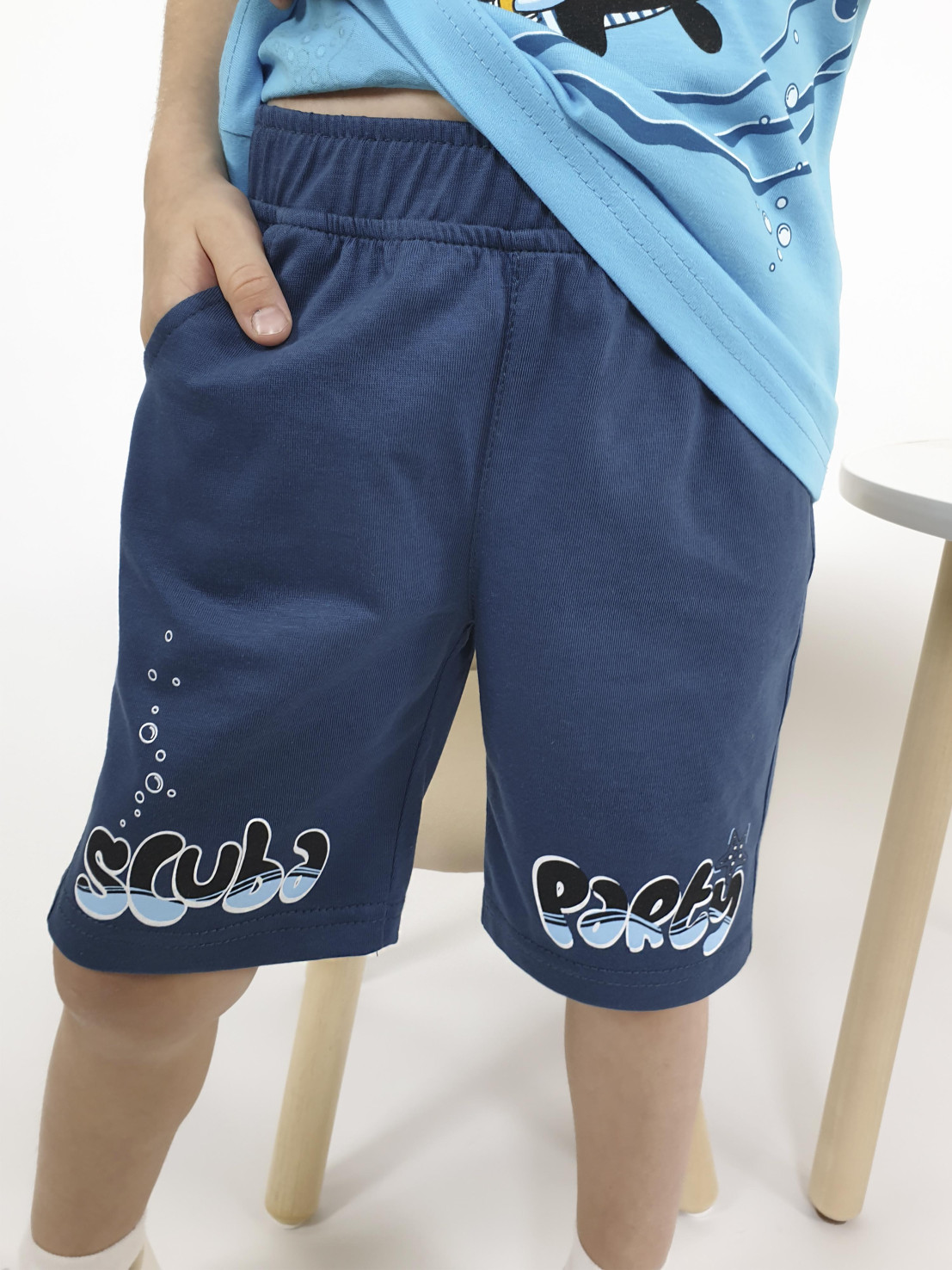 Кулирное полотно: 100% х/б. Фуфайка-прямая,перед с печатью.Рукав втачной,короткий.Горловина обработана ластиком. Шорты-укороченные с притачным поясом и резинкой.Два боковых кармана по переду.Печать на передних половинках внизу.