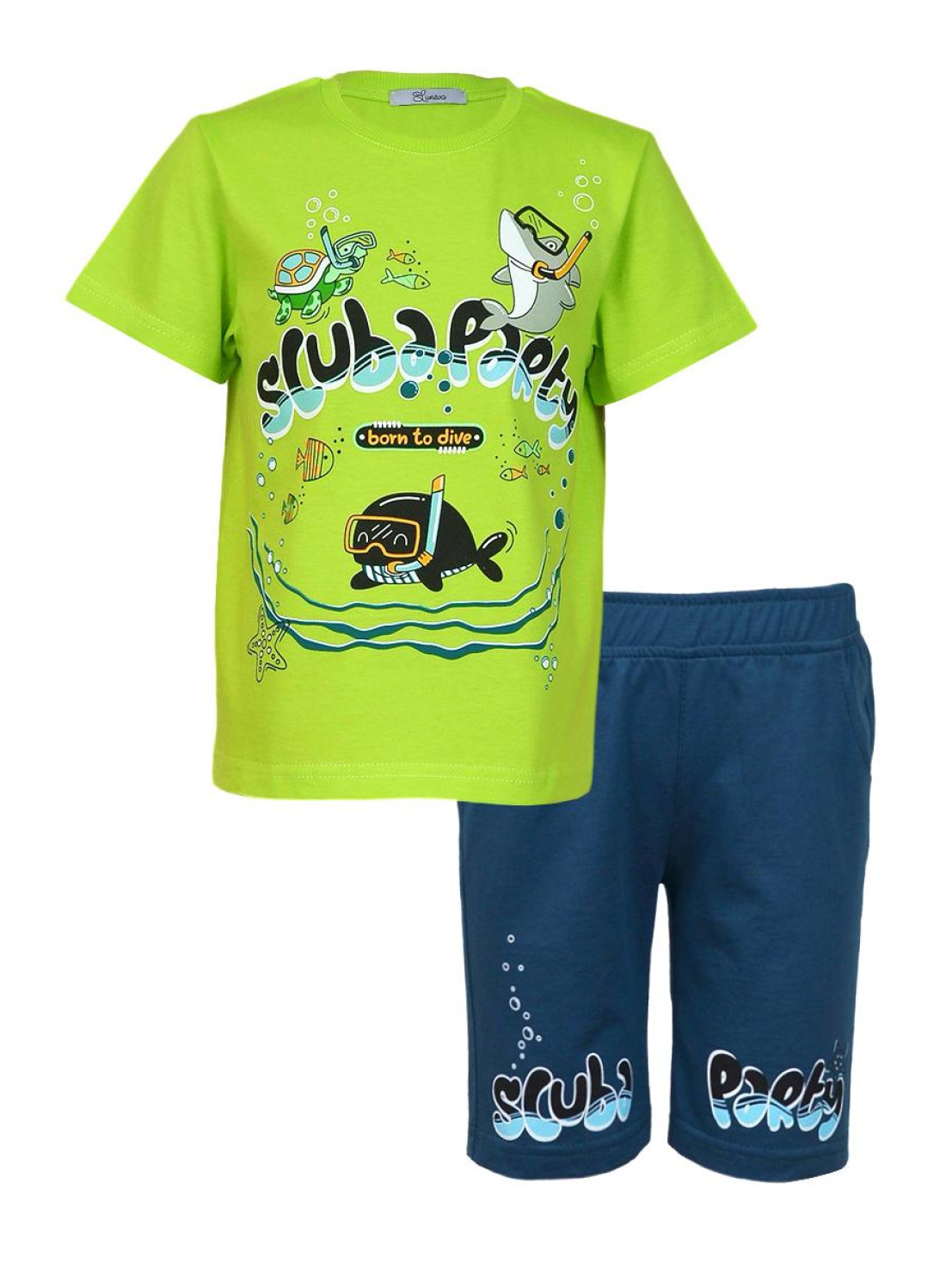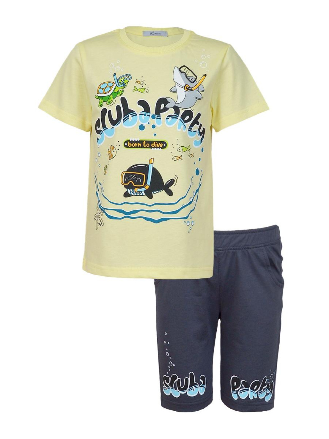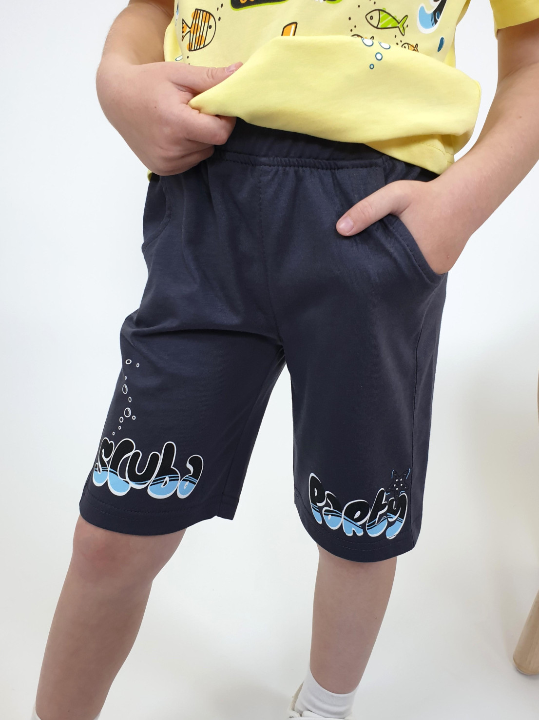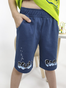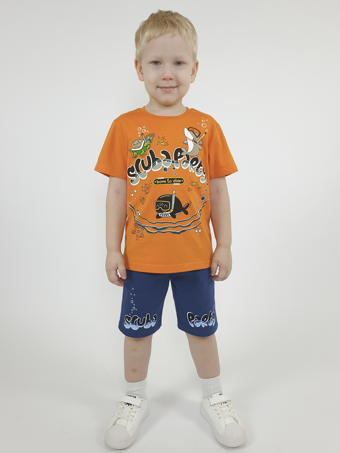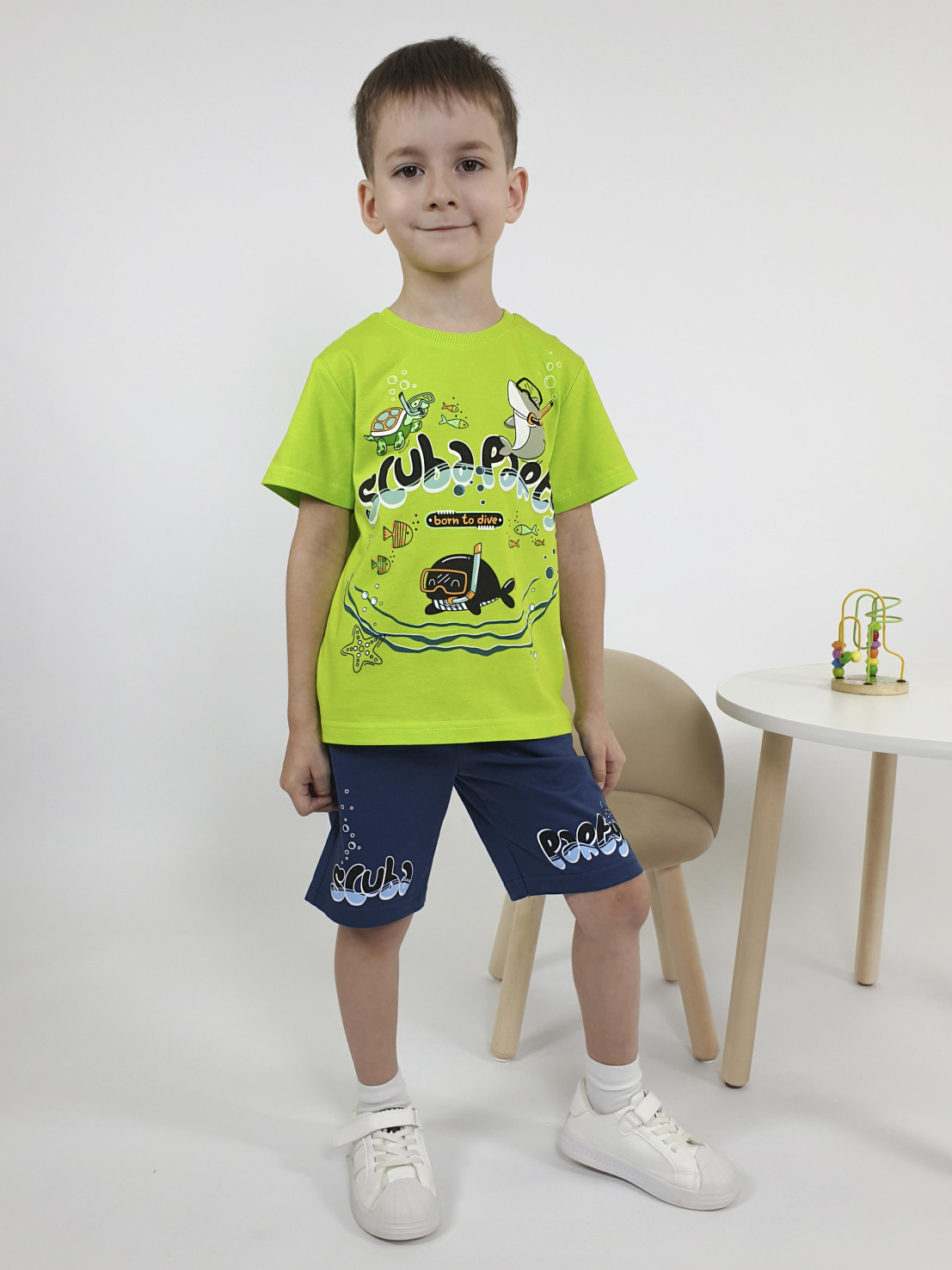 Кулирное полотно: 100% х/б. Фуфайка-прямая,перед с печатью.Рукав втачной,короткий.Горловина обработана ластиком. Шорты-укороченные с притачным поясом и резинкой.Два боковых кармана по переду.Печать на передних половинках внизу.