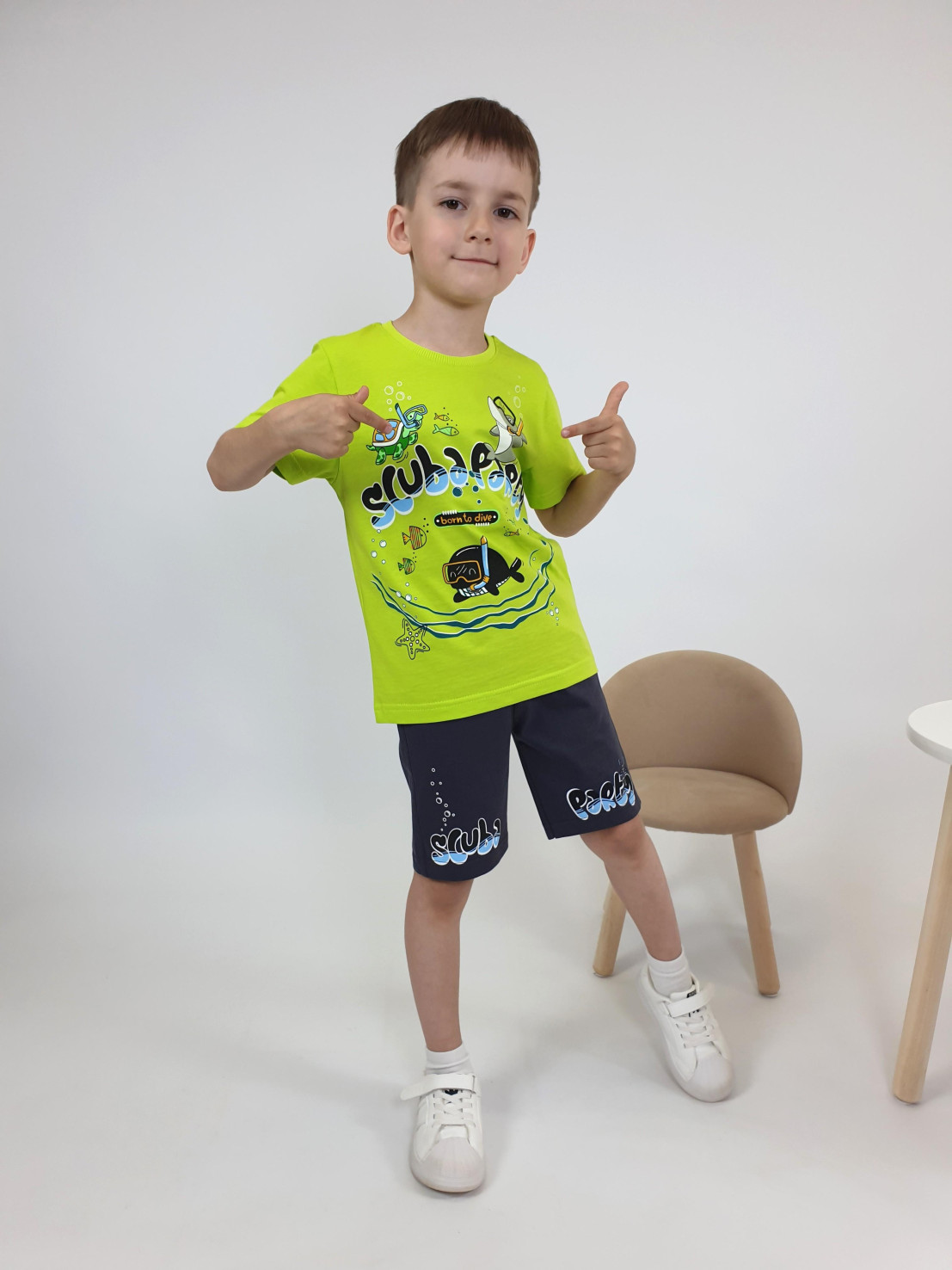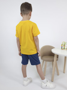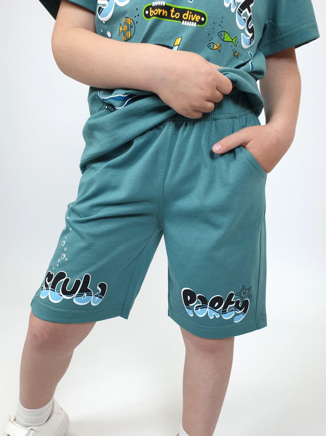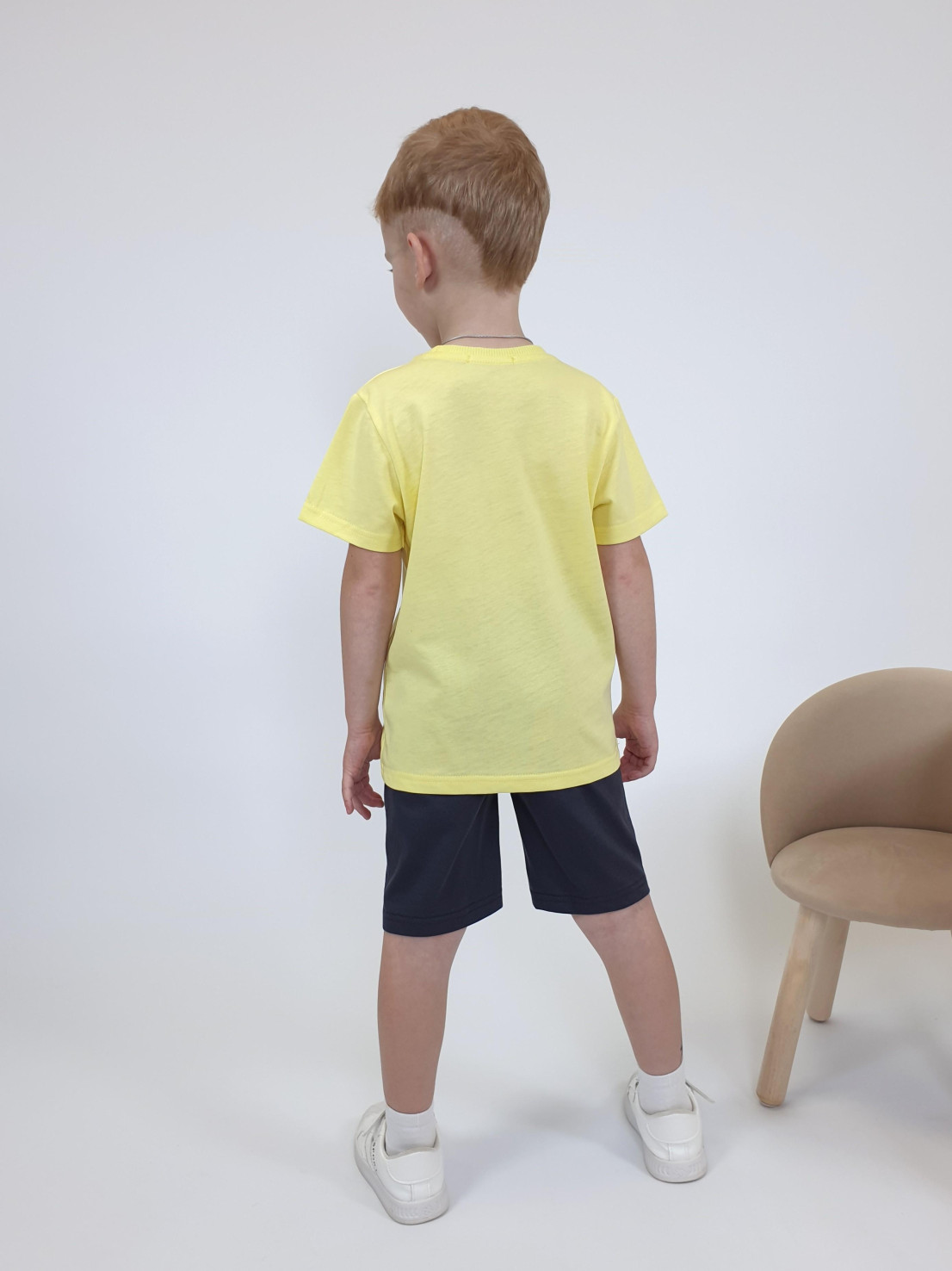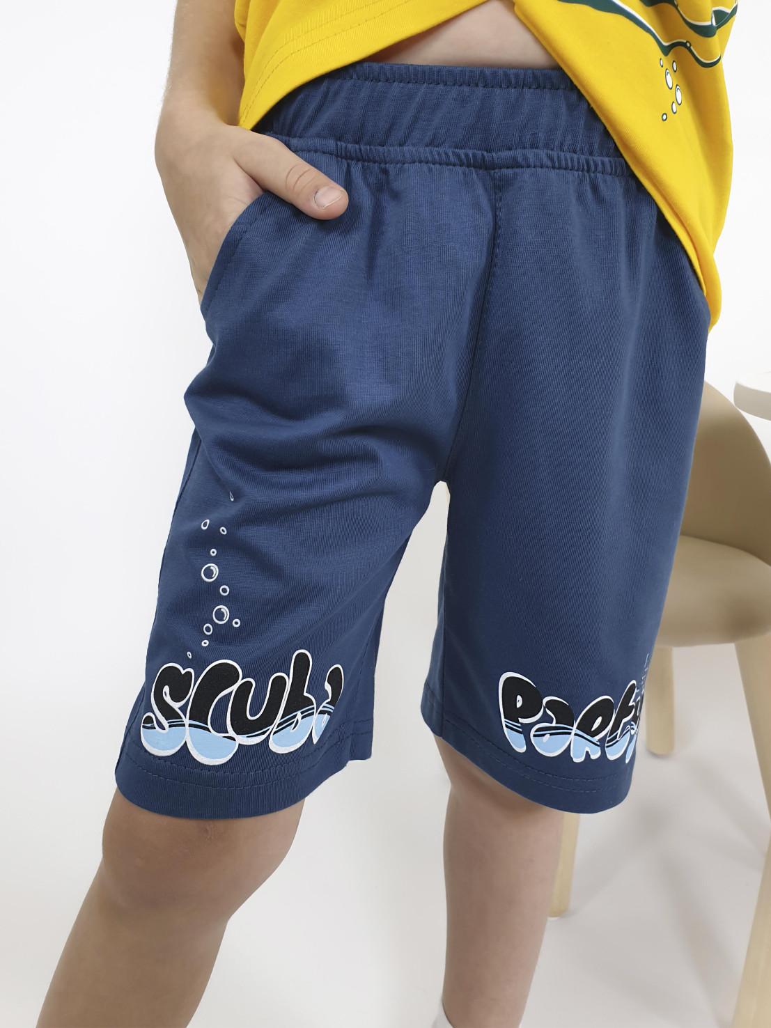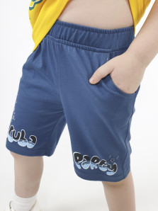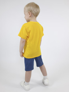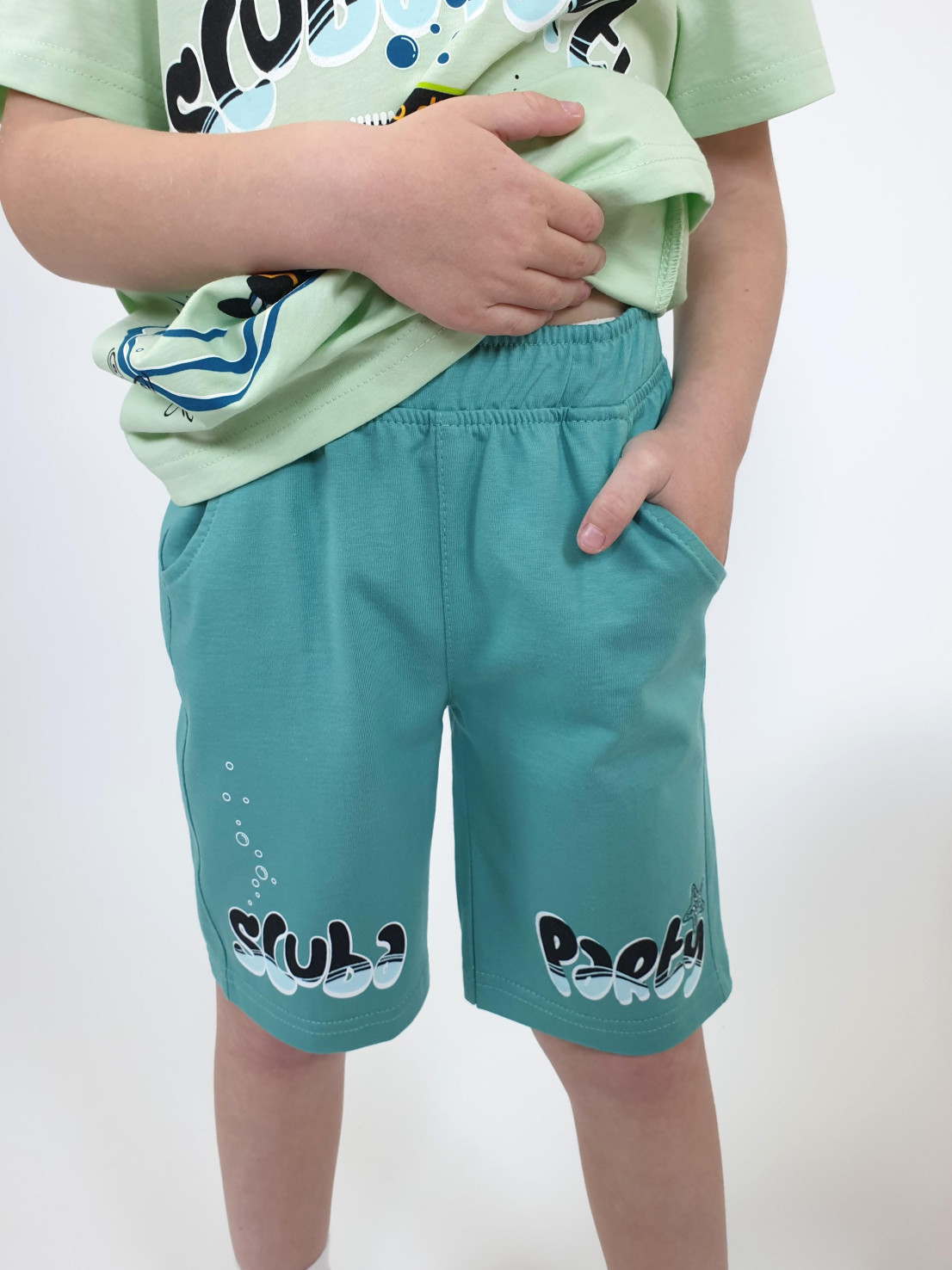 Кулирное полотно: 100% х/б. Фуфайка-прямая,перед с печатью.Рукав втачной,короткий.Горловина обработана ластиком. Шорты-укороченные с притачным поясом и резинкой.Два боковых кармана по переду.Печать на передних половинках внизу.
