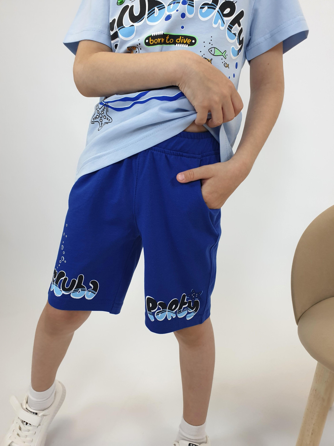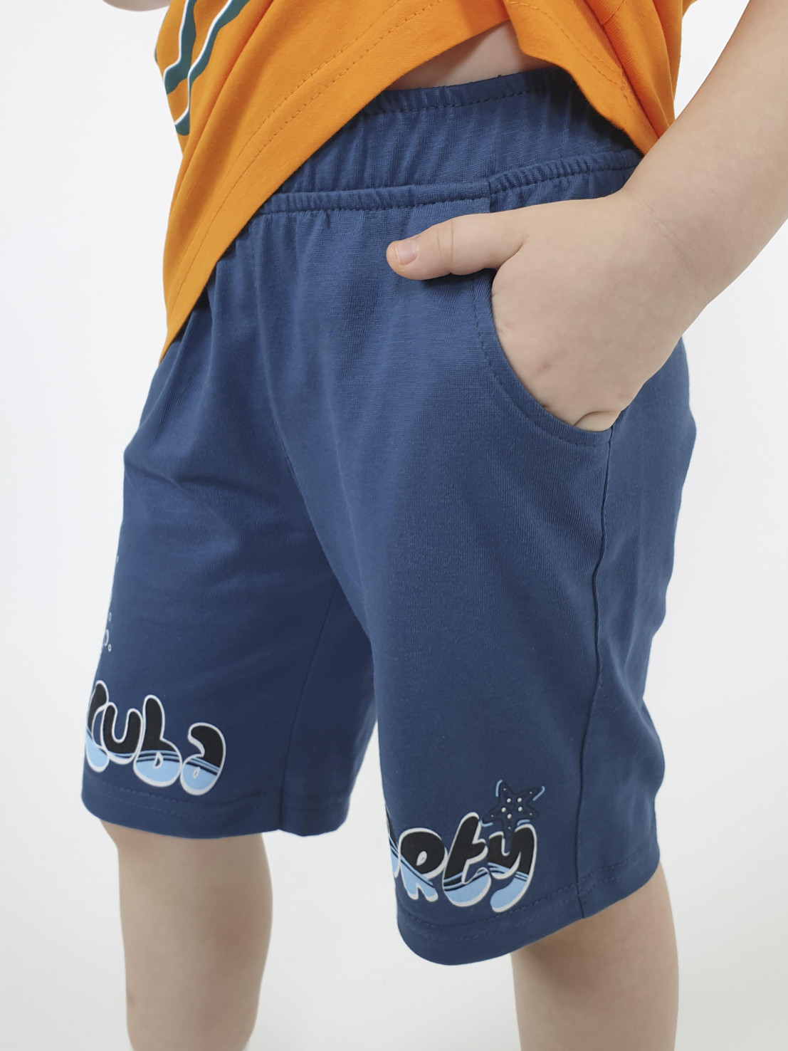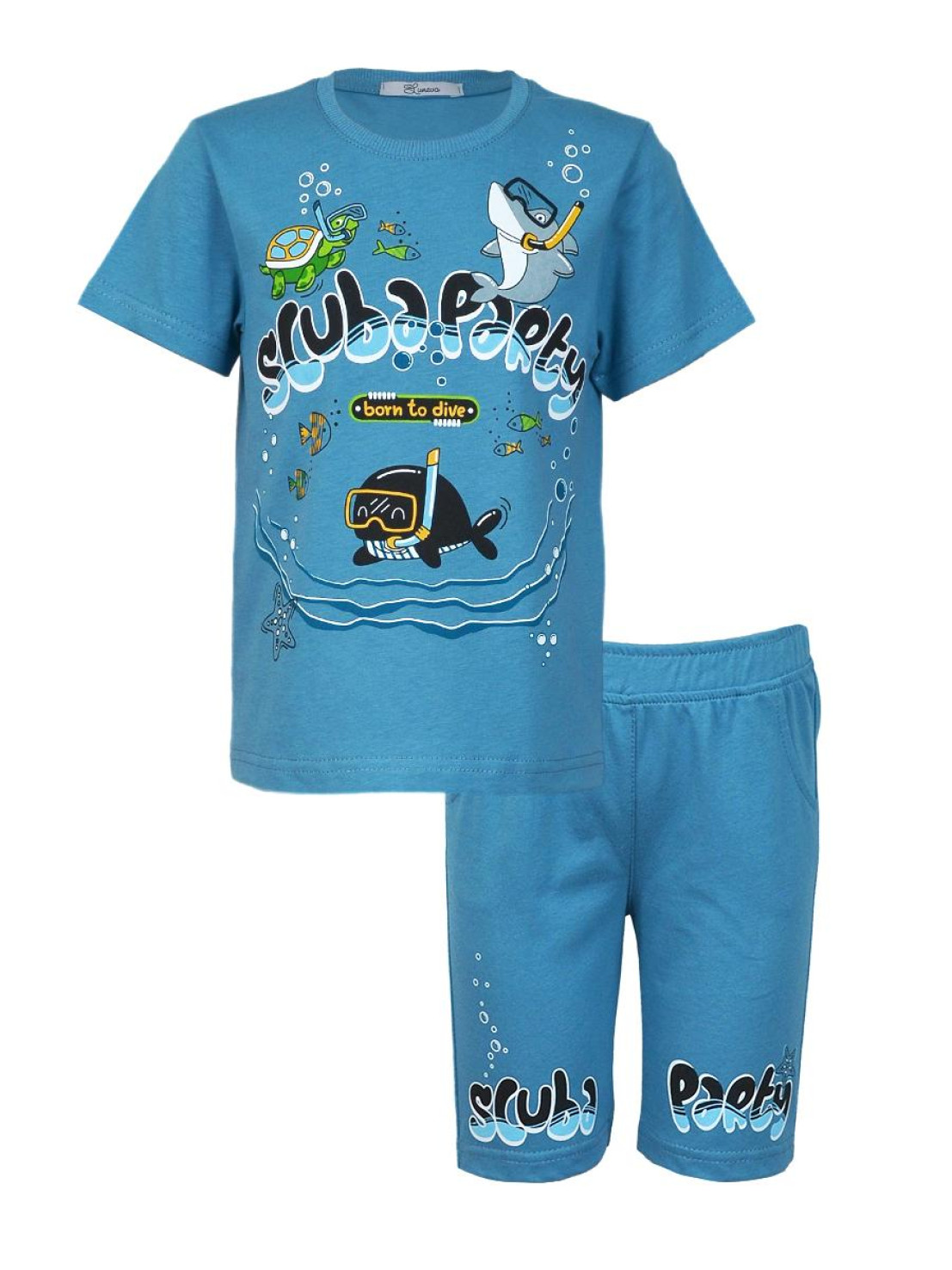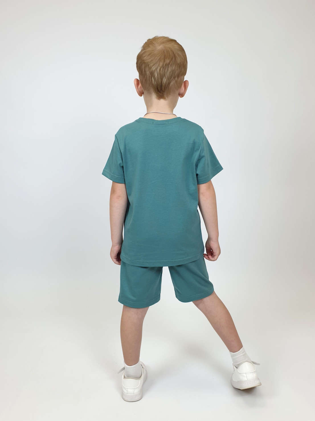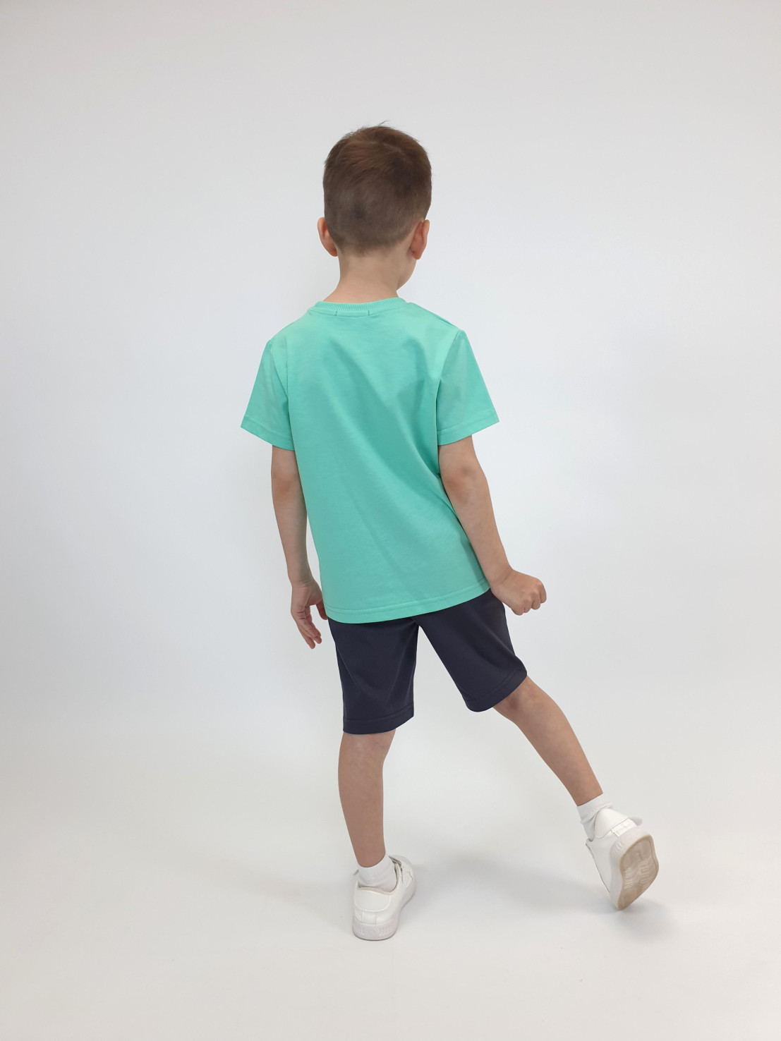 Кулирное полотно: 100% х/б. Фуфайка-прямая,перед с печатью.Рукав втачной,короткий.Горловина обработана ластиком. Шорты-укороченные с притачным поясом и резинкой.Два боковых кармана по переду.Печать на передних половинках внизу.