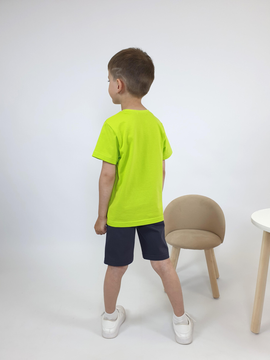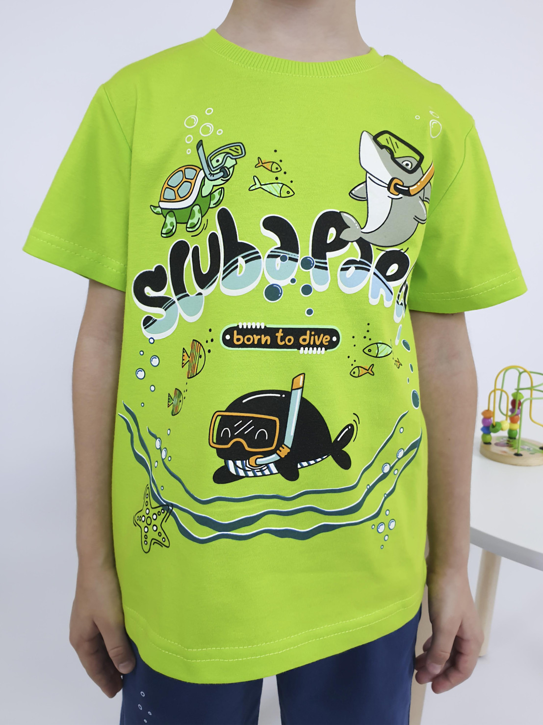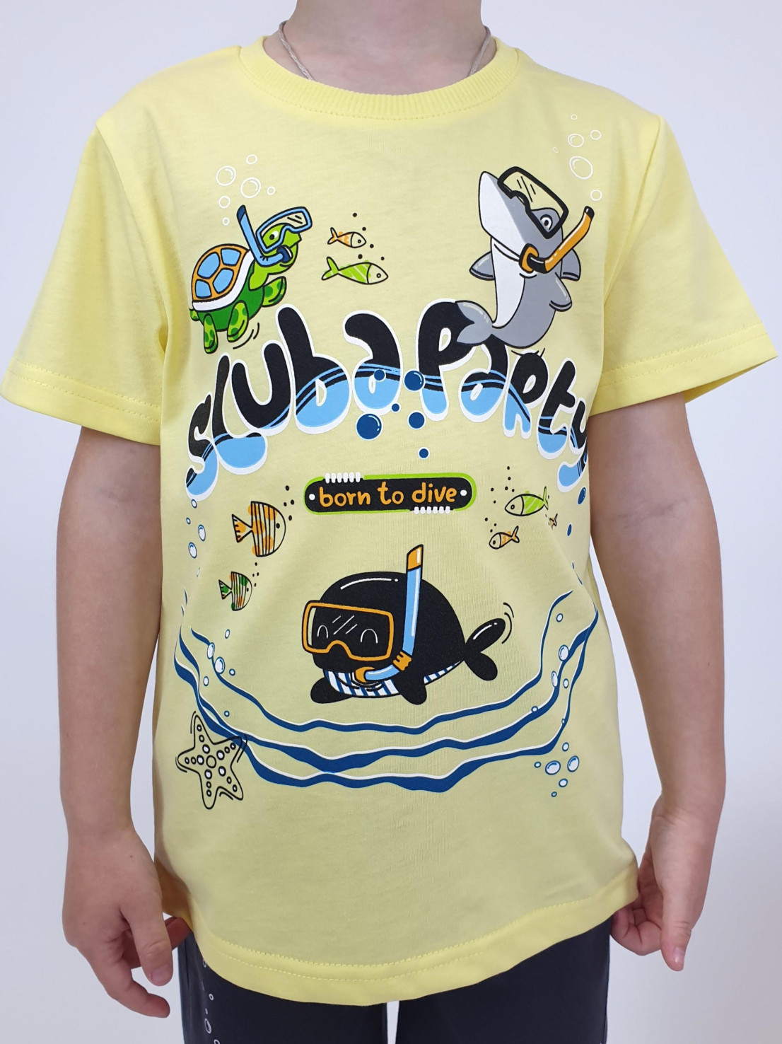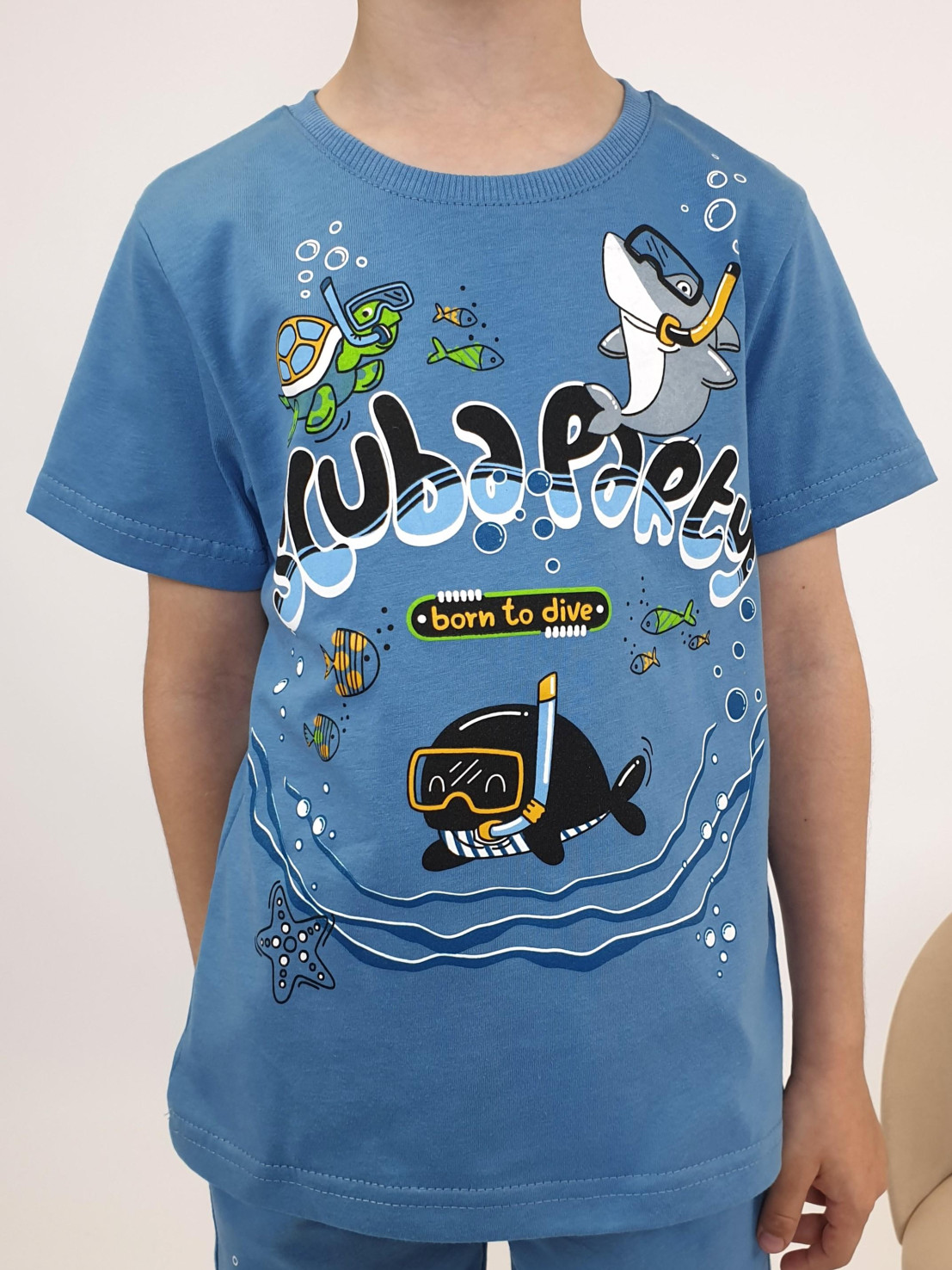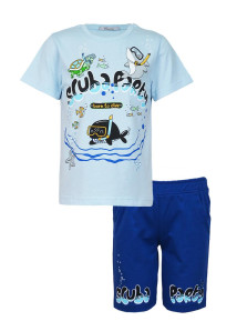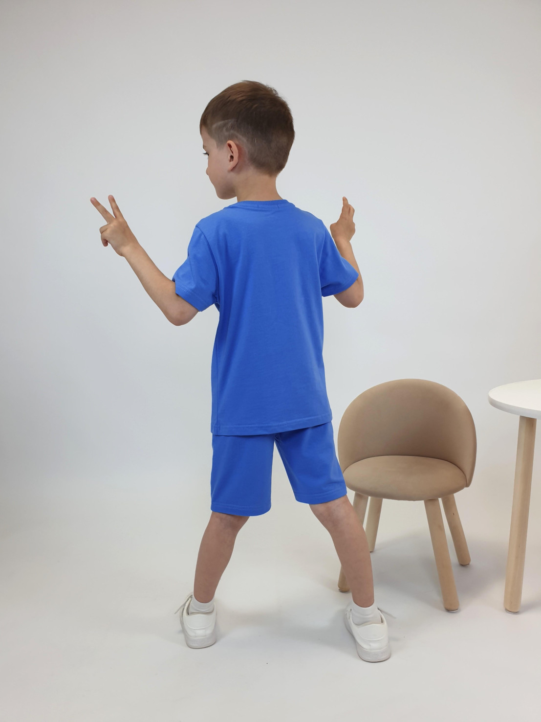 Кулирное полотно: 100% х/б. Фуфайка-прямая,перед с печатью.Рукав втачной,короткий.Горловина обработана ластиком. Шорты-укороченные с притачным поясом и резинкой.Два боковых кармана по переду.Печать на передних половинках внизу.