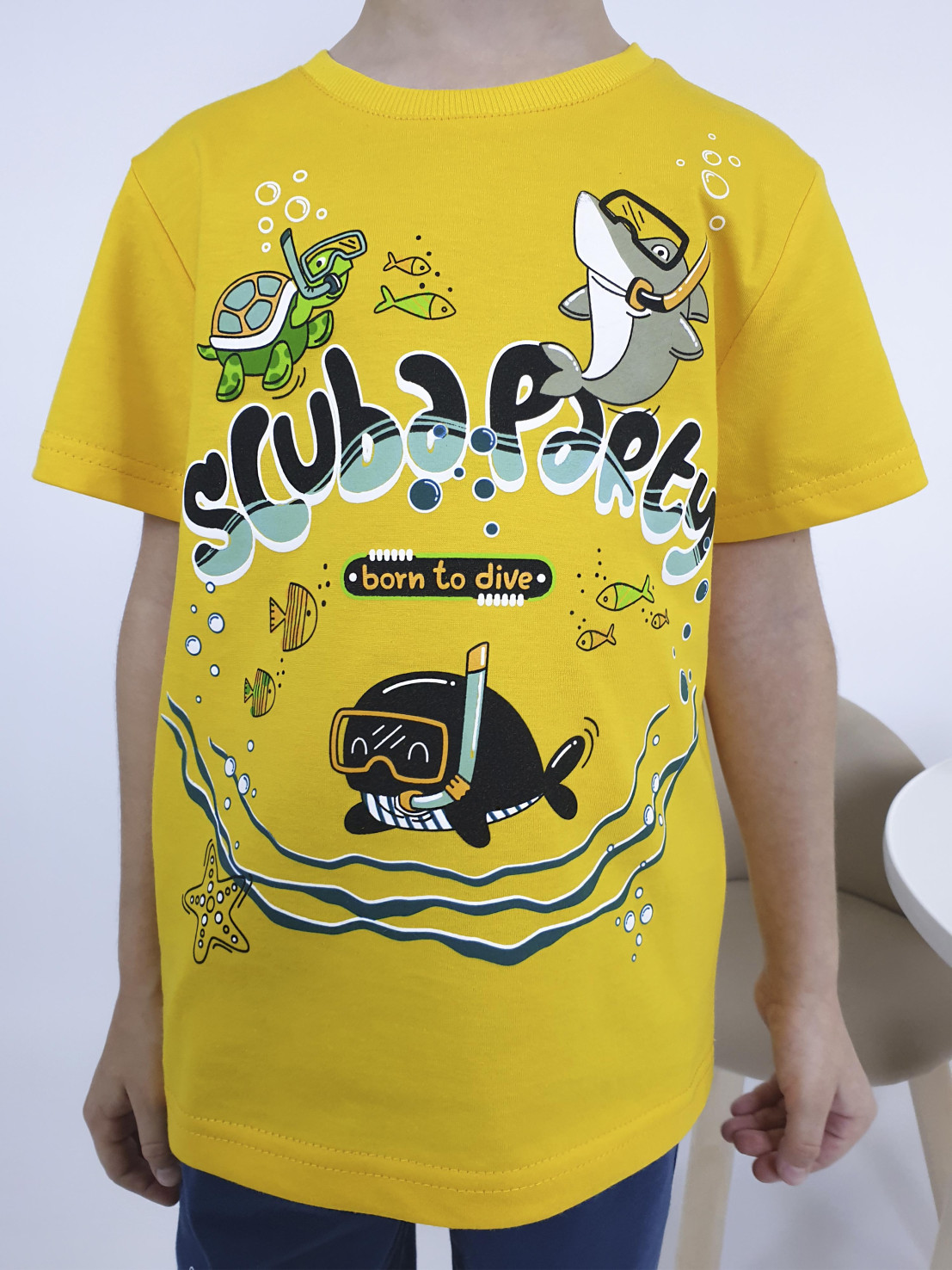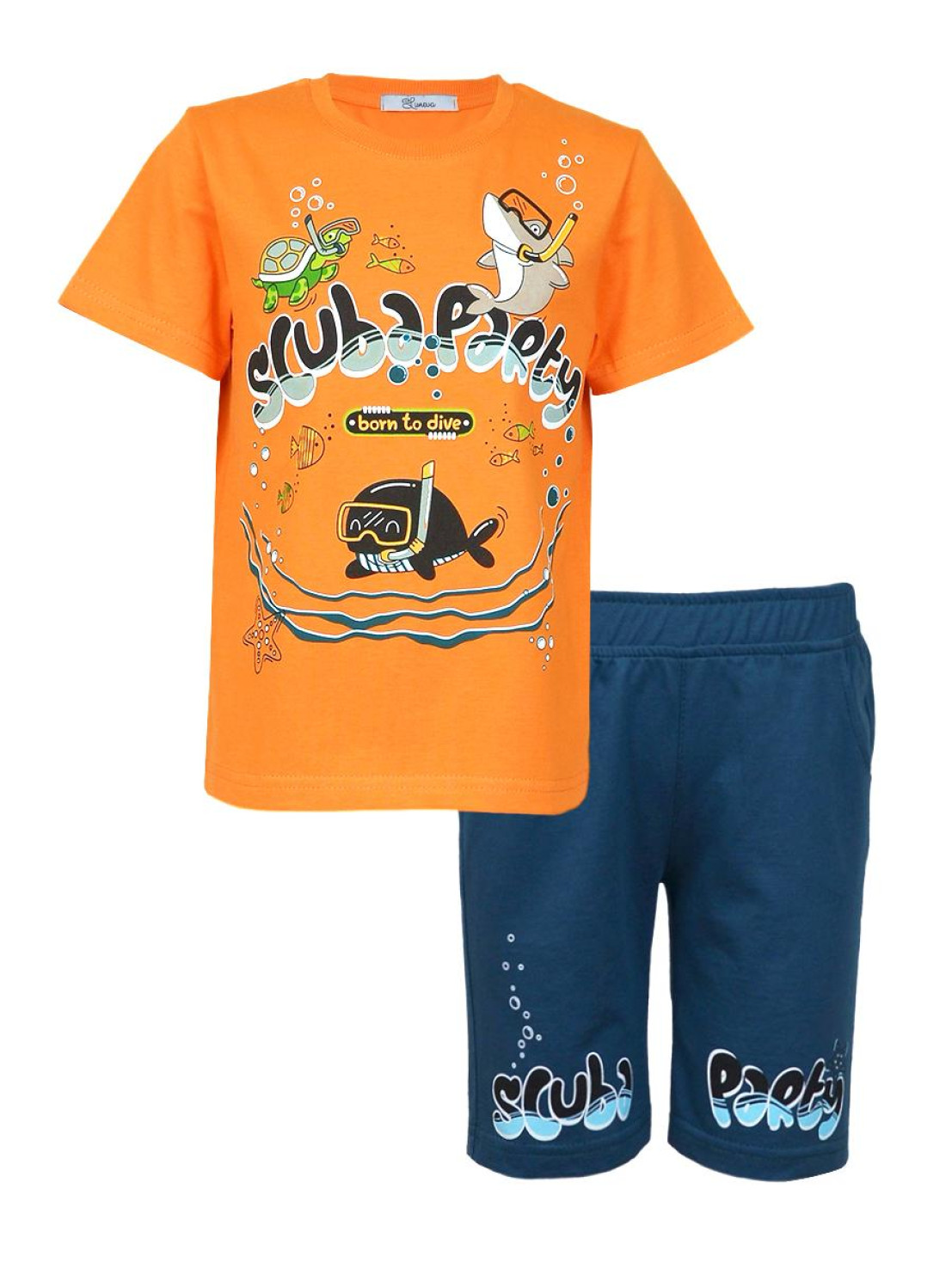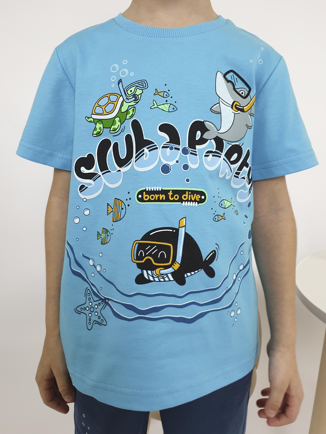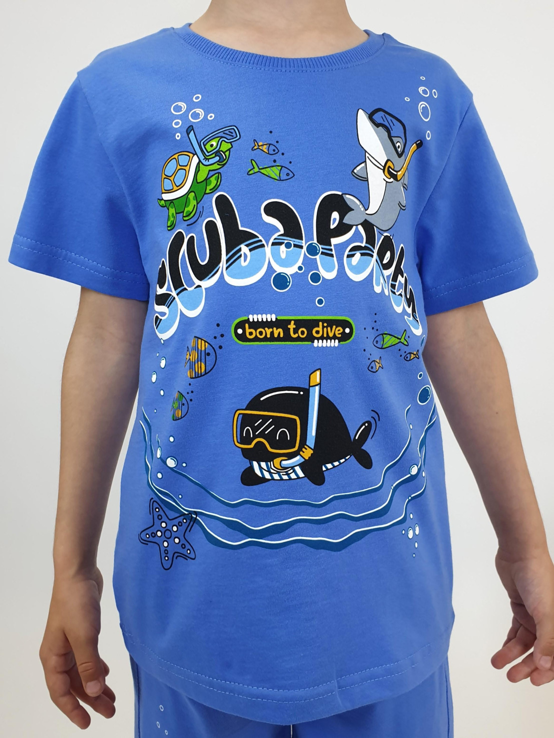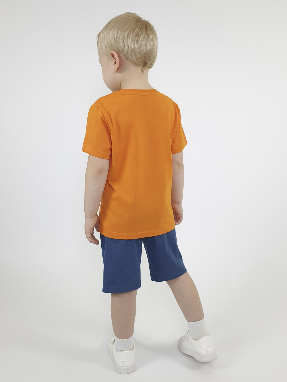 Кулирное полотно: 100% х/б. Фуфайка-прямая,перед с печатью.Рукав втачной,короткий.Горловина обработана ластиком. Шорты-укороченные с притачным поясом и резинкой.Два боковых кармана по переду.Печать на передних половинках внизу.